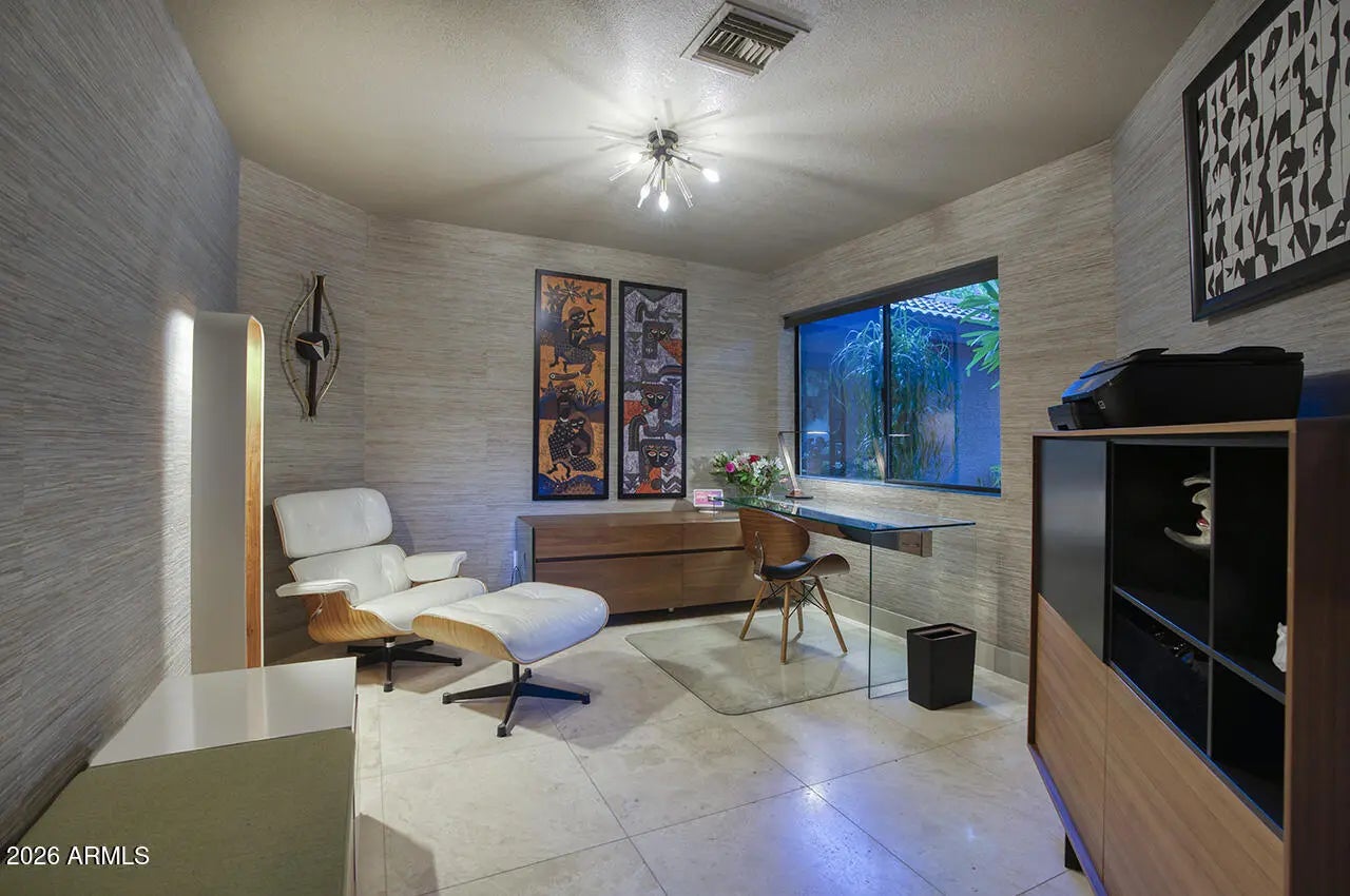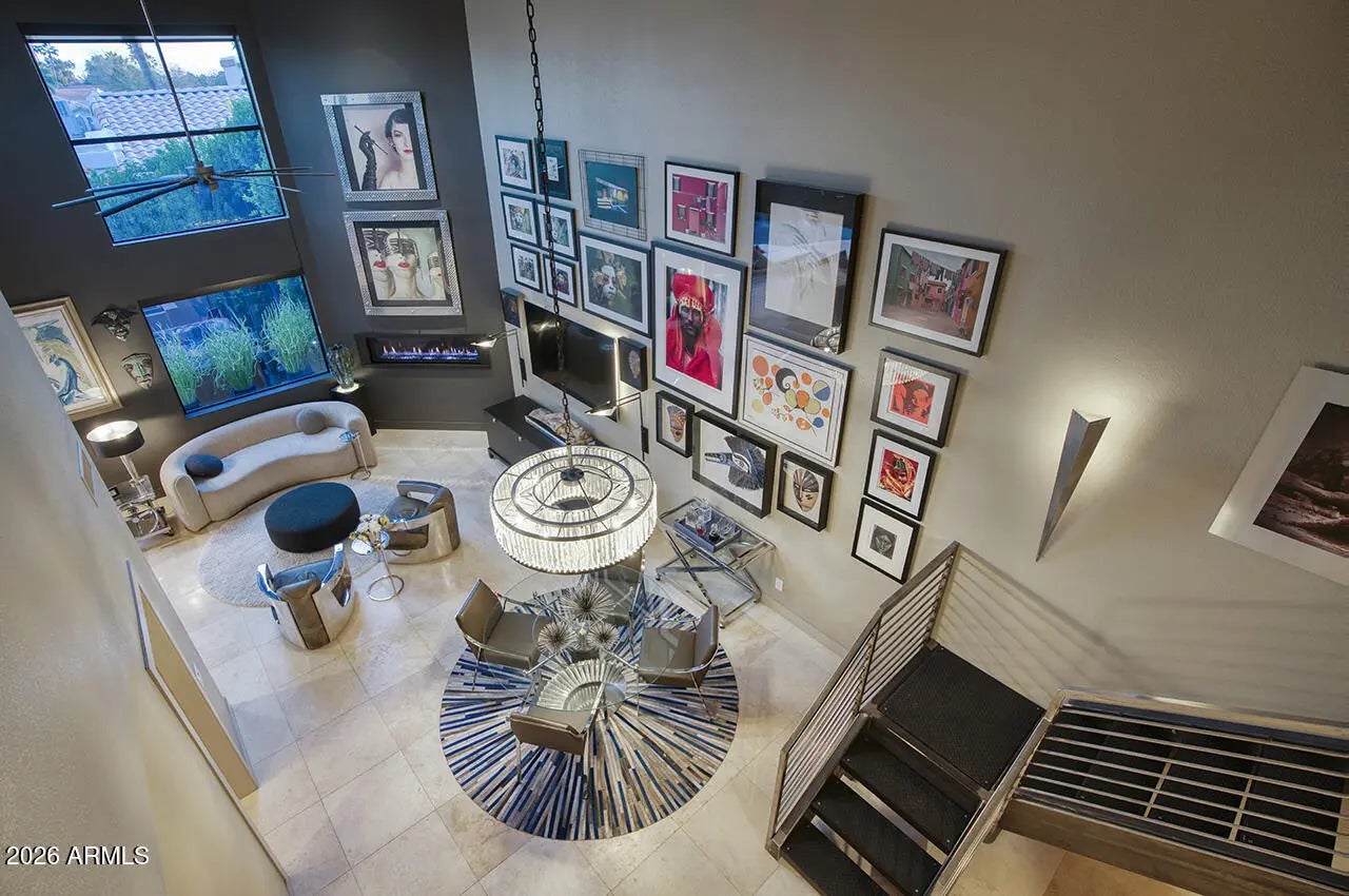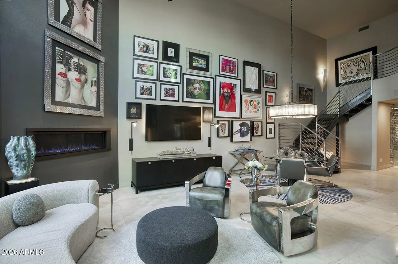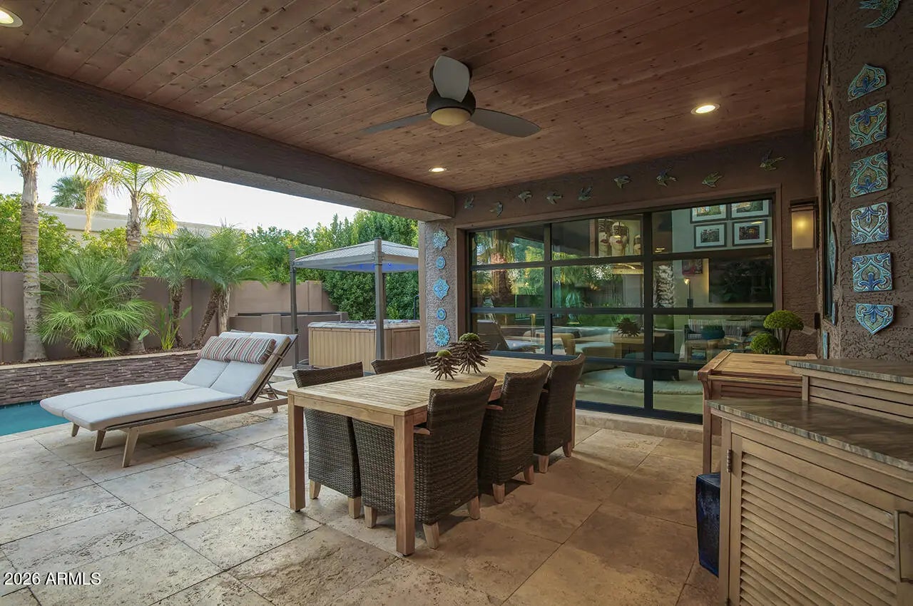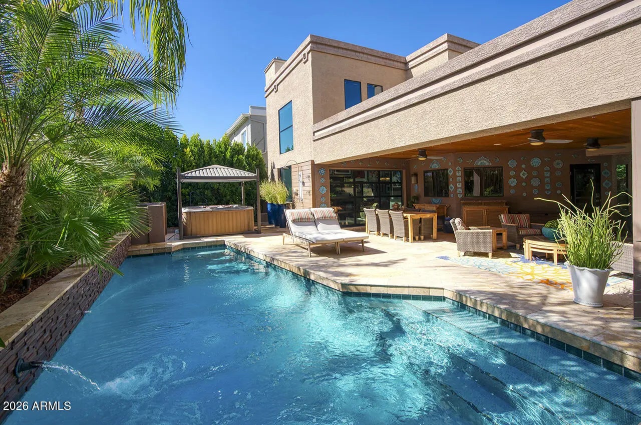 An exceptional designer-owned opportunity in a prime North Scottsdale location, this fully renovated courtyard-entry residence is set within a highly desirable community offering both tranquility and convenience. Thoughtfully reimagined the home delivers refined modern living in a coveted setting. A lush, serene courtyard welcomes you into an interior defined by curated finishes and intentional design throughout. The light-filled family room features a sleek linear gas fireplace, distinctive lighting, and seamless indoor-outdoor connection. An industrial-style garage door opens the living space to the expansive covered patio, creating an effortless Arizona indoor-outdoor lifestyle ideal for both everyday living and entertaining. The kitchen is a striking design centerpiece, showcasing sleek flat-panel cabinetry, glass display cabinets, and full-height vertical tile walls that add architectural interest. A Verona Italian dual-fuel range with double ovens and a five-burner gas cooktop anchors the space, delivering both performance and visual appeal. Designed with entertaining in mind, the home also features a dramatic 300-bottle refrigerated wine wall, offering a refined statement element that complements the home's modern aesthetic and elevated lifestyle. Upstairs, the private primary suite serves as a serene retreat, complete with a sitting area and spa-inspired bath featuring an oversized glass-enclosed shower, dual vanities, and an extensive wardrobe closet designed for both style and organization. Outdoors, the private backyard sanctuary has been designed for year-round enjoyment. An expansive covered patio with tongue-and-groove ceiling, misters, and a custom outdoor kitchen overlooks a tranquil setting complete with a saltwater pool, fire pit, and covered above-ground spa. Thoughtful orientation allows for enjoyment of morning sun and relaxing afternoons, while mature landscaping enhances privacy and creates a true resort-style atmosphere. Beautifully remodeled, designer-owned, and ideally located, this North Scottsdale residence presents a rare opportunity to enjoy modern luxury, seamless indoor-outdoor living, and a lifestyle that is both elevated and effortless.