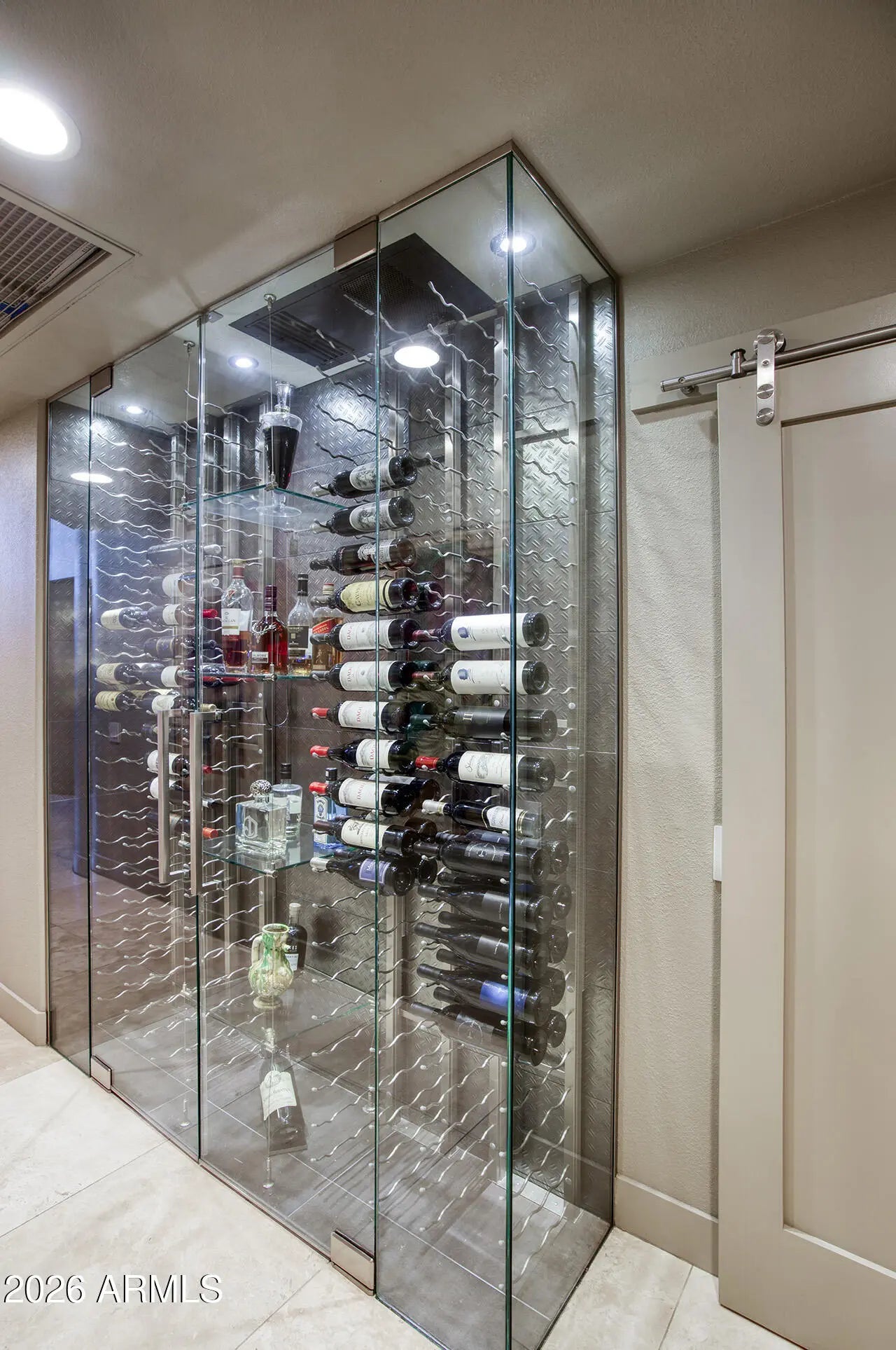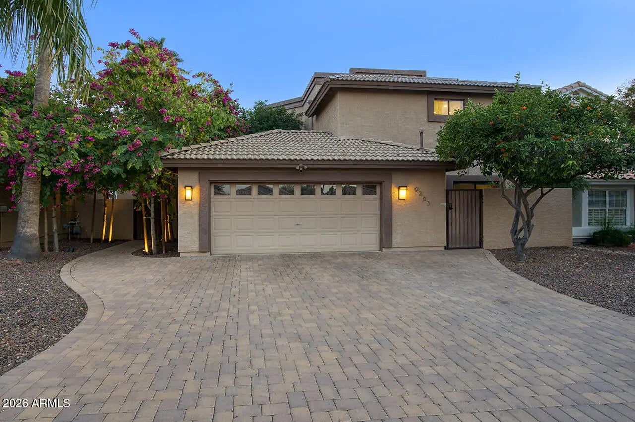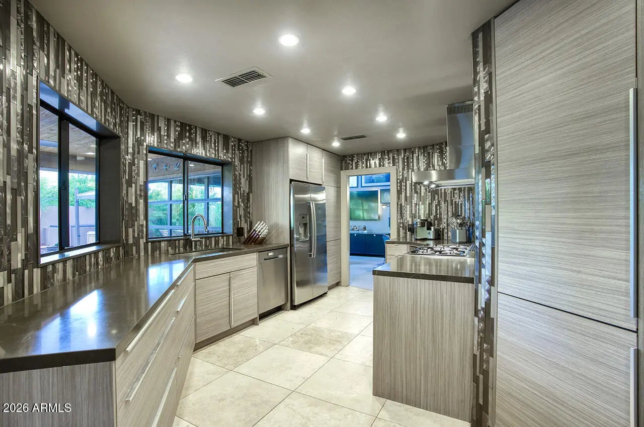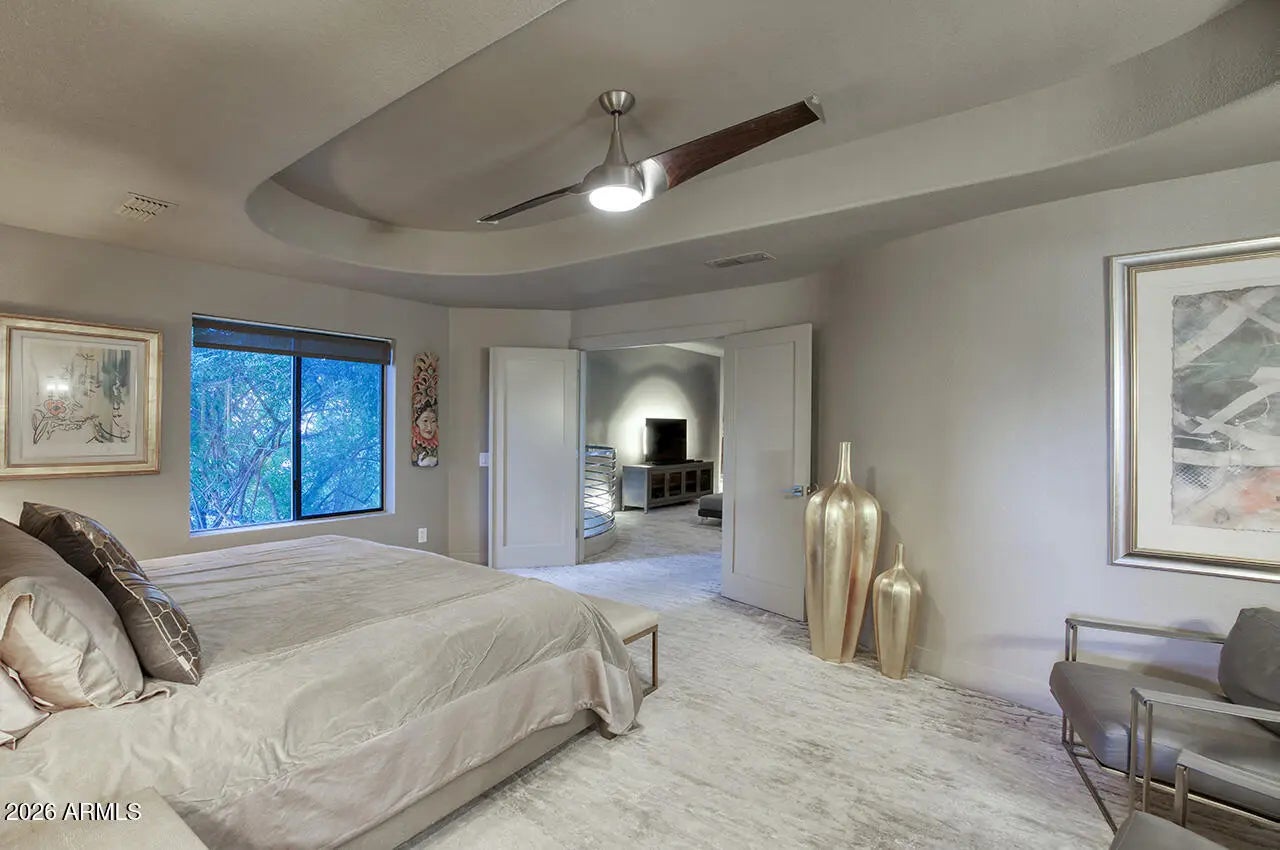 An exceptional designer-owned opportunity in a prime North Scottsdale location, this fully renovated courtyard-entry residence is set within a highly desirable community offering both tranquility and convenience. Thoughtfully reimagined the home delivers refined modern living in a coveted setting. A lush, serene courtyard welcomes you into an interior defined by curated finishes and intentional design throughout. The light-filled family room features a sleek linear gas fireplace, distinctive lighting, and seamless indoor-outdoor connection. An industrial-style garage door opens the living space to the expansive covered patio, creating an effortless Arizona indoor-outdoor lifestyle ideal for both everyday living and entertaining. The kitchen is a striking design centerpiece, showcasing sleek flat-panel cabinetry, glass display cabinets, and full-height vertical tile walls that add architectural interest. A Verona Italian dual-fuel range with double ovens and a five-burner gas cooktop anchors the space, delivering both performance and visual appeal. Designed with entertaining in mind, the home also features a dramatic 300-bottle refrigerated wine wall, offering a refined statement element that complements the home's modern aesthetic and elevated lifestyle. Upstairs, the private primary suite serves as a serene retreat, complete with a sitting area and spa-inspired bath featuring an oversized glass-enclosed shower, dual vanities, and an extensive wardrobe closet designed for both style and organization. Outdoors, the private backyard sanctuary has been designed for year-round enjoyment. An expansive covered patio with tongue-and-groove ceiling, misters, and a custom outdoor kitchen overlooks a tranquil setting complete with a saltwater pool, fire pit, and covered above-ground spa. Thoughtful orientation allows for enjoyment of morning sun and relaxing afternoons, while mature landscaping enhances privacy and creates a true resort-style atmosphere. Beautifully remodeled, designer-owned, and ideally located, this North Scottsdale residence presents a rare opportunity to enjoy modern luxury, seamless indoor-outdoor living, and a lifestyle that is both elevated and effortless.
