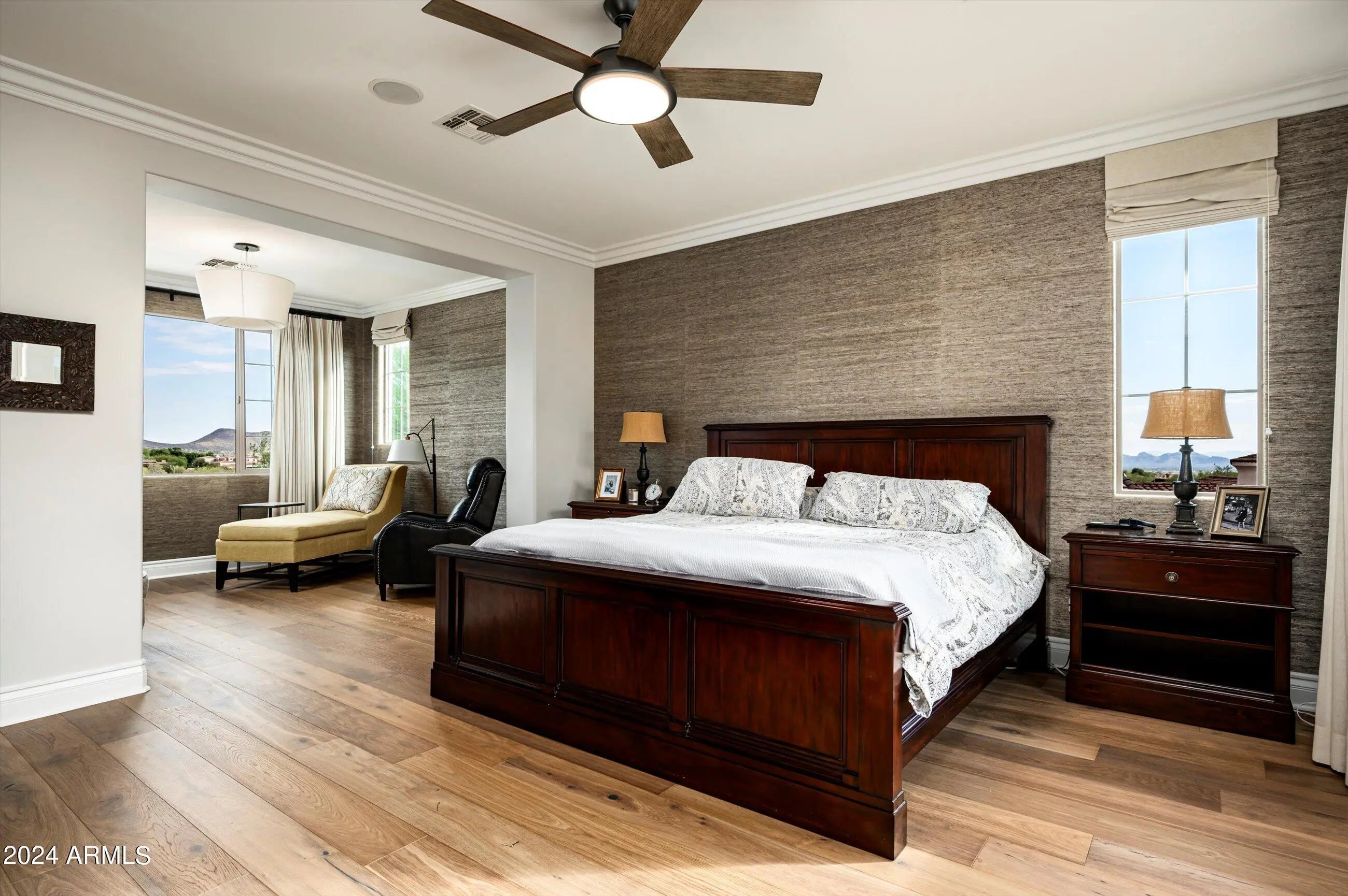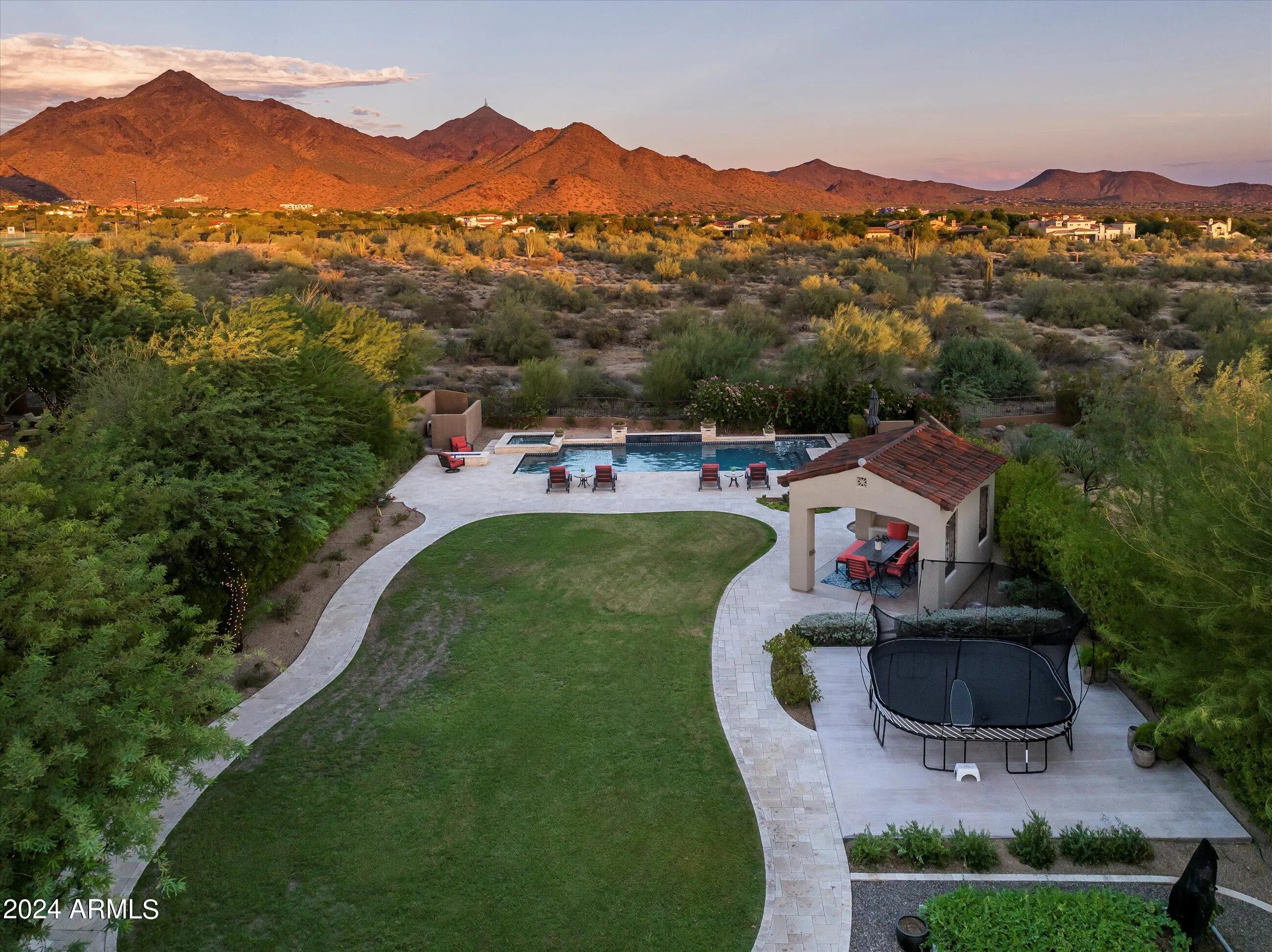 Highly sought after, gated DC Ranch Hacienda on one of a kind, oversized lot is tucked on an exterior cul de sac street with amazing curb appeal, faces open preserve and backs to natural area with picturesque McDowell mountains. Capture serene mountain and city light views from multiple areas of the home. Desirable great room home plan features 5 bedrooms, 4 baths, downstairs office and plus an upstairs office/den with wine fridge bar, and an expansive flex bonus room upstairs, with charming interior courtyard for entertaining. Enjoy seamless indoor/outdoor AZ living with a telescoping glass door from great room to picture perfect resort style backyard with scenic mountain backdrop, featuring oversized grassy area plus garden planters, outdoor covered ramada adjacent to generous heated pool and spa, and linear firepit, built-in BBQ with seating, covered patio, with ample hardscape space for seating/lounging. Stunning designer finishes including oak hardwood flooring throughout the home, light and bright oversized eat-in kitchen island, chic statement vent over gas range overlooking backyard, refined marble and tile selections throughout for a polished sophisticated appeal. Breathtaking views from second level primary suite with sitting area overlooking majestic McDowell Mountains, enjoy generous wardrobe, and spa like bath with freestanding bubble soaker tub. Convenient utility room with hall tree, three car tandem garage with cooling unit, plus spacious additional paved parking for four more cars. Quaint neighborhood park nearby. This showstopper is a unique opportunity in the coveted DC Ranch Haciendas.