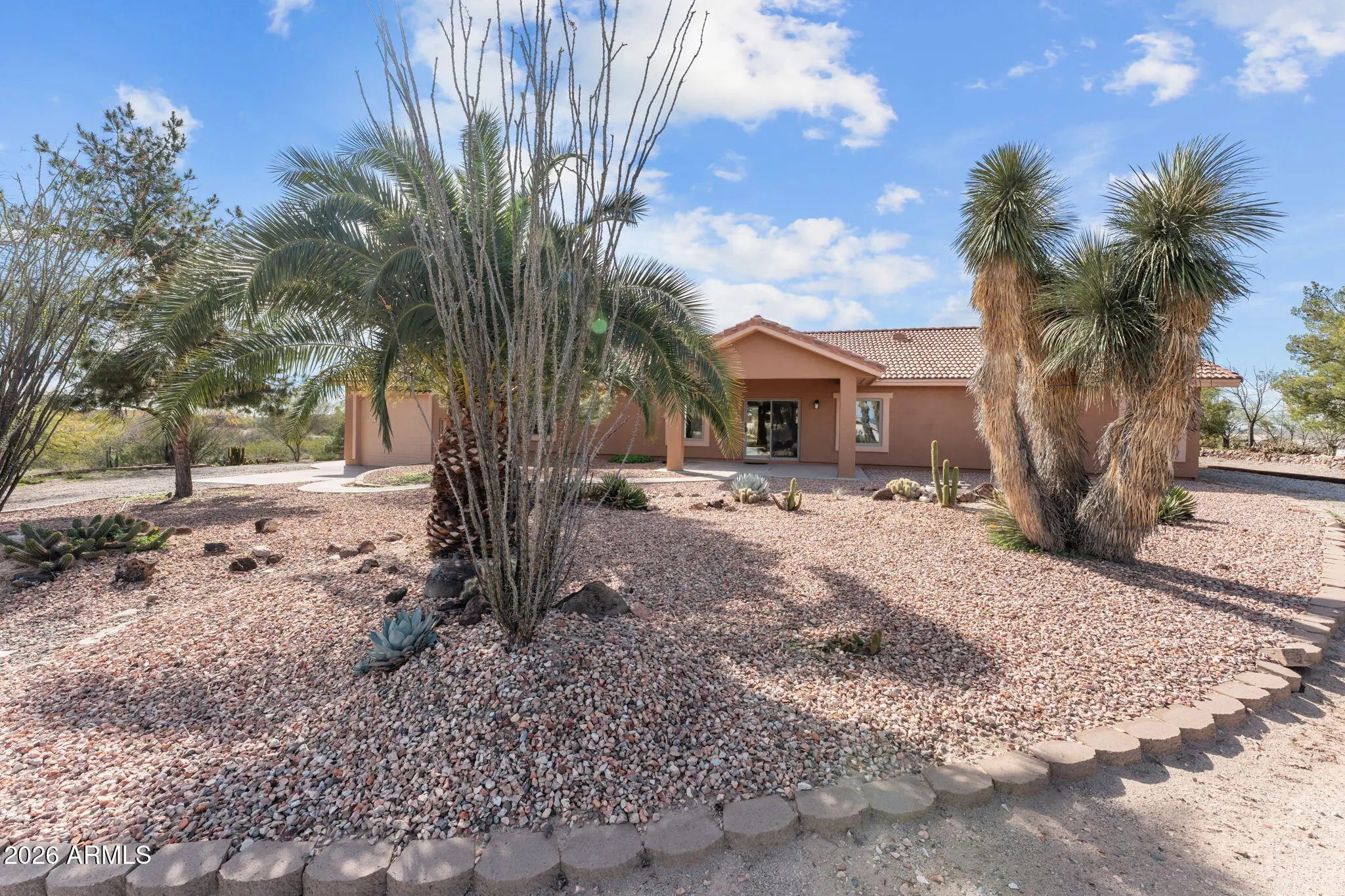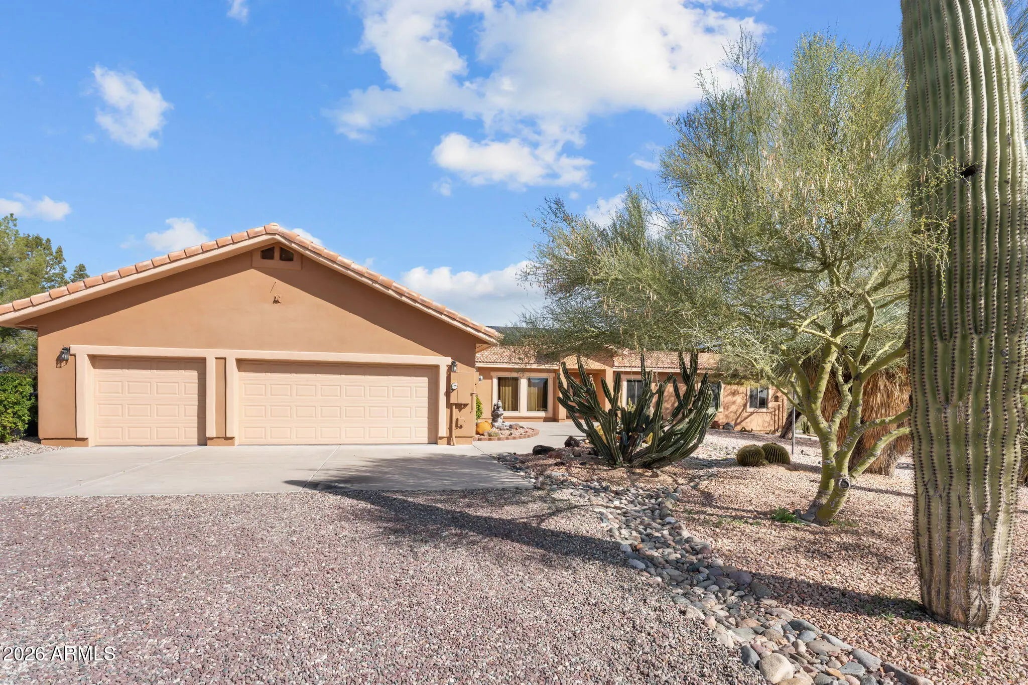 Welcome to this stunning Southwest-style retreat located in the peaceful community of Vista Royale. Situated on an expansive 2.66-acre lot, this beautifully designed 2,518-square-foot home offers the perfect blend of privacy, space, and timeless desert charm. Inside, you'll find 3 spacious bedrooms and 3 full bathrooms, thoughtfully laid out beneath soaring vaulted ceilings that enhance the home's open and airy feel. The inviting living room is anchored by a cozy fireplace, creating a warm focal point for gathering and relaxing. Rich wood cabinetry complements the updated stainless-steel appliances in the kitchen, offering both beauty and functionality for everyday living and entertaining. The generously sized primary suite serves as a private retreat, complete with a spacious en-suite bathroom featuring dual sinks, a separate soaking tub, and a walk-in shower. An oversized laundry room adds convenience and extra storage space. Energy efficiency meets practicality with owned solar panels, helping reduce utility costs while supporting sustainable living. Car enthusiasts and hobbyists will appreciate the two attached garages offering a total of six parking bays - ideal for vehicles, toys, or workshop space. Step outside to enjoy beautifully designed desert landscaping and multiple covered patios that provide the perfect setting for outdoor dining, sunset views, and peaceful Arizona evenings. This Vista Royale gem delivers Southwest character, modern comfort, and wide-open space - all in a tranquil setting you'll love coming home to.