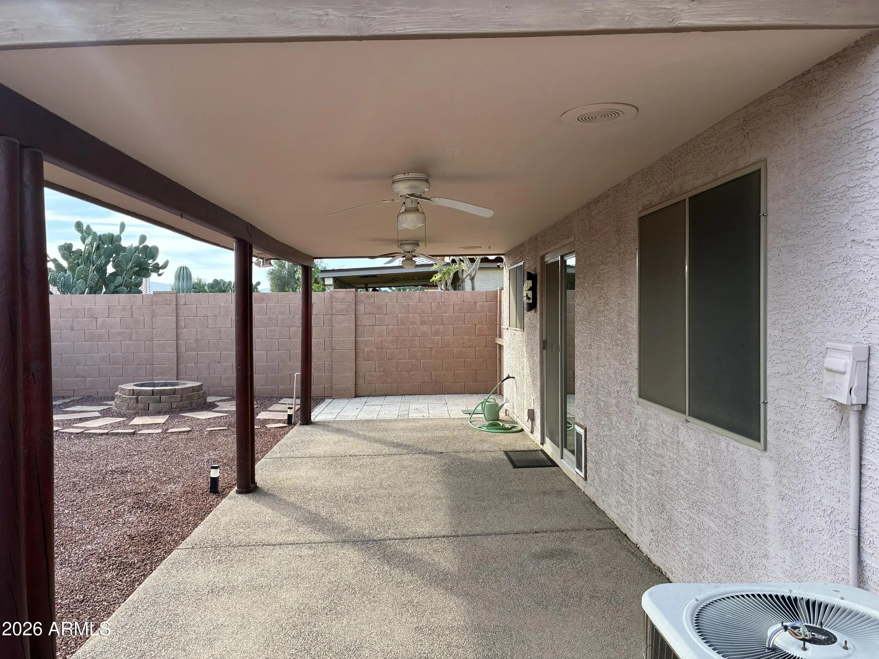 This 3 bed, 2 bath home offers a welcoming layout with an open great room, vaulted ceilings, and an eat in kitchen designed for everyday functionality. The home features tile flooring throughout, updated bathroom vanities and fixtures, and a primary bedroom with a private en- suite bath. The backyard includes a large, covered patio and a designated fire pit area, creating an attractive, outdoor space. Located near shopping, schools, and community amenities, this property is ready for its next resident.