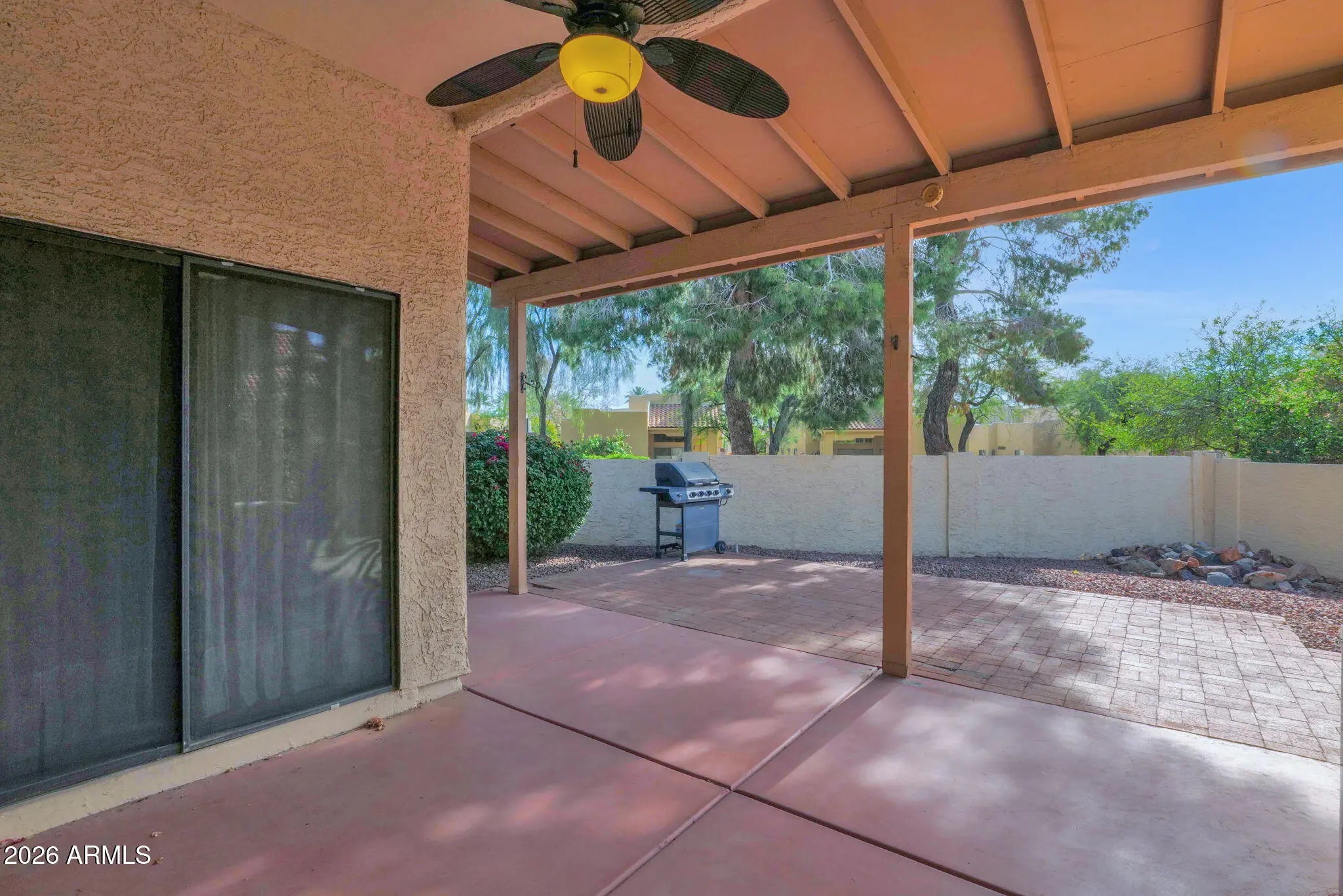Thoughtfully designed to provide flexibility and comfort, this beautifully maintained Scottsdale single-family home offers a functional layout ideal for both everyday living and entertaining. Soaring vaulted ceilings create a bright, open atmosphere from the moment you enter. The main living area features a cozy fireplace and French doors that open to a covered patio, creating a seamless indoor-outdoor connection. The eat-in kitchen is equipped with granite countertops, stainless steel appliances, a pantry, and generous cabinet space, balancing style and practicality. The bedrooms are thoughtfully positioned to enhance privacy and include direct access to patio areas, offering peaceful retreats throughout the home. The bathrooms have been tastefully updated with refined finishes and clean detailing. Surrounded by mature landscaping, the property is well suited for those seeking privacy and serenity in a tranquil setting. Additional highlights include a two-car garage with built-in cabinetry for exceptional storage and owned solar panels for enhanced energy efficiency and long-term savings. Residents also enjoy access to community amenities, including a pool, spa, and tennis courts, completing this exceptional Scottsdale living experience.