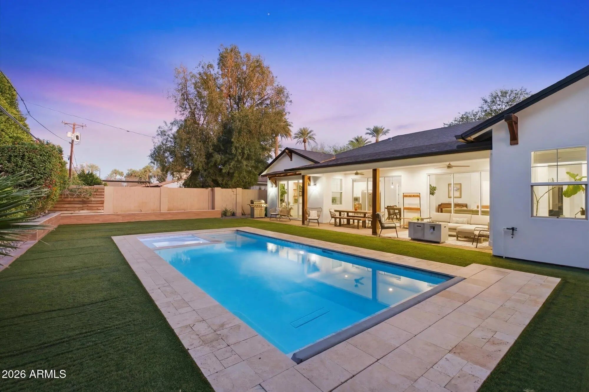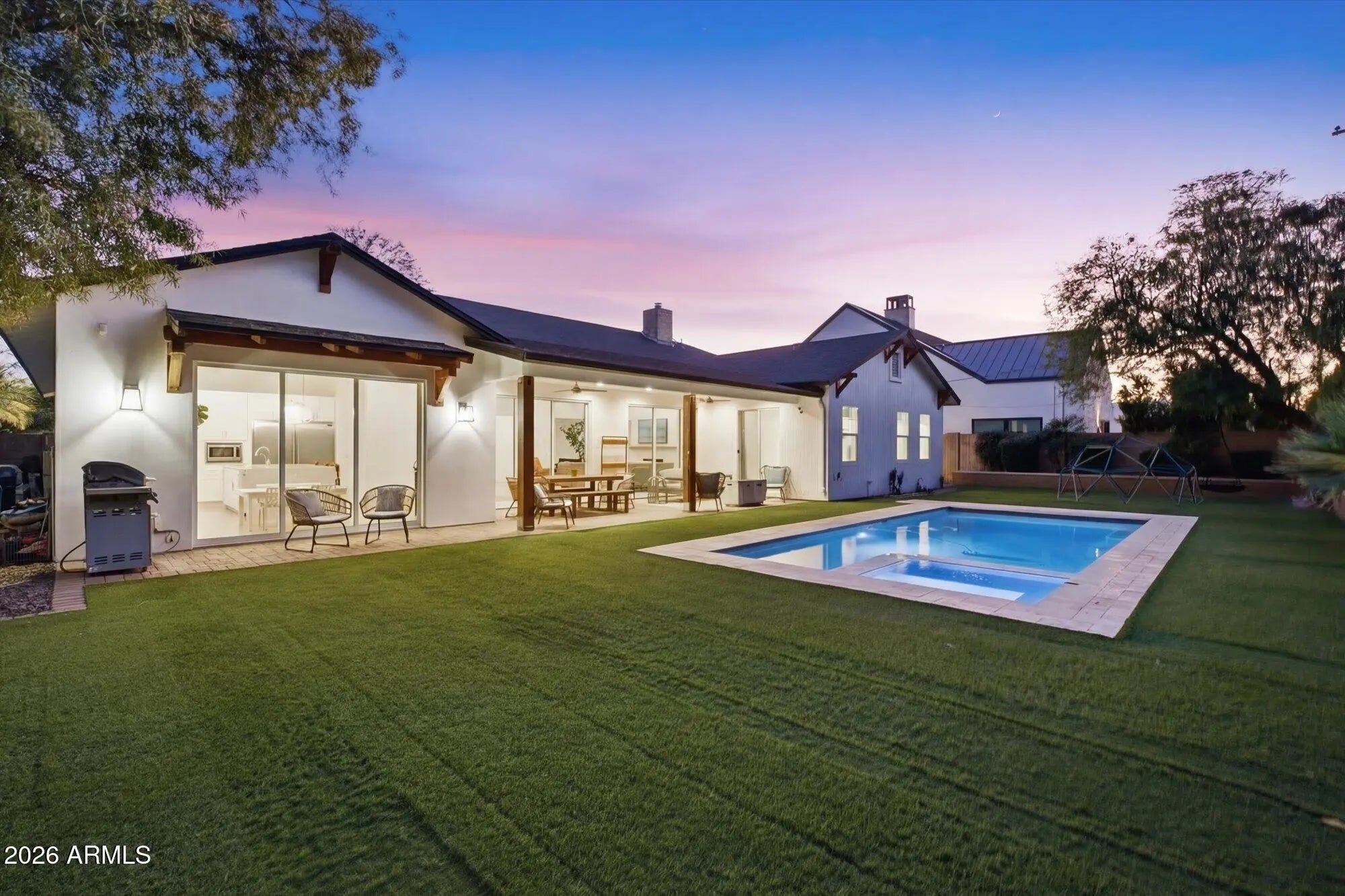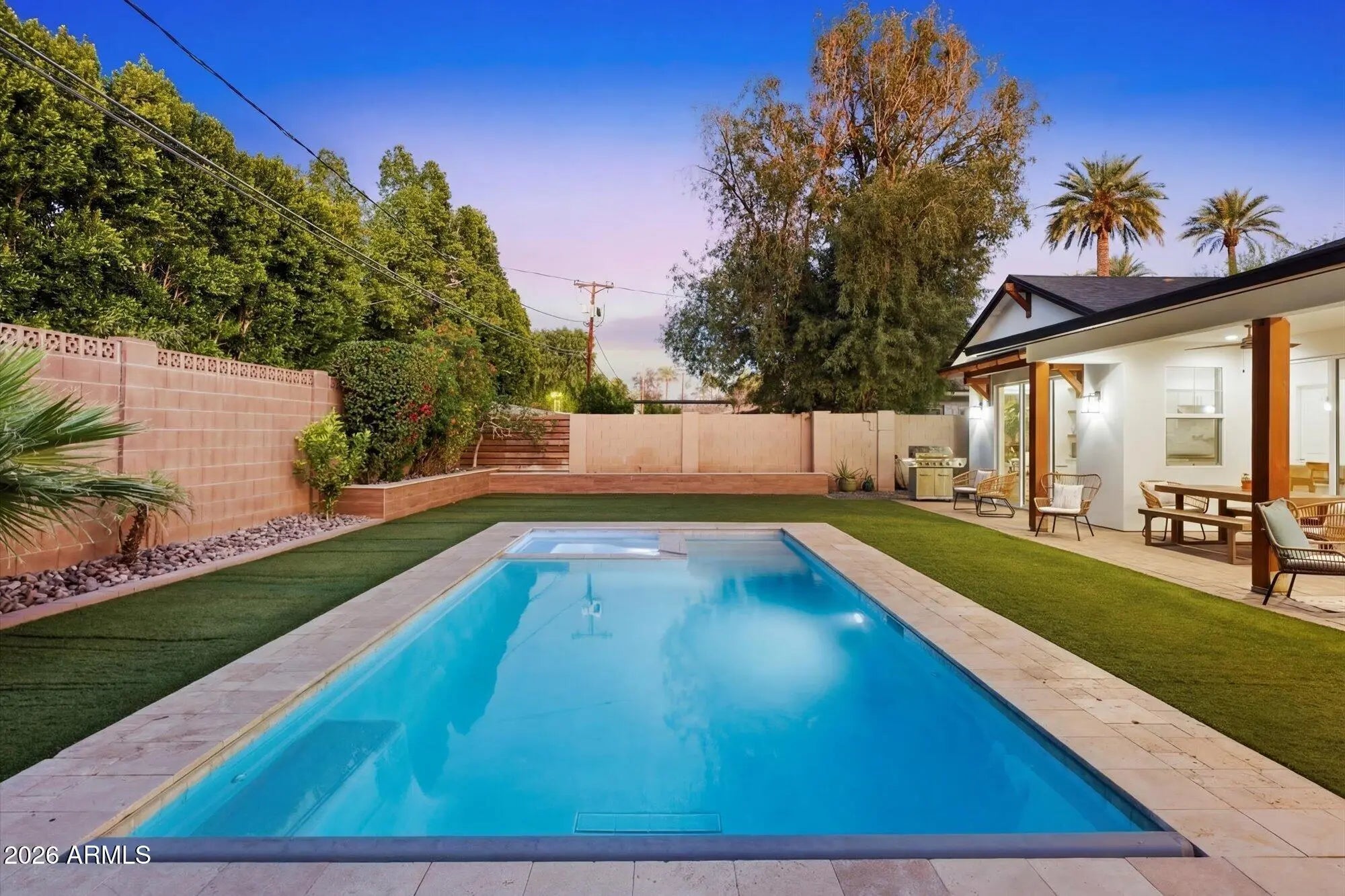 Arcadia Lite | Hopi Elementary | Newer Single-Level | Walk to LGO & Postino. Recently repositioned--now one of the most compelling values in Arcadia Lite. Rare 2018-built single-level home in a walkable location within the Hopi Elementary district. 2,801 sq ft with 4 bedrooms, 3 baths, including a guest en suite, plus a private den/office. Open great room with soaring ceilings and three oversized sliding doors for seamless indoor-outdoor living. Chef's kitchen with gas cooking, large island, and walk-in pantry. Backyard with heated pool, spa, electric cover, turf, and covered patio. Surrounded by single-level homes for rare privacy. RainSoft system + epoxy garage. Experience the Arcadia lifestyle--where generations return. Stroller Walk to Kachina park, LGO & Postinos. Run, bike the canal
