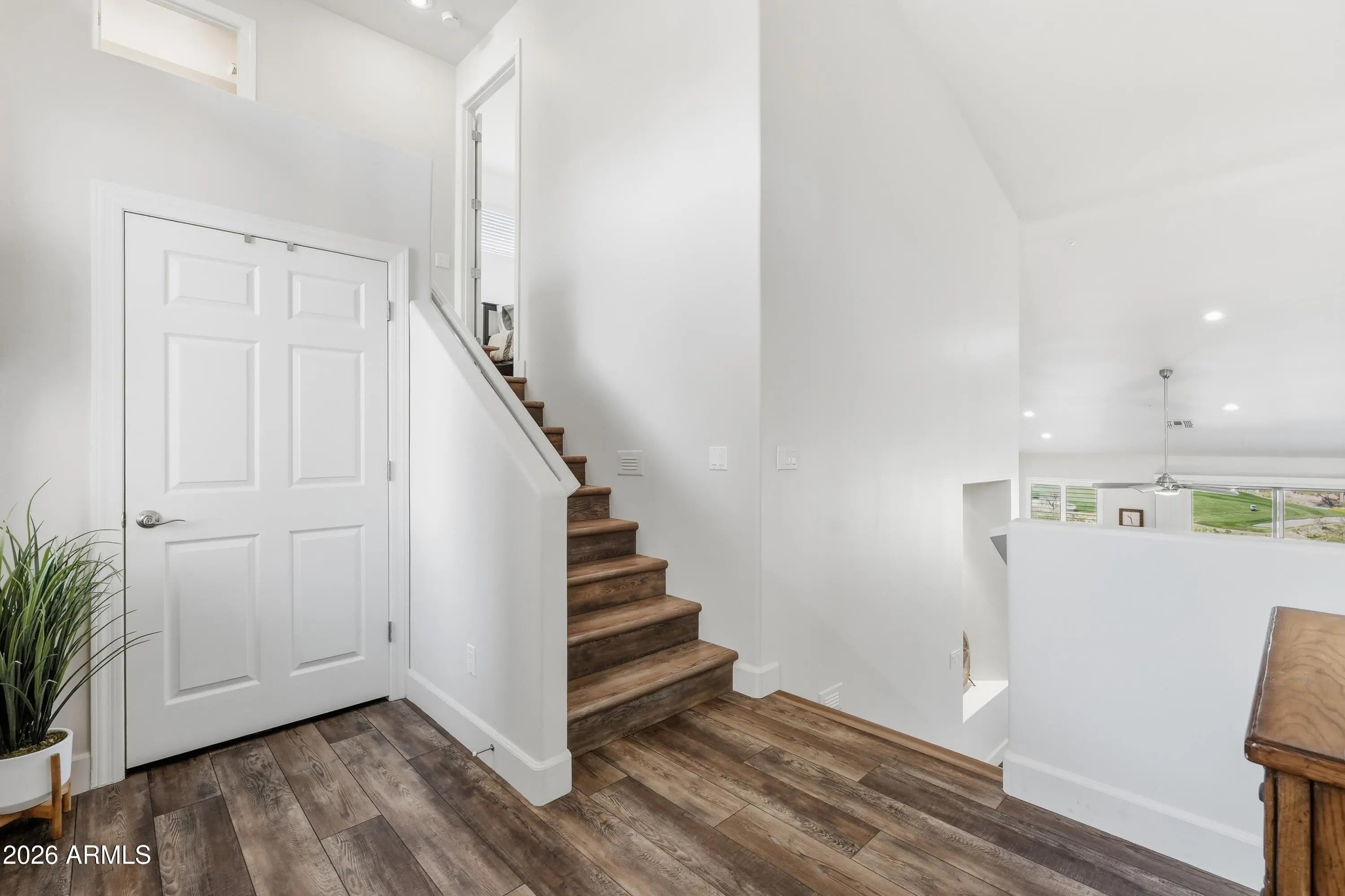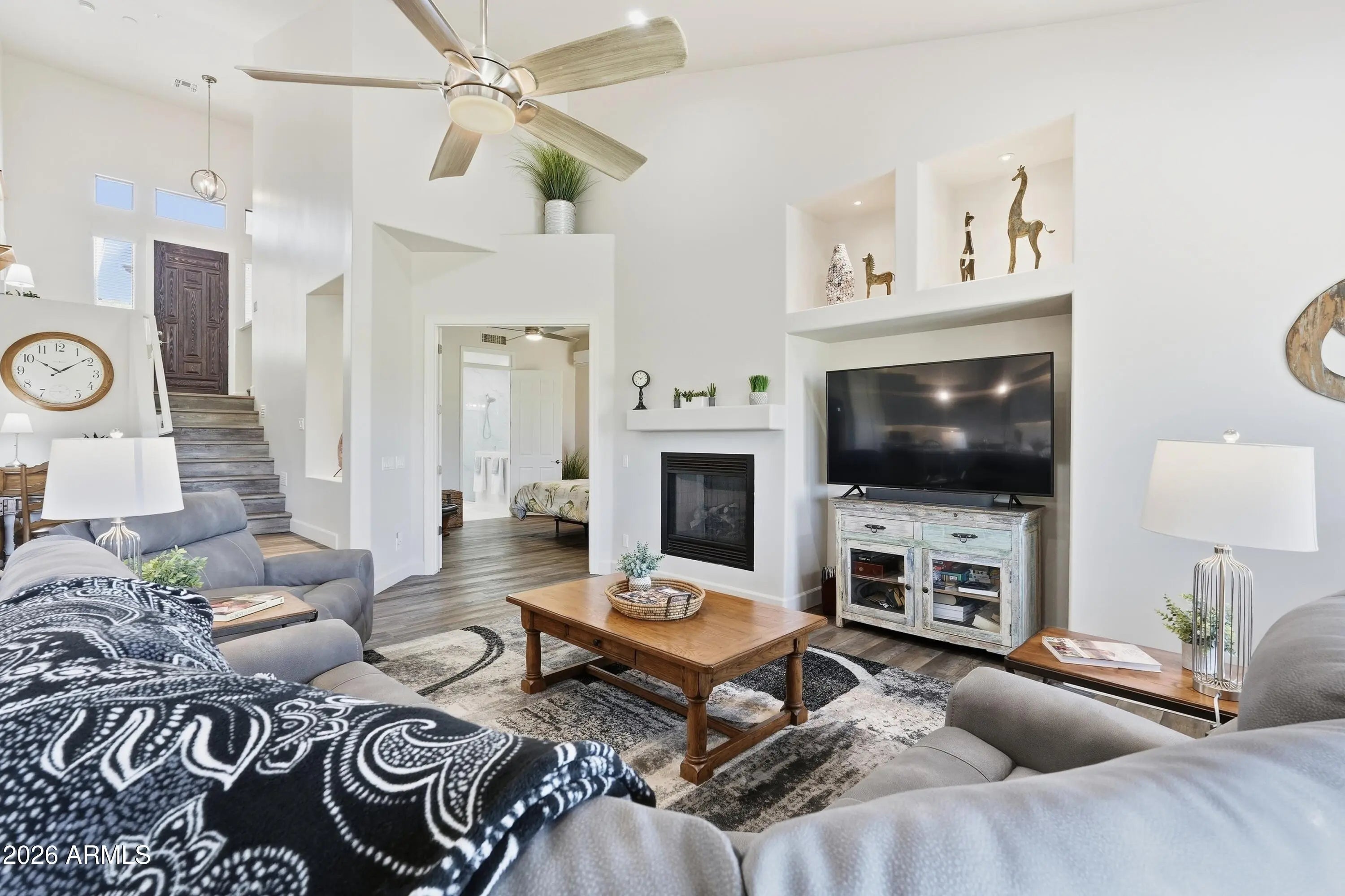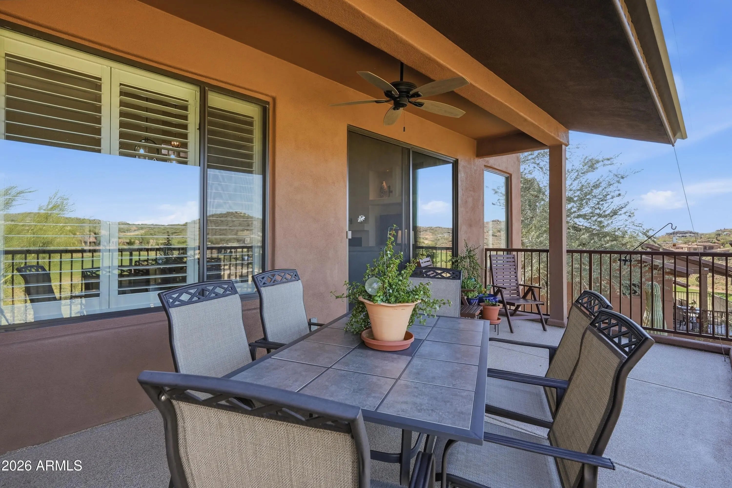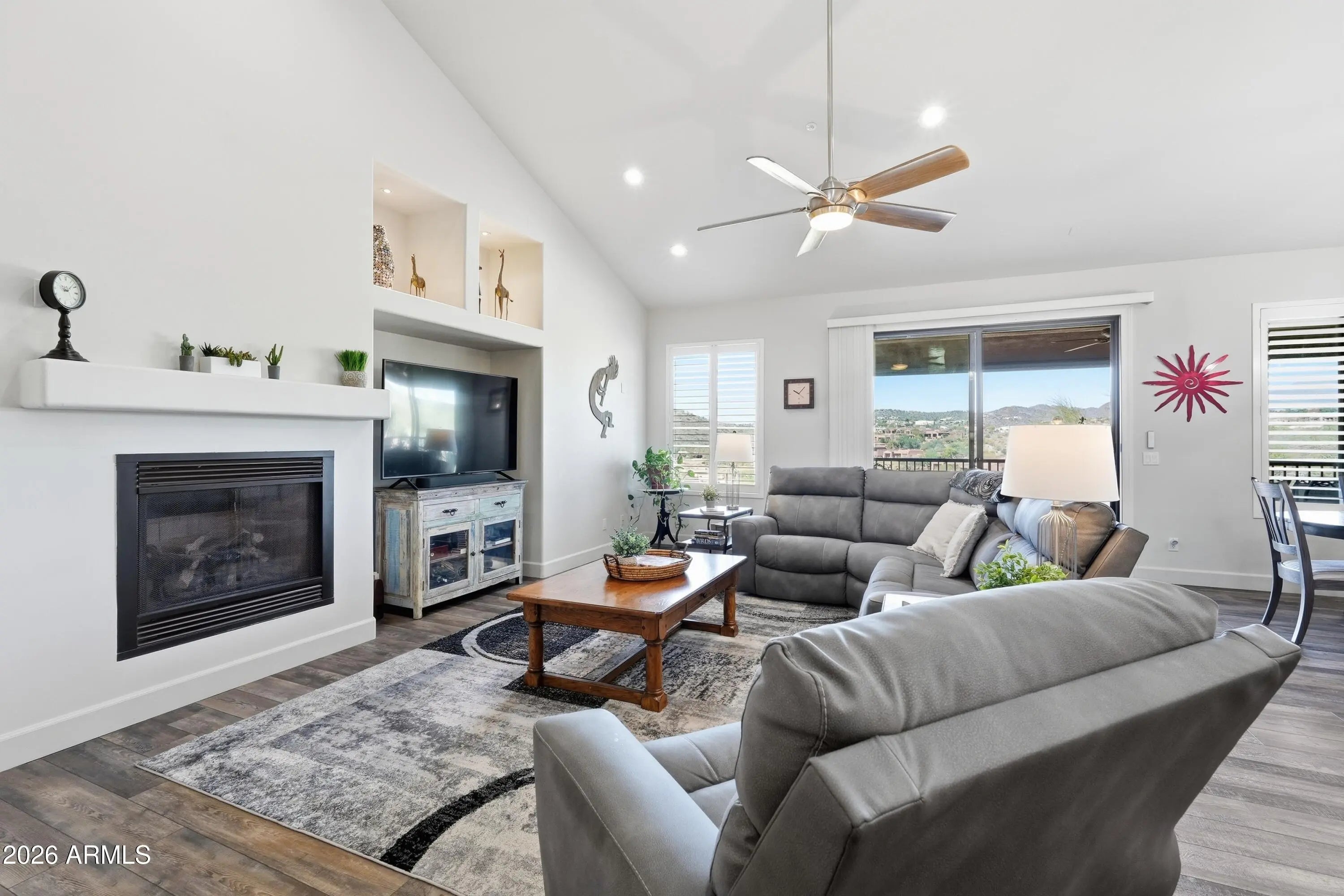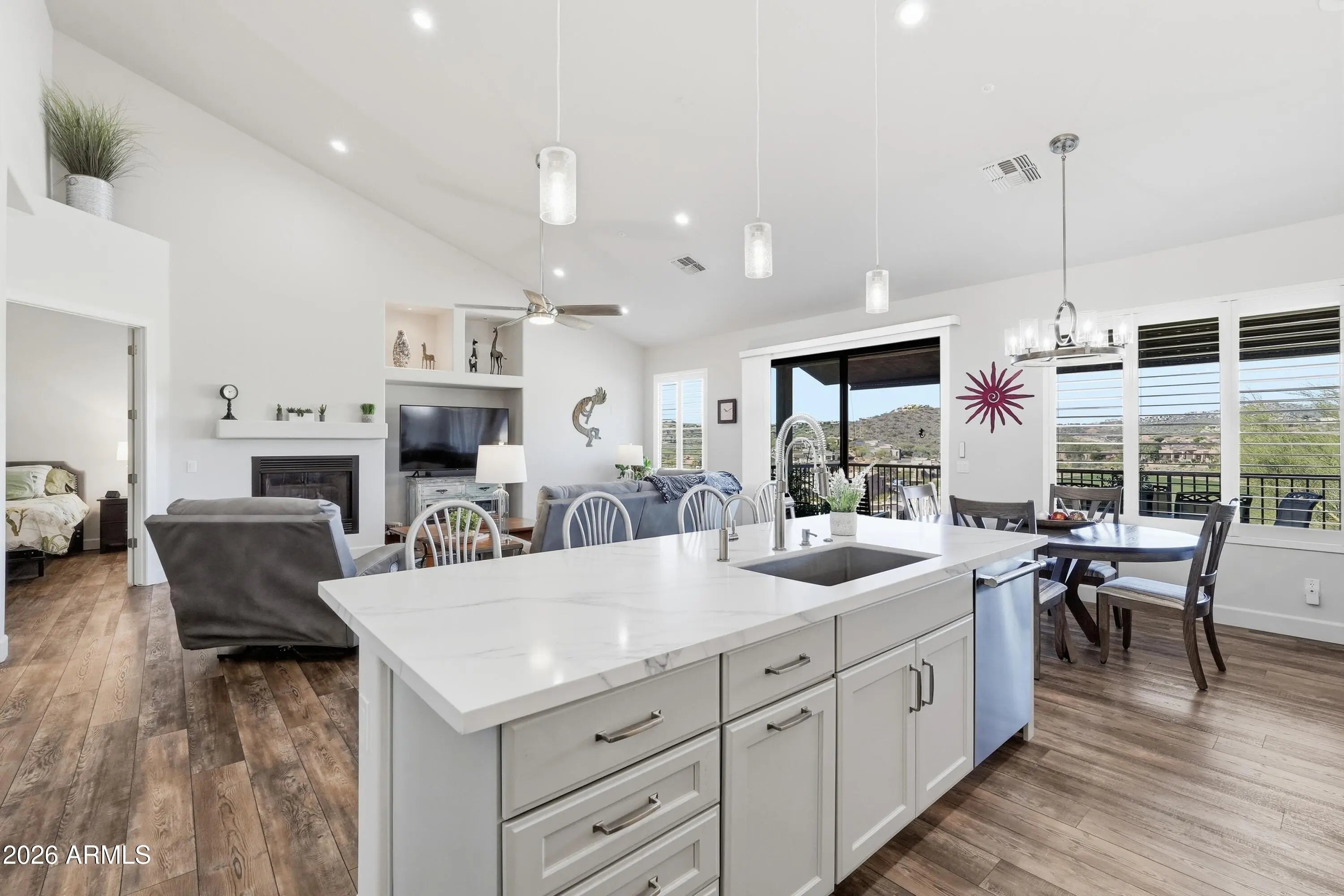 Discover refined desert living in this beautifully updated two-story Golf Villa located in the exclusive gated community of Balera at Firerock. Perfectly positioned to capture sweeping Mountain and Golf course views, this home blends comfort, style, and thoughtful upgrades throughout. The main level welcomes you with vaulted ceilings, a spacious great room with a gas fireplace, and expansive picture windows framing the lush fairways. Step out onto the balcony to enjoy peaceful mornings or sunset evenings overlooking the golf course. The fully remodeled Kitchen is a true showpiece, featuring a large Quartz Island, a single composite sink, with high-end SS appliances. There's a dedicated Beverage Center/Coffee bar that adds a touch of luxury to your daily routine. The Primary suite is conveniently located on the main level and includes its own mini-split system for personalized comfort during Arizona's warmest months. The completely reimagined primary bath offers a large walk-in tiled shower with two handheld sprayers and grab bars, an expansive double vanity, and abundant custom cabinetry. An 85-gallon Cool Water tank provides refreshingly cool water even in the peak summer months. A generous walk-in closet completes the retreat. Upstairs, two additional bedrooms feature custom shutters and share a full bath--ideal for guests or a private workspace. The main level also includes a stylish powder room and a well-appointed laundry room with a built-in sink, cabinetry, and space for a full-size refrigerator or freezer. The two-car garage provides direct access to the home for added convenience. Balera is a well-maintained gated community that offers easy access to both Scottsdale amenities and the charming shops, parks, and restaurants of Fountain Hills. Whether as a full-time residence or a lock-and-leave getaway, this Golf Villa delivers comfort, views, and an exceptional lifestyle.
