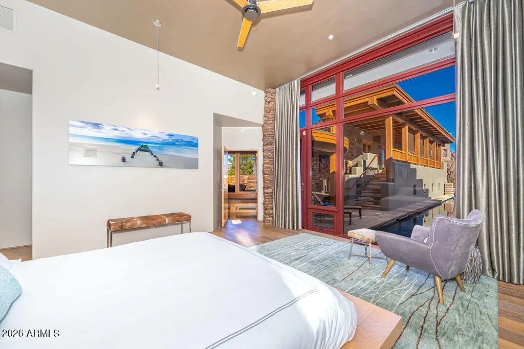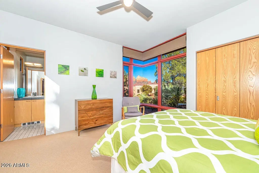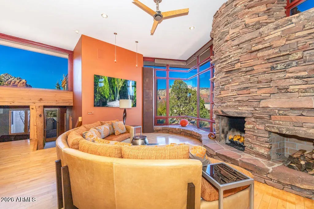 Exclusive luxury in Sedona's premier gated Casa Contenta awaits at 113 Calle Marguerite--a stunning custom home masterfully designed by renowned Design Group Architects, renowned for harmonizing sophisticated architecture with the dramatic red rock landscape. The main residence features 3 spacious bedrooms and 3.5 luxurious bathrooms in an open, flowing layout that captures breathtaking panoramic red rock views from nearly every angle, complemented by a fully separate guest house offering 2 bedrooms and 1 full bathroom ideal for guests, family, or a private retreat. Enjoy a convenient 3-car garage and your personal oasis: a heated lap pool with automatic cover and brand-new equipment for effortless year-round swimming surrounded by iconic scenery.