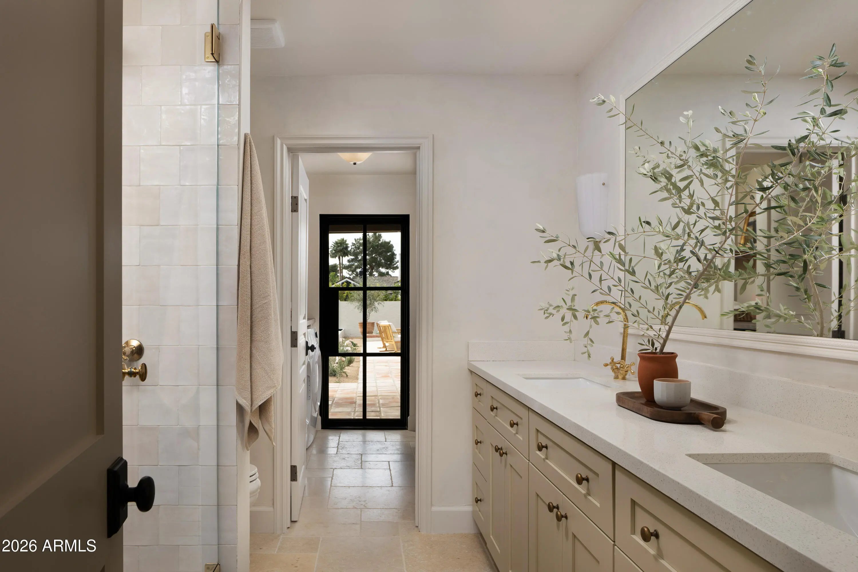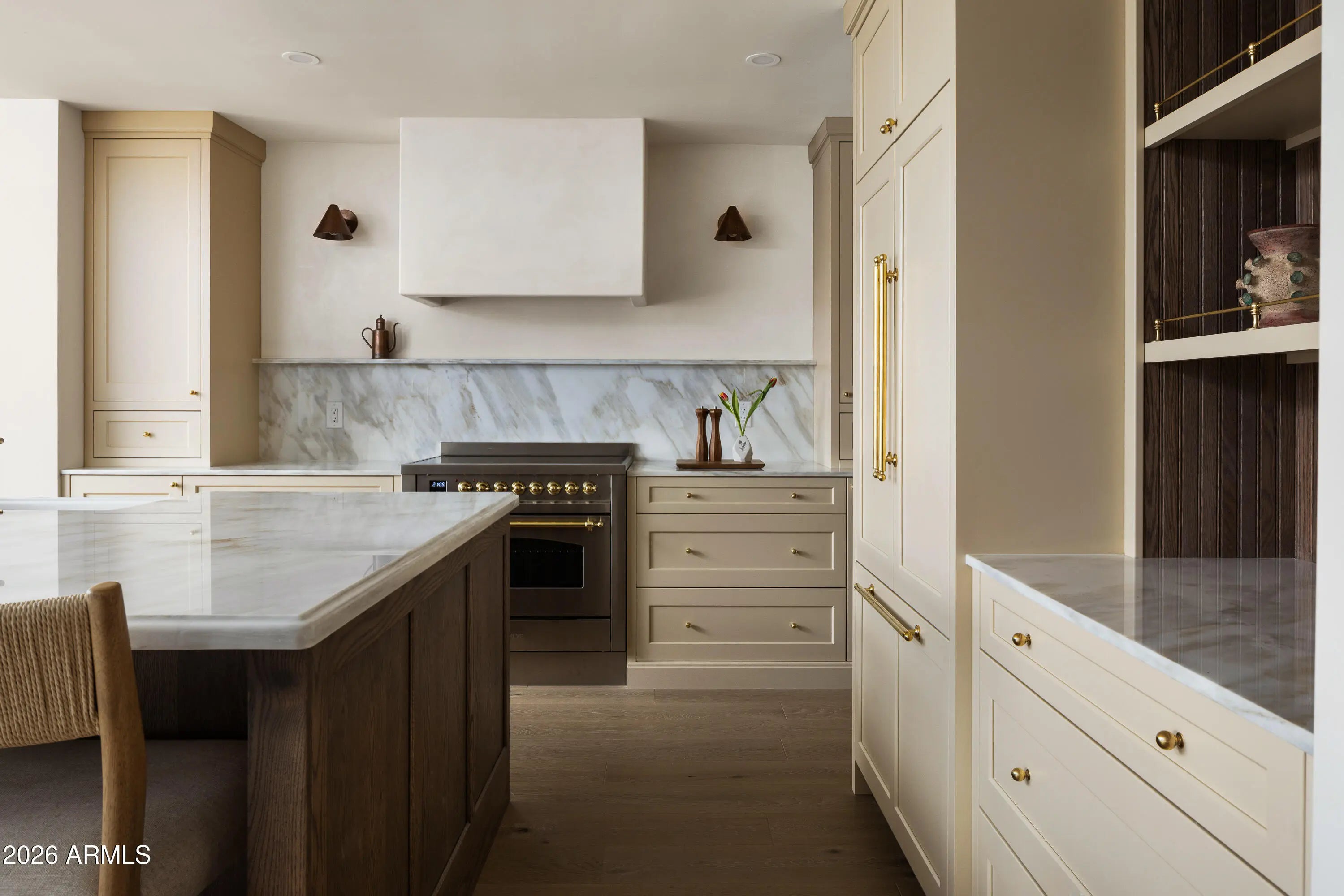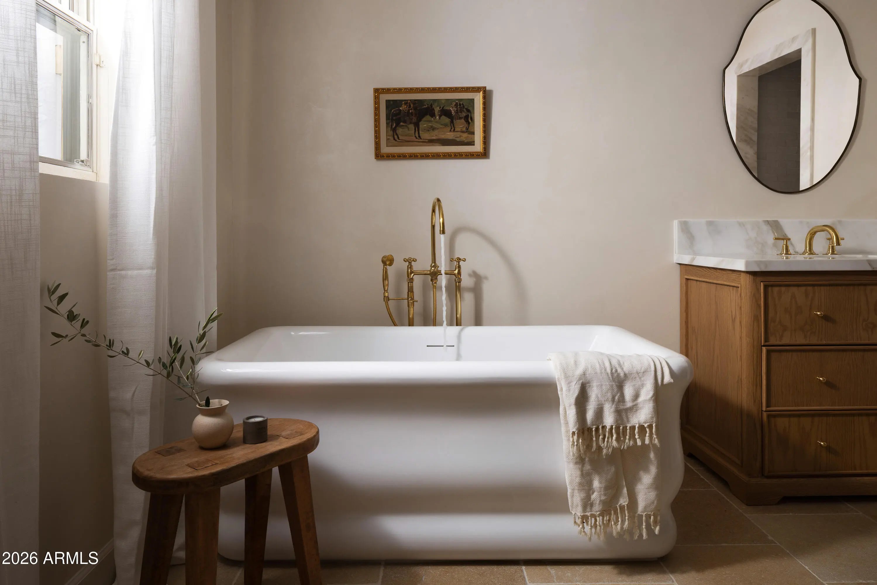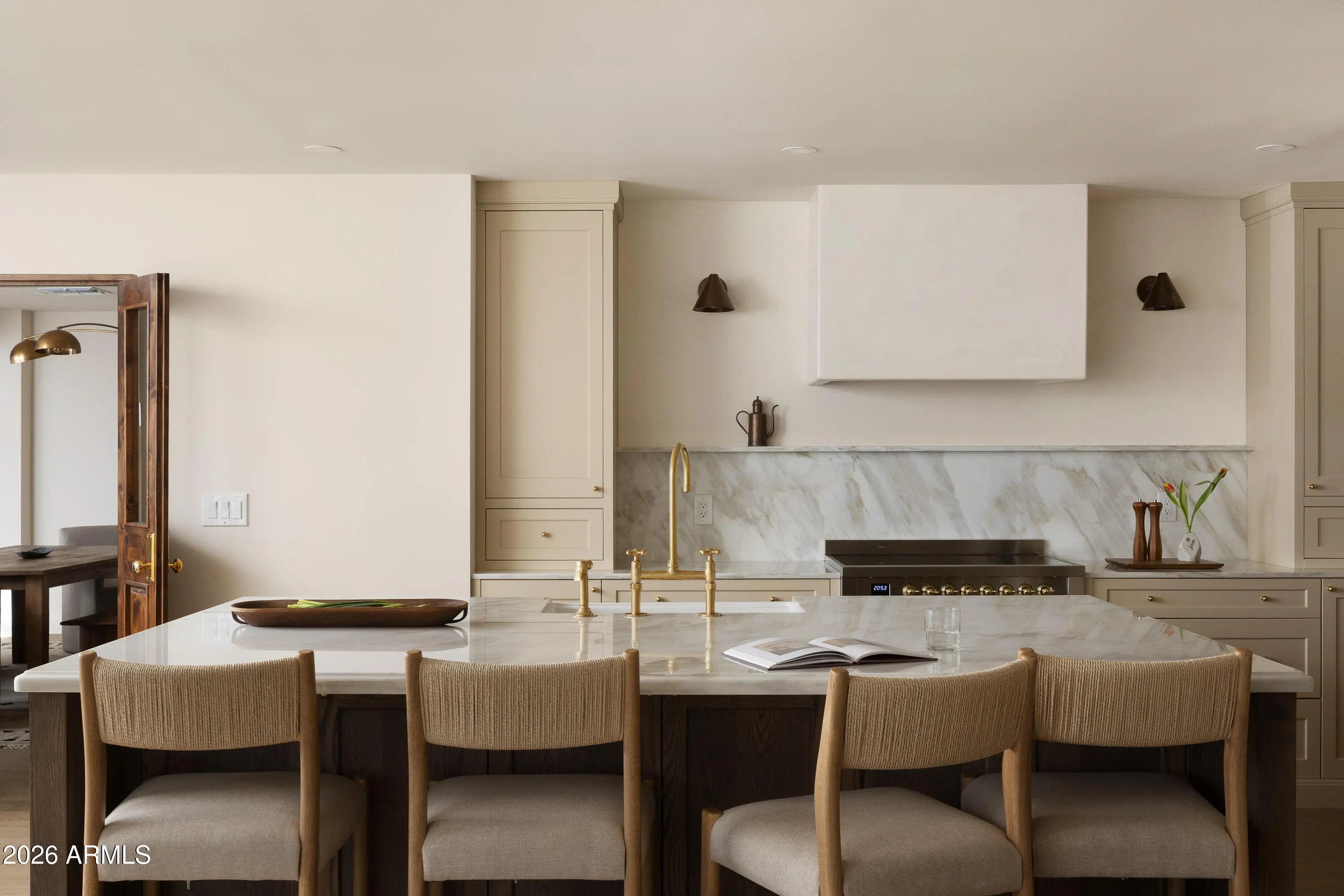 A refined interpretation of Spanish Colonial architecture, this residence blends authentic old-world materials with a calm, contemporary sensibility. Set on a .77-acre lot with striking Camelback Mountain views, the home pairs warm minimal interiors with globally sourced artisan details, creating an atmosphere of quiet, textural luxury. The custom kitchen is both sculptural and functional, featuring bespoke cabinetry with unlacquered brass hardware, an oak-stained island with farm sink and bridge faucet, and paneled Fisher & Paykel refrigeration and dishwasher. A statement ILVE range anchors marble countertops in Calacatta Gold with ogee edge and full slab backsplash. Antique doors introduce patina and character, while an adjacent butler's pantry offers white oak shelving, wood countertops wine refrigeration, and abundant storage. Hand-applied Roman clay walls and surrounds enrich the range hood, fireplace, and all baths, complemented by custom Murano sconces and handmade solid brass lighting throughout. White oak flooring flows through serene living spaces softened by linen draperies and framed by custom iron doors and additional antique architectural elements. The generous primary suite is a private retreat with soaking tub, dual custom white oak vanities, antique mirrors with hand-forged brass frames, Turkish limestone floors, and a Zellige tile shower enveloped in Roman clay walls. Secondary baths continue the material story with Spanish ceramic tile, Calacatta marble mosaics, solid unlacquered brass plumbing, and an antique marble-topped vanity. The powder bath is wrapped in dramatic Breccia Capraia marble. Outdoors, Saltillo-tiled patios overlook refreshed pool finishes with Zellige waterline tile and mini-pebble interior, all set within expansive grounds oriented to Camelback views. A travertine-paved entry courtyard with limestone trough fountain completes the home's layered Mediterranean narrative. Timeless Spanish roots, Moorish influence, and warm minimal restraint converge in a residence that feels both historic and distinctly modern.