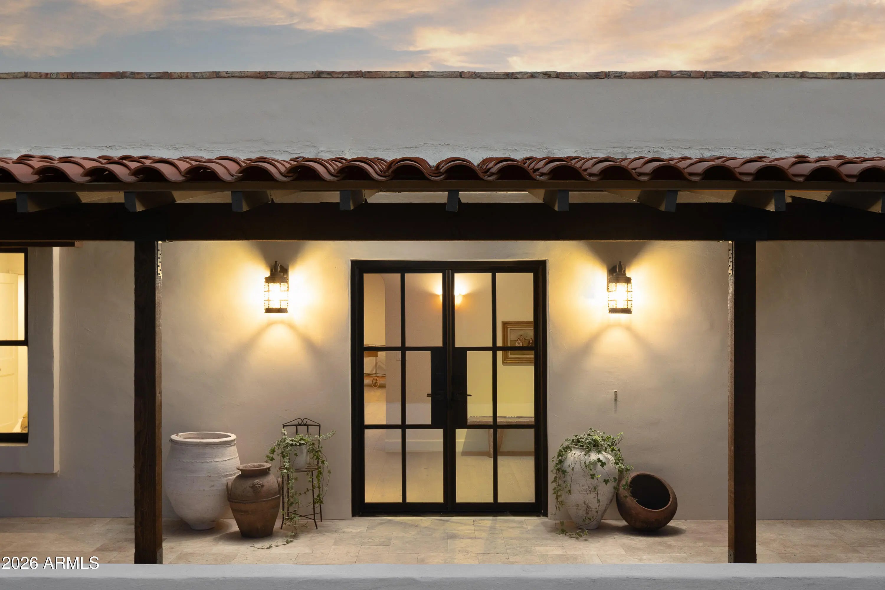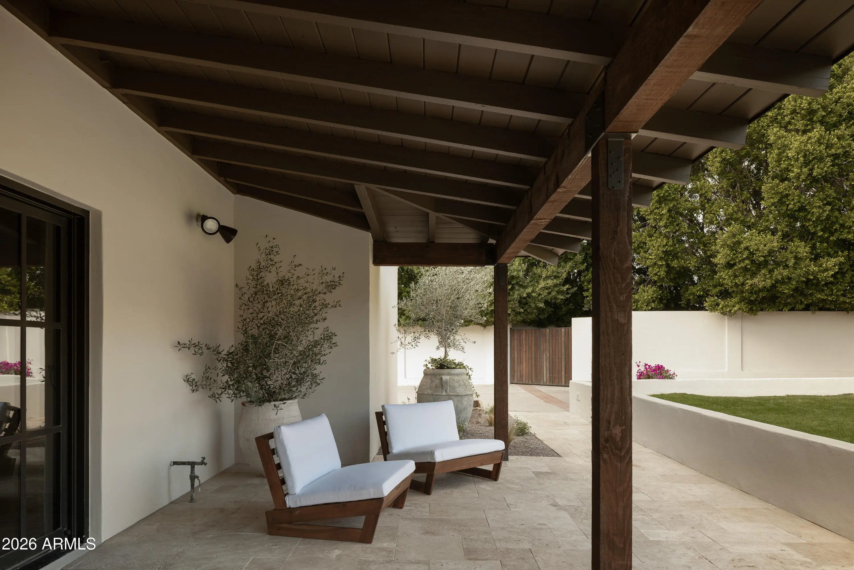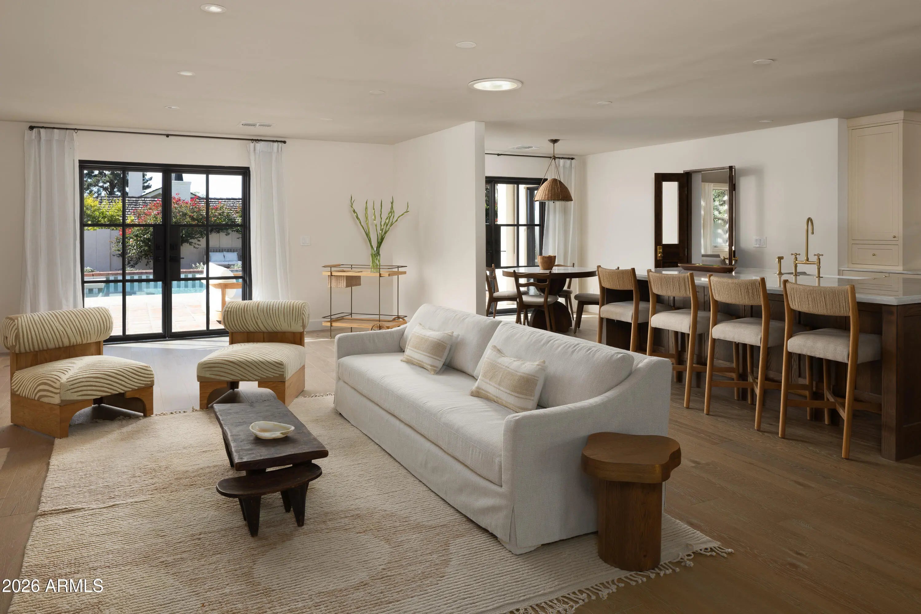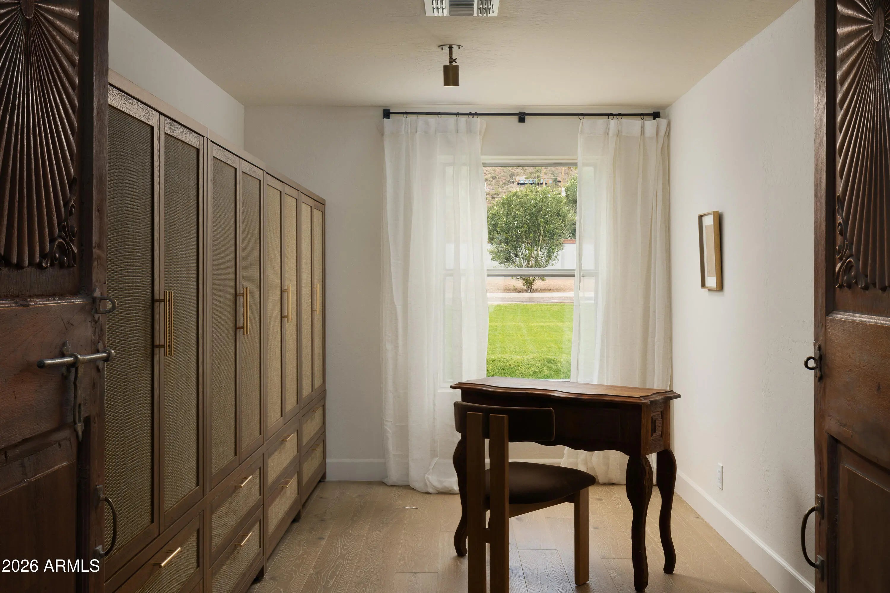 A refined interpretation of Spanish Colonial architecture, this residence blends authentic old-world materials with a calm, contemporary sensibility. Set on a .77-acre lot with striking Camelback Mountain views, the home pairs warm minimal interiors with globally sourced artisan details, creating an atmosphere of quiet, textural luxury. The custom kitchen is both sculptural and functional, featuring bespoke cabinetry with unlacquered brass hardware, an oak-stained island with farm sink and bridge faucet, and paneled Fisher & Paykel refrigeration and dishwasher. A statement ILVE range anchors marble countertops in Calacatta Gold with ogee edge and full slab backsplash. Antique doors introduce patina and character, while an adjacent butler's pantry offers white oak shelving, wood countertops wine refrigeration, and abundant storage. Hand-applied Roman clay walls and surrounds enrich the range hood, fireplace, and all baths, complemented by custom Murano sconces and handmade solid brass lighting throughout. White oak flooring flows through serene living spaces softened by linen draperies and framed by custom iron doors and additional antique architectural elements. The generous primary suite is a private retreat with soaking tub, dual custom white oak vanities, antique mirrors with hand-forged brass frames, Turkish limestone floors, and a Zellige tile shower enveloped in Roman clay walls. Secondary baths continue the material story with Spanish ceramic tile, Calacatta marble mosaics, solid unlacquered brass plumbing, and an antique marble-topped vanity. The powder bath is wrapped in dramatic Breccia Capraia marble. Outdoors, Saltillo-tiled patios overlook refreshed pool finishes with Zellige waterline tile and mini-pebble interior, all set within expansive grounds oriented to Camelback views. A travertine-paved entry courtyard with limestone trough fountain completes the home's layered Mediterranean narrative. Timeless Spanish roots, Moorish influence, and warm minimal restraint converge in a residence that feels both historic and distinctly modern.