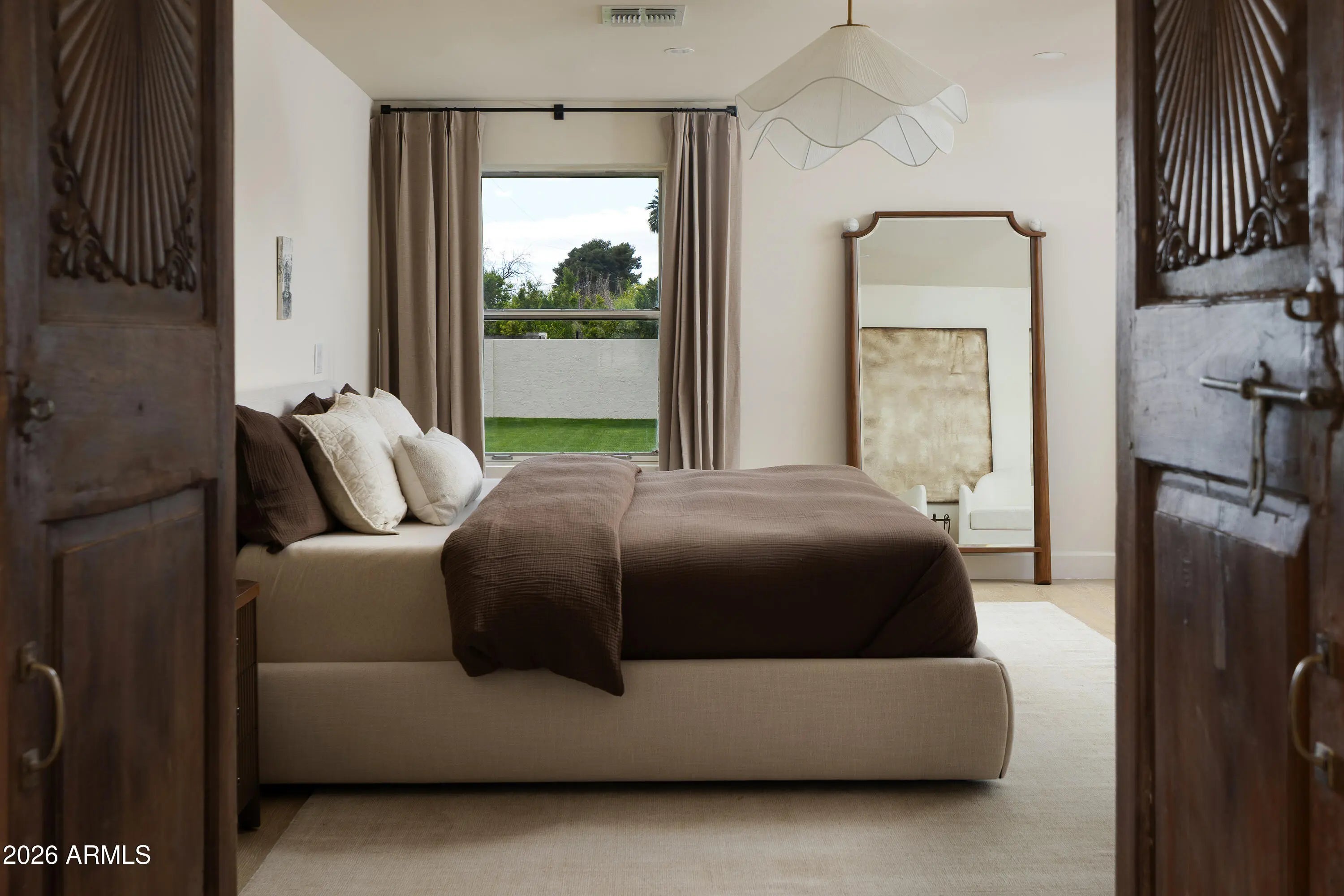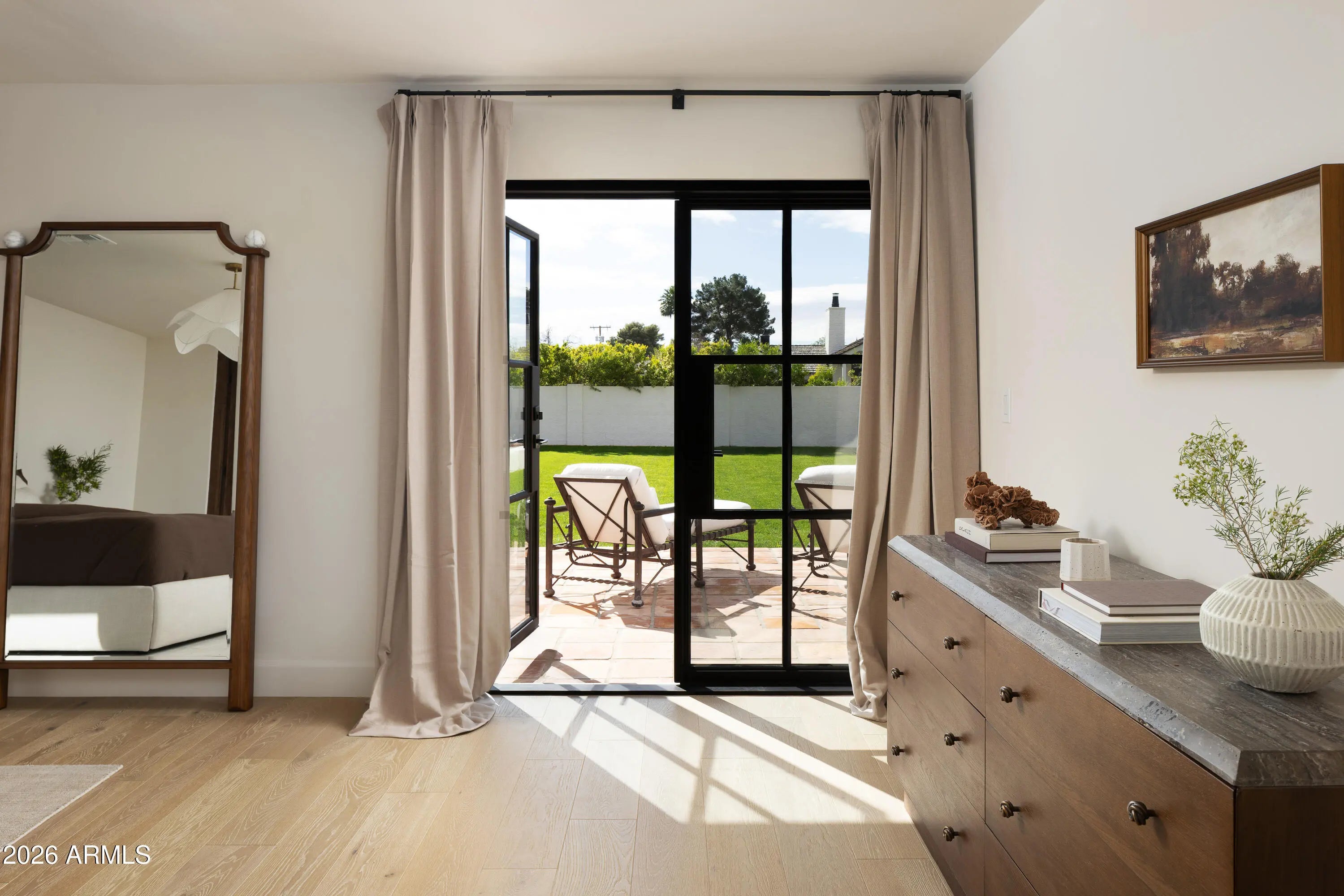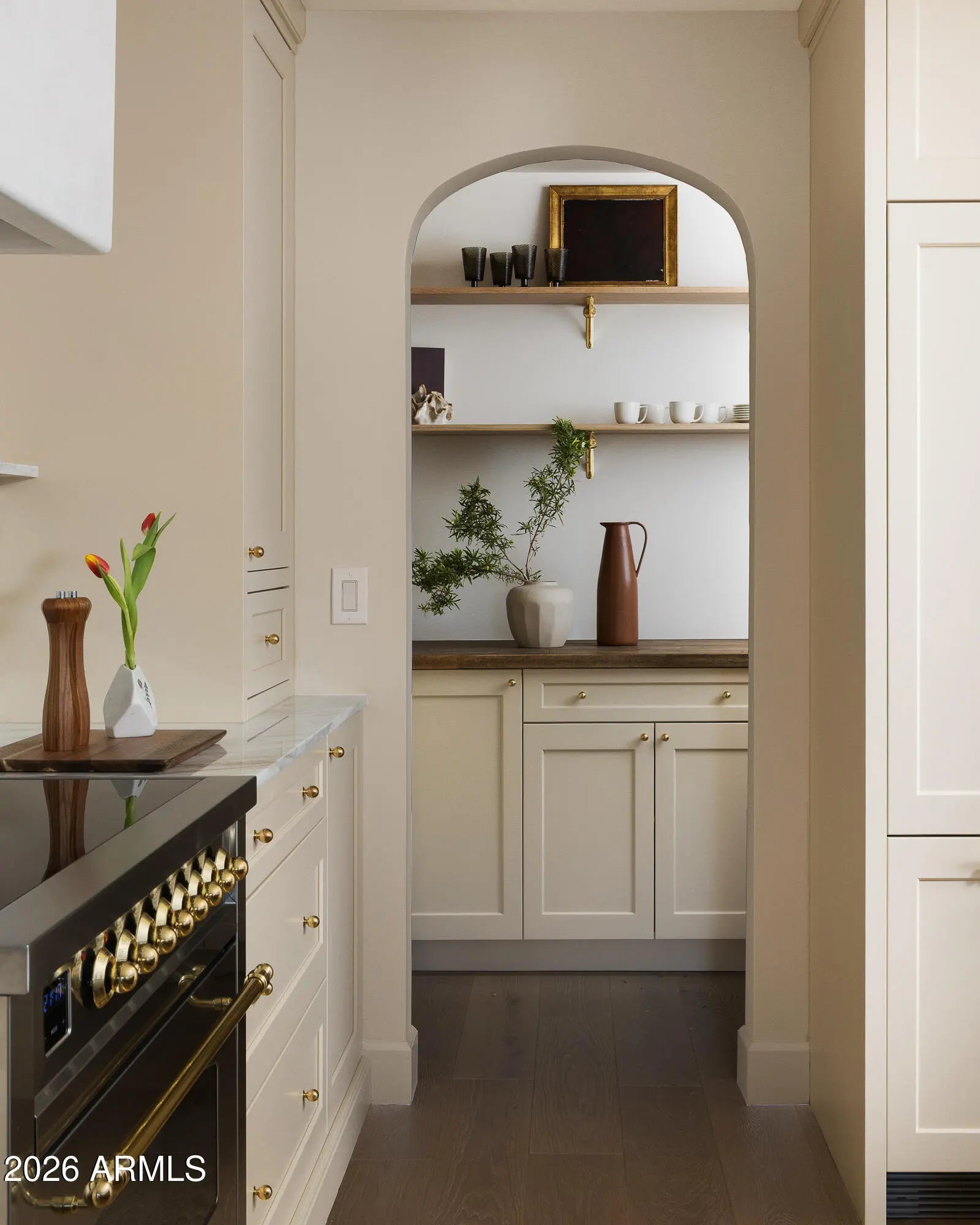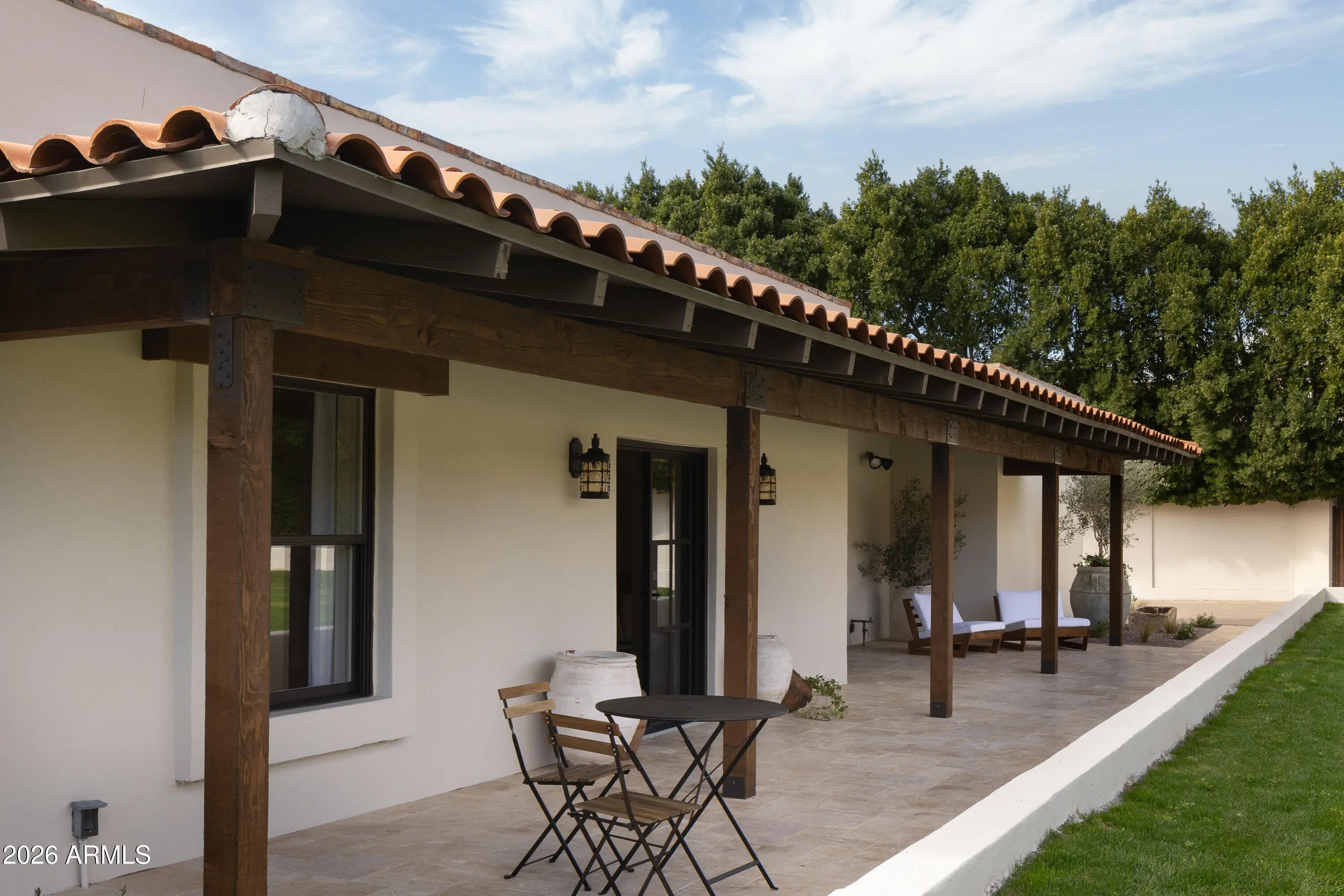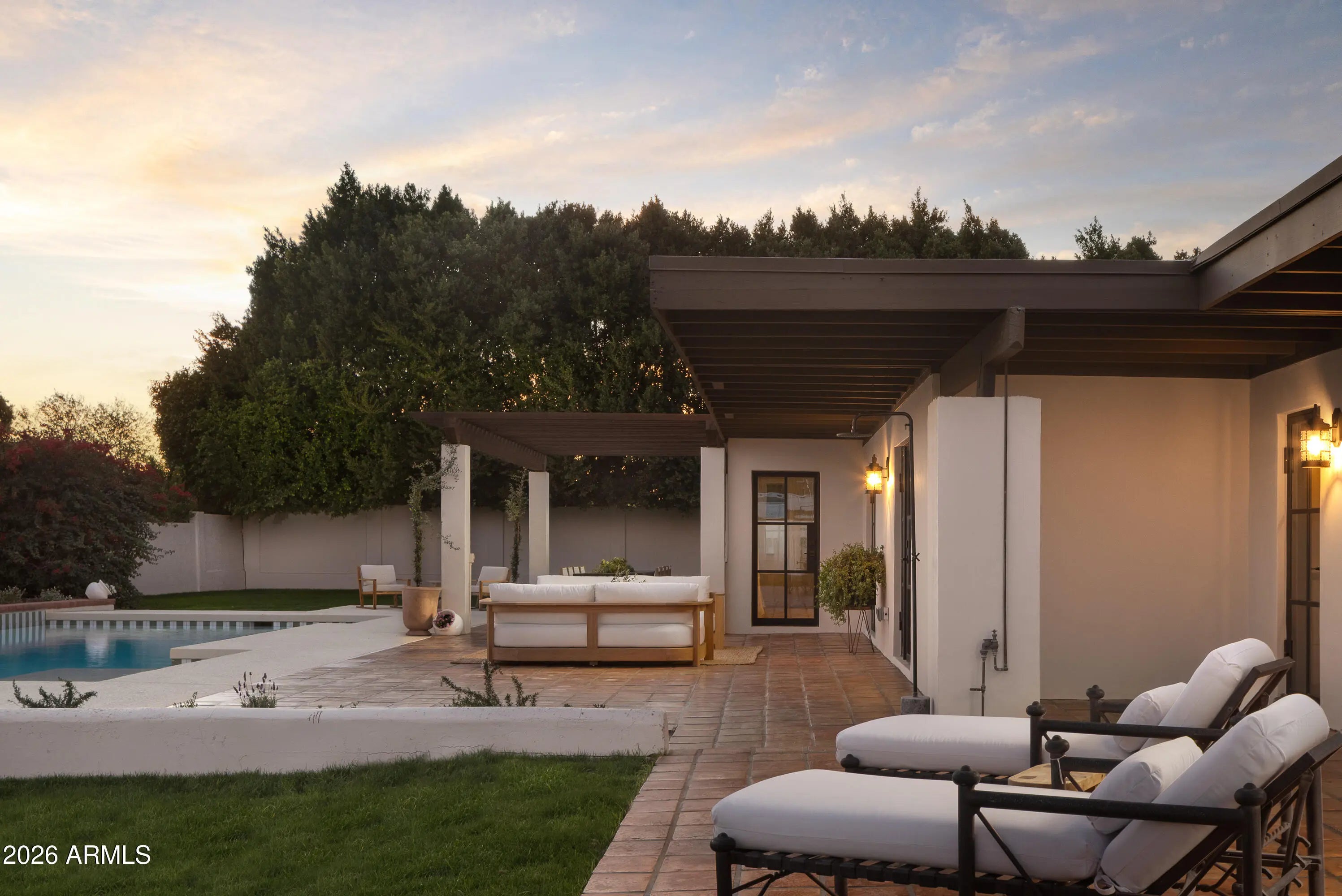 A refined interpretation of Spanish Colonial architecture, this residence blends authentic old-world materials with a calm, contemporary sensibility. Set on a .77-acre lot with striking Camelback Mountain views, the home pairs warm minimal interiors with globally sourced artisan details, creating an atmosphere of quiet, textural luxury. The custom kitchen is both sculptural and functional, featuring bespoke cabinetry with unlacquered brass hardware, an oak-stained island with farm sink and bridge faucet, and paneled Fisher & Paykel refrigeration and dishwasher. A statement ILVE range anchors marble countertops in Calacatta Gold with ogee edge and full slab backsplash. Antique doors introduce patina and character, while an adjacent butler's pantry offers white oak shelving, wood countertops wine refrigeration, and abundant storage. Hand-applied Roman clay walls and surrounds enrich the range hood, fireplace, and all baths, complemented by custom Murano sconces and handmade solid brass lighting throughout. White oak flooring flows through serene living spaces softened by linen draperies and framed by custom iron doors and additional antique architectural elements. The generous primary suite is a private retreat with soaking tub, dual custom white oak vanities, antique mirrors with hand-forged brass frames, Turkish limestone floors, and a Zellige tile shower enveloped in Roman clay walls. Secondary baths continue the material story with Spanish ceramic tile, Calacatta marble mosaics, solid unlacquered brass plumbing, and an antique marble-topped vanity. The powder bath is wrapped in dramatic Breccia Capraia marble. Outdoors, Saltillo-tiled patios overlook refreshed pool finishes with Zellige waterline tile and mini-pebble interior, all set within expansive grounds oriented to Camelback views. A travertine-paved entry courtyard with limestone trough fountain completes the home's layered Mediterranean narrative. Timeless Spanish roots, Moorish influence, and warm minimal restraint converge in a residence that feels both historic and distinctly modern.
