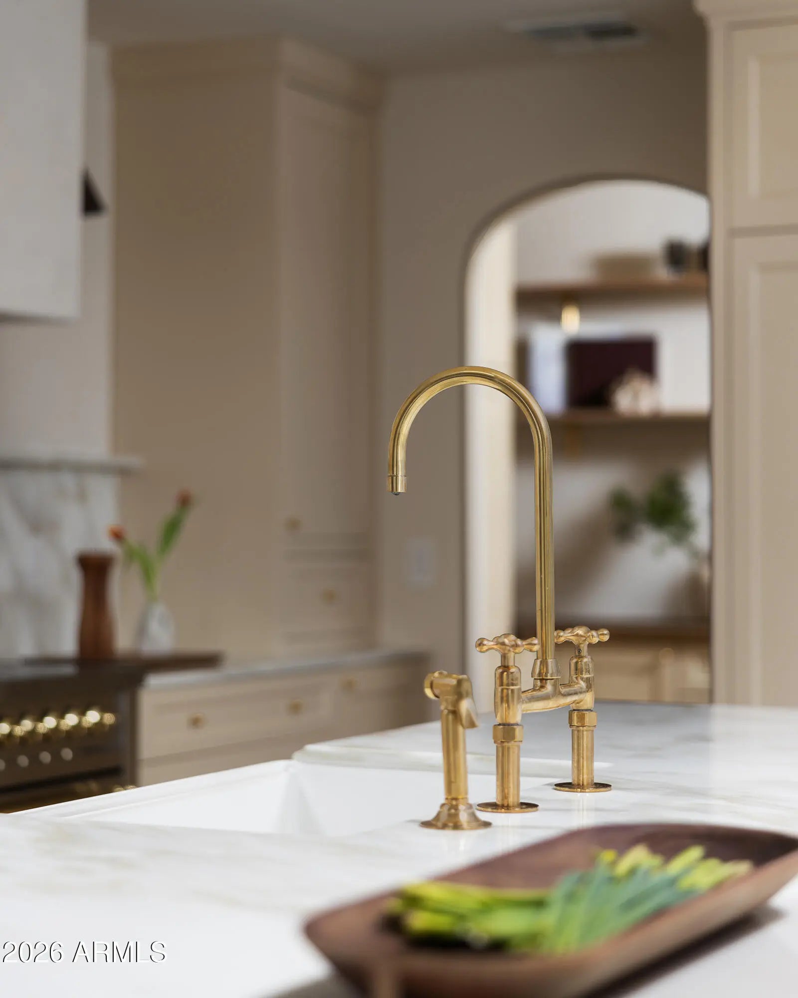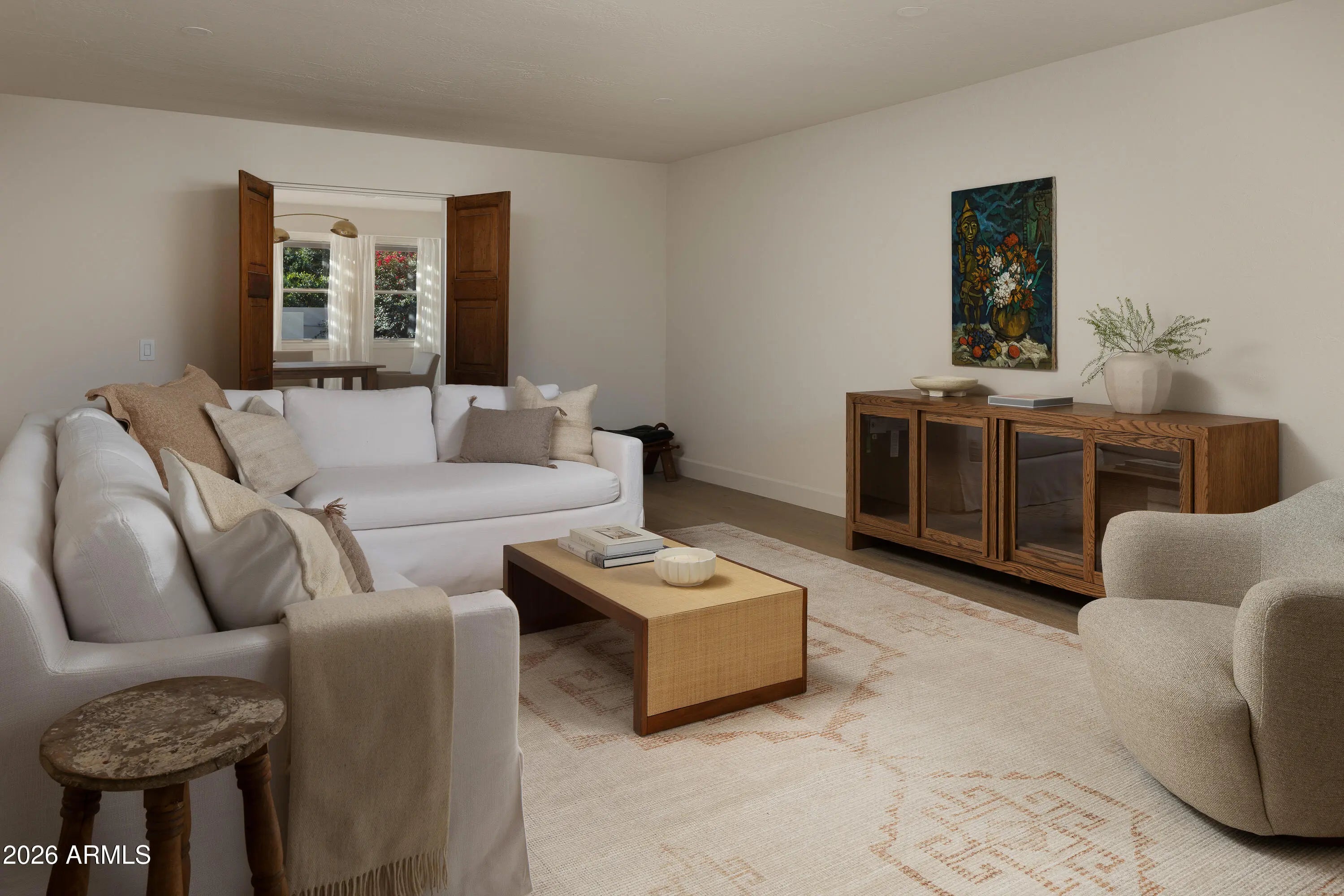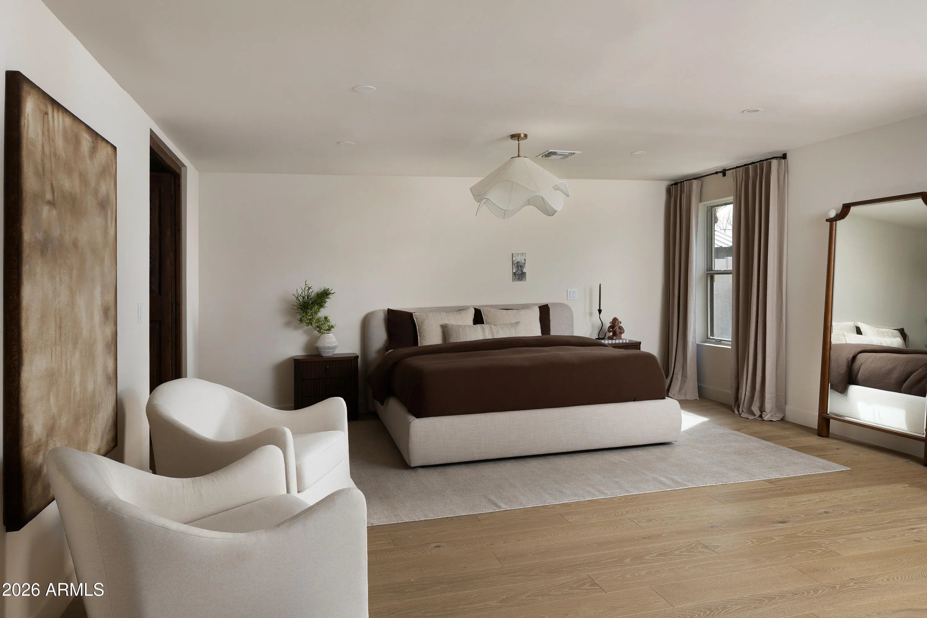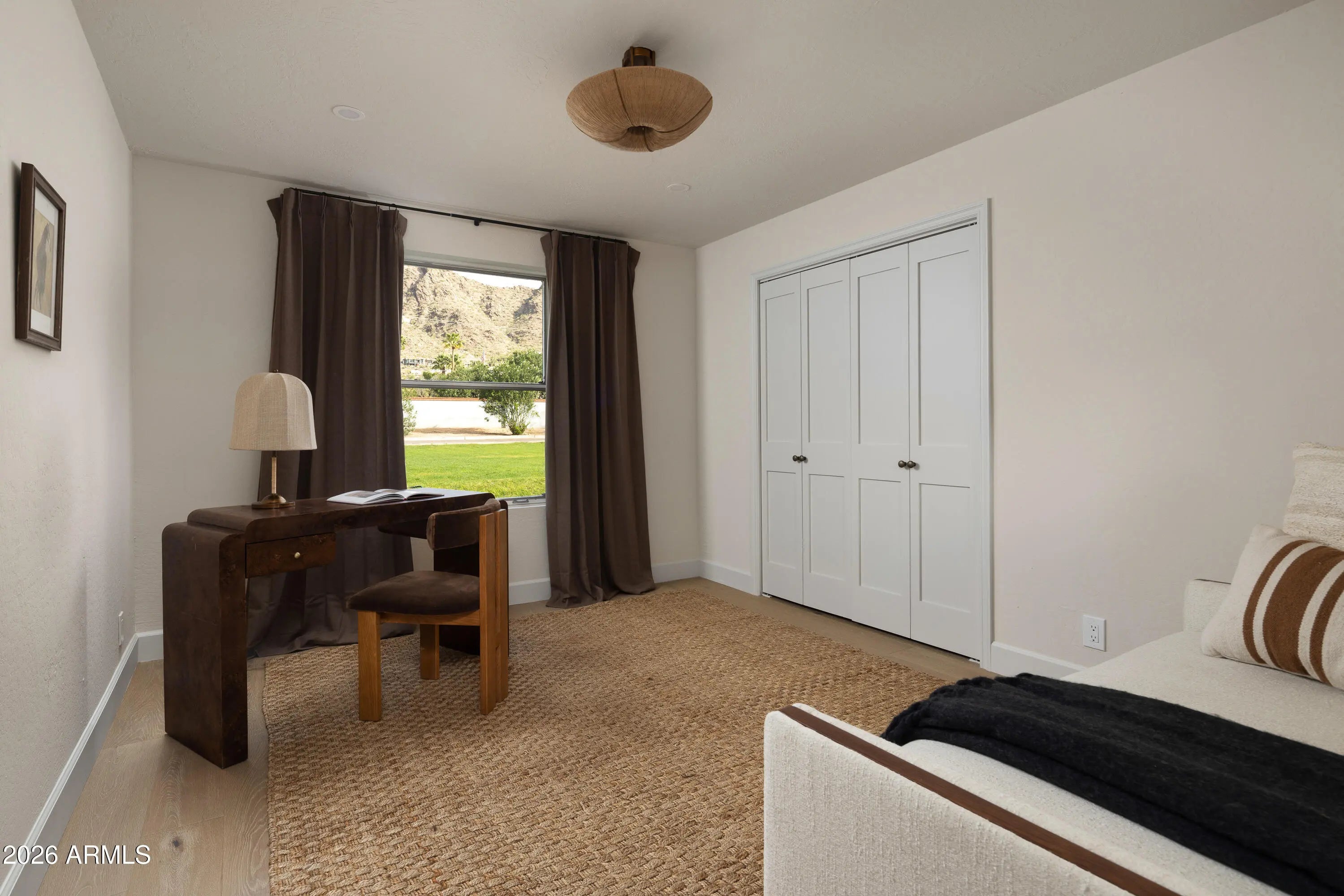 A refined interpretation of Spanish Colonial architecture, this residence blends authentic old-world materials with a calm, contemporary sensibility. Set on a .77-acre lot with striking Camelback Mountain views, the home pairs warm minimal interiors with globally sourced artisan details, creating an atmosphere of quiet, textural luxury. The custom kitchen is both sculptural and functional, featuring bespoke cabinetry with unlacquered brass hardware, an oak-stained island with farm sink and bridge faucet, and paneled Fisher & Paykel refrigeration and dishwasher. A statement ILVE range anchors marble countertops in Calacatta Gold with ogee edge and full slab backsplash. Antique doors introduce patina and character, while an adjacent butler's pantry offers white oak shelving, wood countertops wine refrigeration, and abundant storage. Hand-applied Roman clay walls and surrounds enrich the range hood, fireplace, and all baths, complemented by custom Murano sconces and handmade solid brass lighting throughout. White oak flooring flows through serene living spaces softened by linen draperies and framed by custom iron doors and additional antique architectural elements. The generous primary suite is a private retreat with soaking tub, dual custom white oak vanities, antique mirrors with hand-forged brass frames, Turkish limestone floors, and a Zellige tile shower enveloped in Roman clay walls. Secondary baths continue the material story with Spanish ceramic tile, Calacatta marble mosaics, solid unlacquered brass plumbing, and an antique marble-topped vanity. The powder bath is wrapped in dramatic Breccia Capraia marble. Outdoors, Saltillo-tiled patios overlook refreshed pool finishes with Zellige waterline tile and mini-pebble interior, all set within expansive grounds oriented to Camelback views. A travertine-paved entry courtyard with limestone trough fountain completes the home's layered Mediterranean narrative. Timeless Spanish roots, Moorish influence, and warm minimal restraint converge in a residence that feels both historic and distinctly modern.