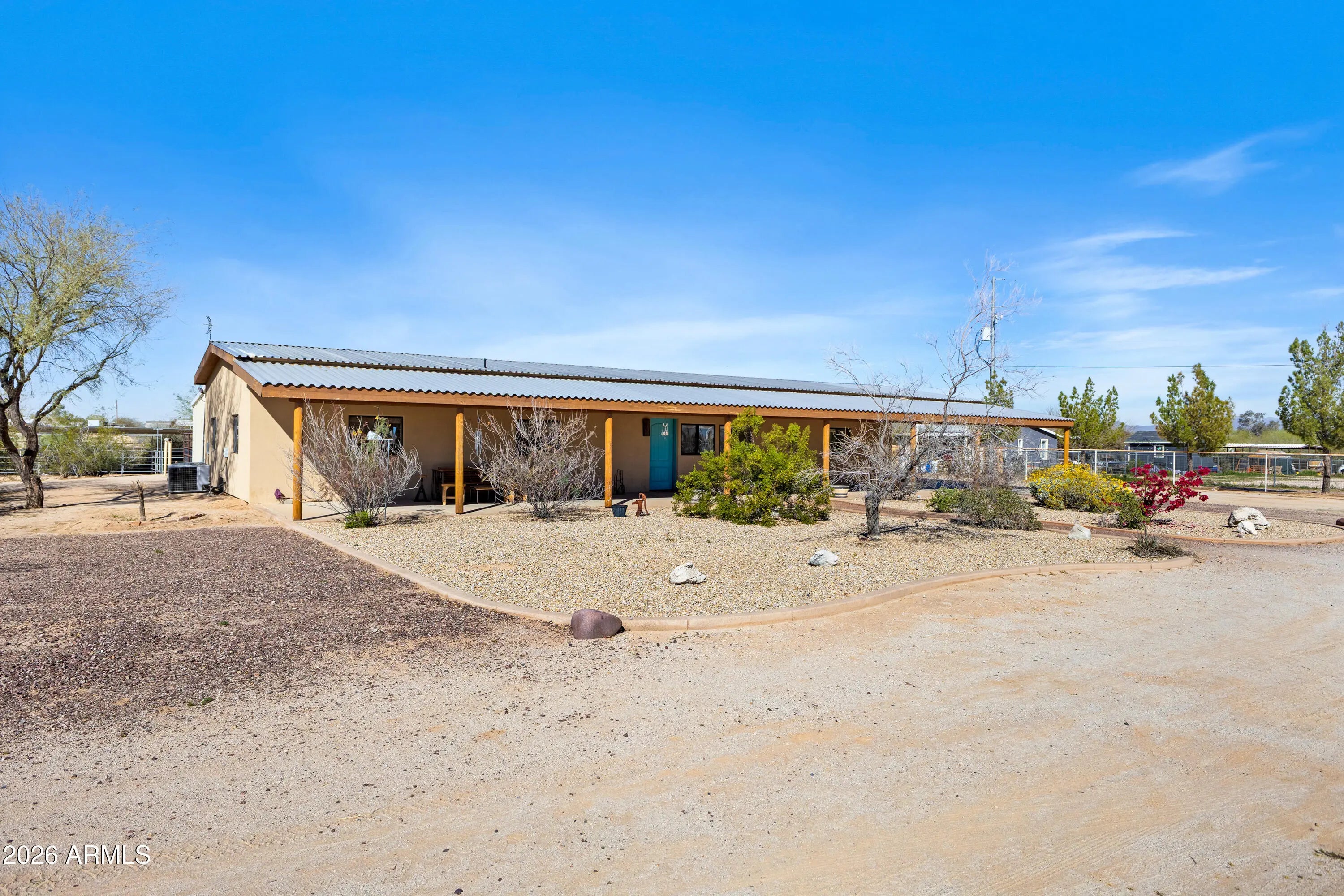 Amazing horse property on 4.35 acres on two separate parcels 400-82-002-C and D. This barndominium is a horse trainers dream home. Absolutely gorgeous 3 bedroom 3 bath custom built with great room, spacious eat in kitchen complete with granite countertops, newer appliances and tile throughout home. Custom wood cabinetry throughout with a western flare. Inside large pantry/laundry room. Separate exit doors in all bedrooms. Covered patio with great views of the mountains. 8 covered stall mare motel with shedrow and wash rack. Hay barn. 4 covered 16x24 stalls attached to house, perfect for foaling out mares. 4 separate covered stalls. Arena with sprinklers. Hot walker, 2 Conex box tack room/sheds. Three RV hook ups. Great location easy access to all the horse arenas around the valley.