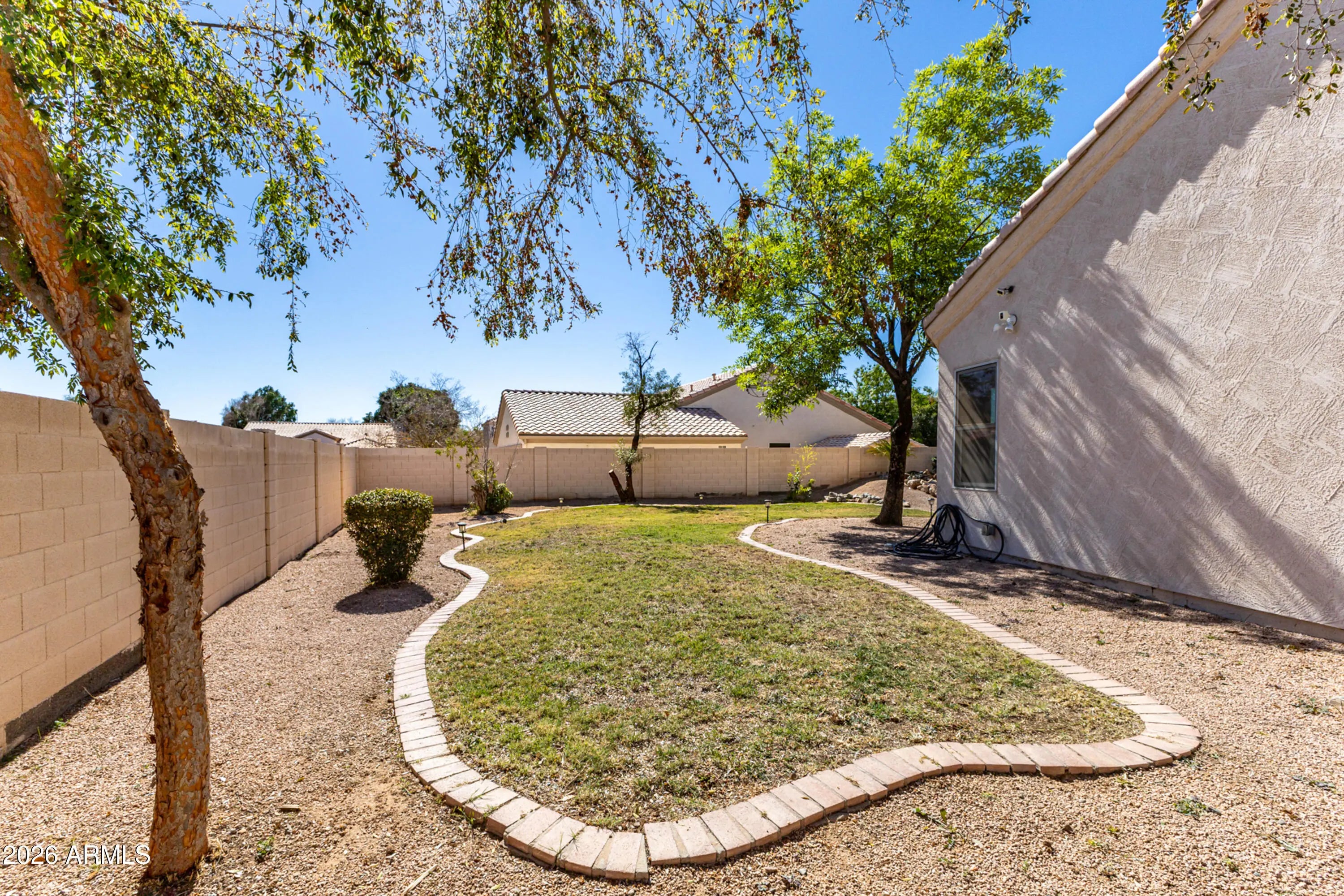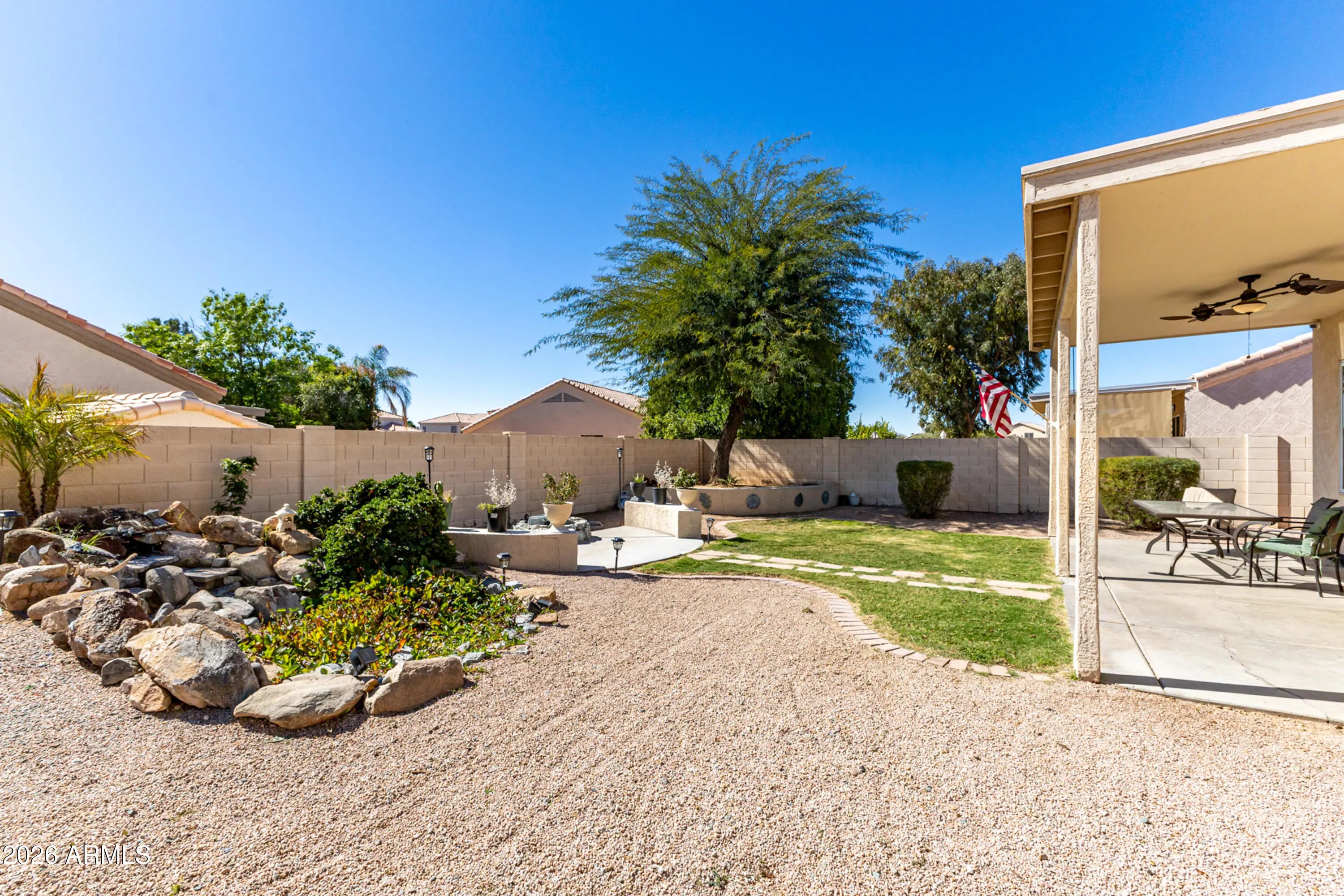 Desirable Garden Lakes community of Avondale. Open, light-filled floorplan with soaring 10' ceilings & rich-brown colored engineered hand-scraped WOOD FLOOR. Spacious chef's kitchen with ample cabinetry & prep space with GRANITE countertops & bar seating. Fridge/ washer/ dryer included. Generously sized bedrooms with wood flooring & recessed lighting. Private backyard--professionally designed. Extended covered patio with adjustable shades. Large storage shed. Mature shade trees on an almost 10,000 sf pool-size CORNER LOT. Fresh PAINT 2023. Located near shopping, Costco, dining, city parks & 101 and 10 freeway access. Garden Lakes has 2 large lakes for fishing, boating, picnicking. Community parks throughout with Ramadas & playgrounds. Must see! At this price,this home will go quickly