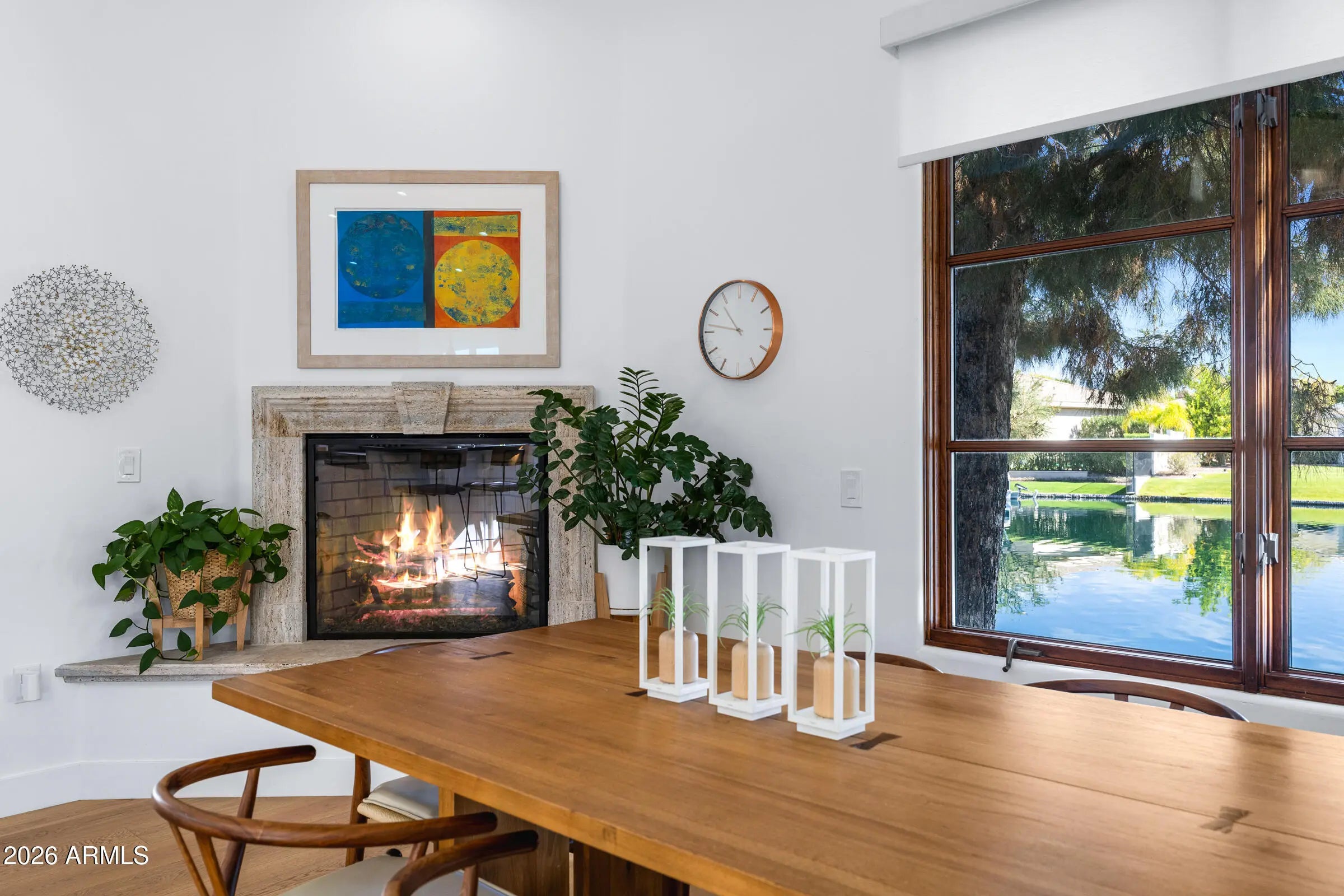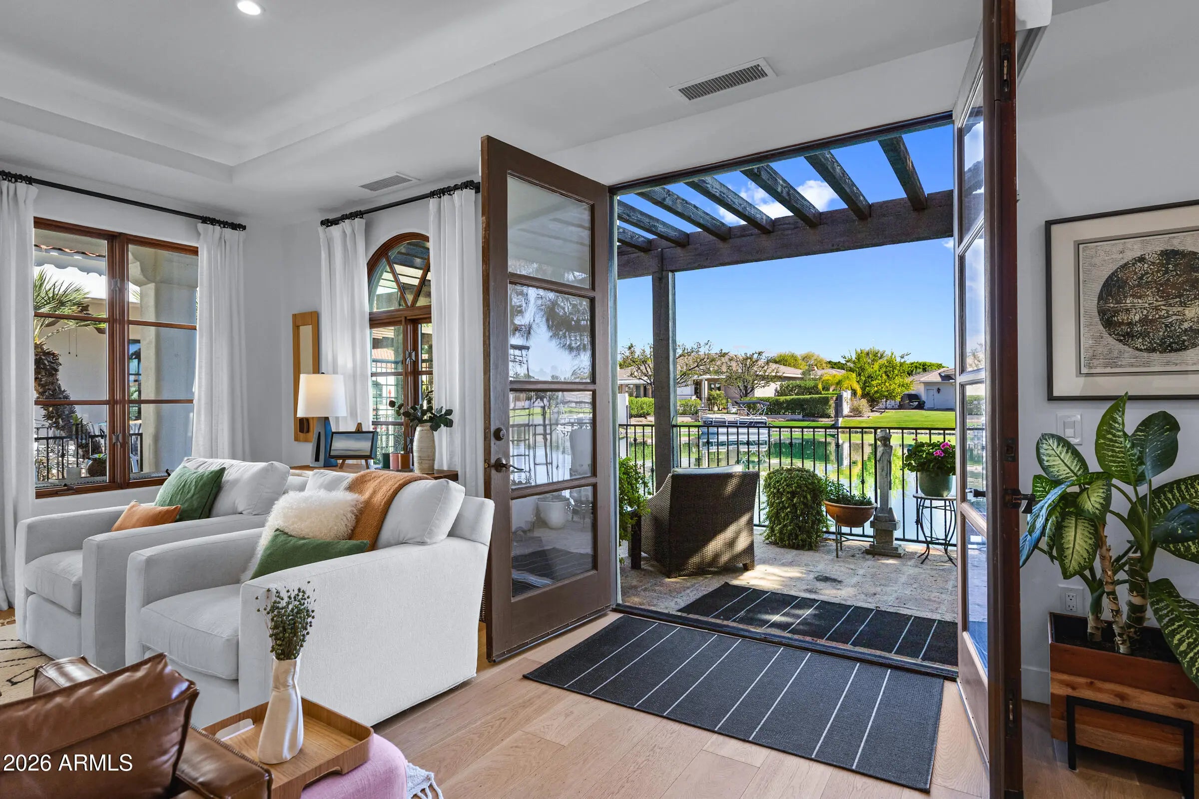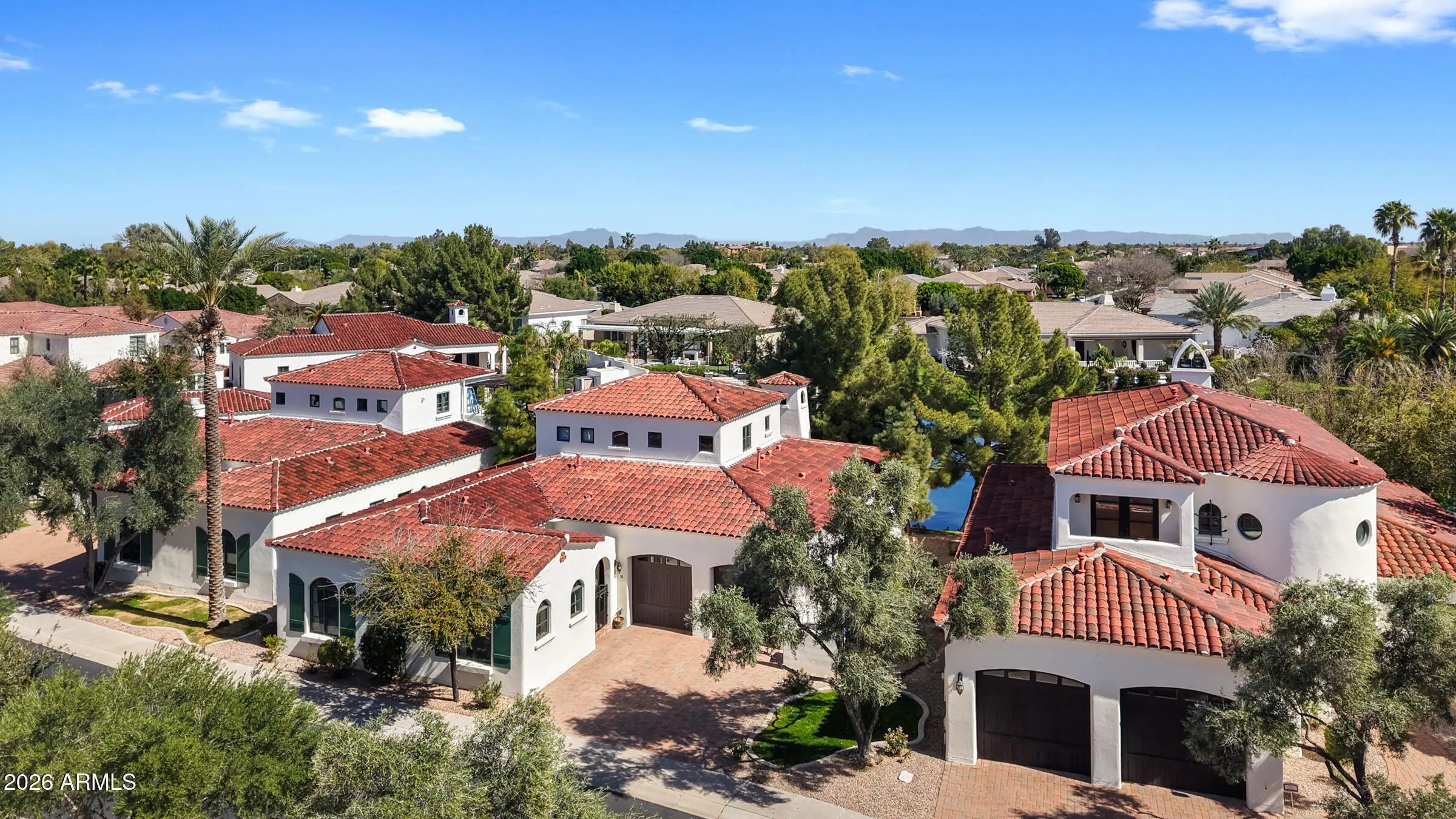 Elegance is redefined in this exquisitely renovated WATERFRONT residence in the prestigious gated Villas at Ocotillo. Perfectly positioned to capture sweeping, uninterrupted water views, this home offers a rare blend of refined design and serene lakeside living. Thoughtfully updated throughout, the property features three expansive owner suites, each appointed with a private bath and generous walk-in closets, ensuring exceptional comfort and privacy for both residents and guests. Two luxurious suites are conveniently located on the main level, while the upstairs retreat offers elevated, panoramic views of the tranquil waterfront, creating a true sanctuary. The gourmet kitchen is a showcase of fine detail, boasting granite countertops, custom cabinetry, premium appliances, a gas range and an abundance of pantry storage. In addition to the stunning living spaces, the main level features a bright, private office/den at the front of the home, making it ideal for remote work, study, or a quiet retreat. A conveniently located half bath is also on the main floor, which enhances functionality for everyday living. Entertaining becomes unforgettable as the dining space overlooks the shimmering water, setting the stage for both intimate dinners and grand gatherings. The expansive wrap-around patio offers the perfect setting to unwind or host guests, all while taking in the peaceful waterfront views. Located in a small, exclusive gated community with a heated pool and spa, this exceptional home offers a refined lifestyle centered around comfort, privacy, and stunning waterfront views. Zoned for top-rated Chandler Unified School District schools and just minutes from Ocotillo Golf Club and Intel in the thriving Price Corridor, the location perfectly balances everyday convenience with an elevated lifestyle. Enjoy premier shopping, dining, and entertainment at Ocotillo Plaza and Downtown Chandler, all with quick access to the Loop 101 and Loop 202 freeways.