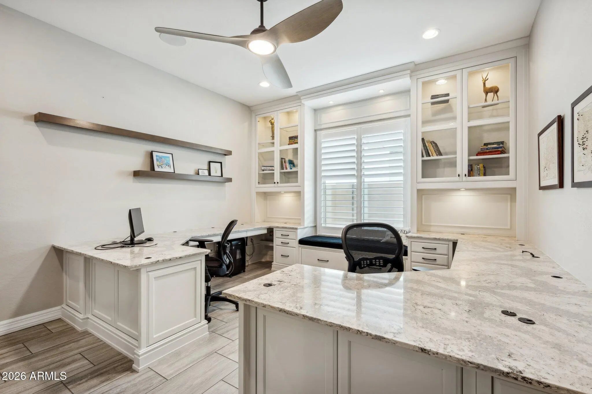 Open the door to modern sophistication in this energy smart, meticulously upgraded home. Top of the line features from the custom iron glass entry door to the first class built-ins. Flexible floor plan with 3 split bedrooms all with walk-in closets and en suite baths. Designer kitchen boasts an expansive center island where meals are made and stories are shared. Inviting Great Room with custom built in cabinetry and an abundance of natural light. Spectacular resort style backyard with expanded covered patio, travertine pavers, custom lighting, outdoor kitchen, gas fireplace and fire island table bar. Half of the 4 CAR GARAGE is being used as a fabulous gym. Beautiful custom home office has Quartz countertops, two workstations with an abundance of drawers & filing cabinets**see supplement* Third bedroom with entrance to garage makes an ideal mother-in-law suite or teen room. Intimate dining room has an extra wall of custom cabinets. Spacious primary bedroom closet with entrance to laundry room and primary bath. Luxury Vinyl flooring in all bedrooms. Permanent LED outdoor holiday lighting and Times landscape lighting. Extra-large garage space fits a full-size truck with EV charging station and prewired for EV charging in East garage. Living in the gated Estates of Eastmark comes with private resident only amenities; The posh Clubhouse, giant pool, fitness center, outdoor lounge with fireplace, overlooking the big lawn, children's playground and walking trails.