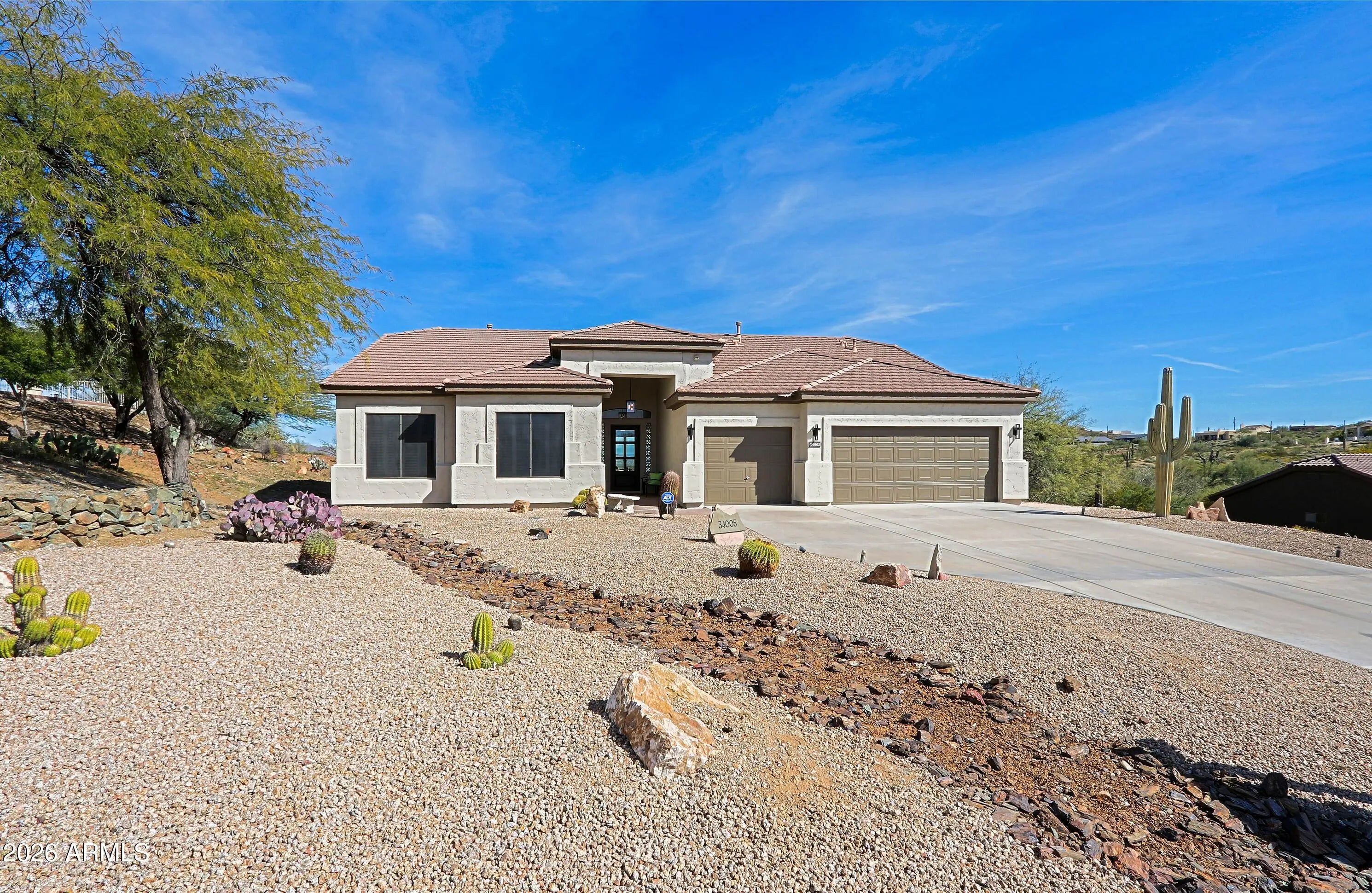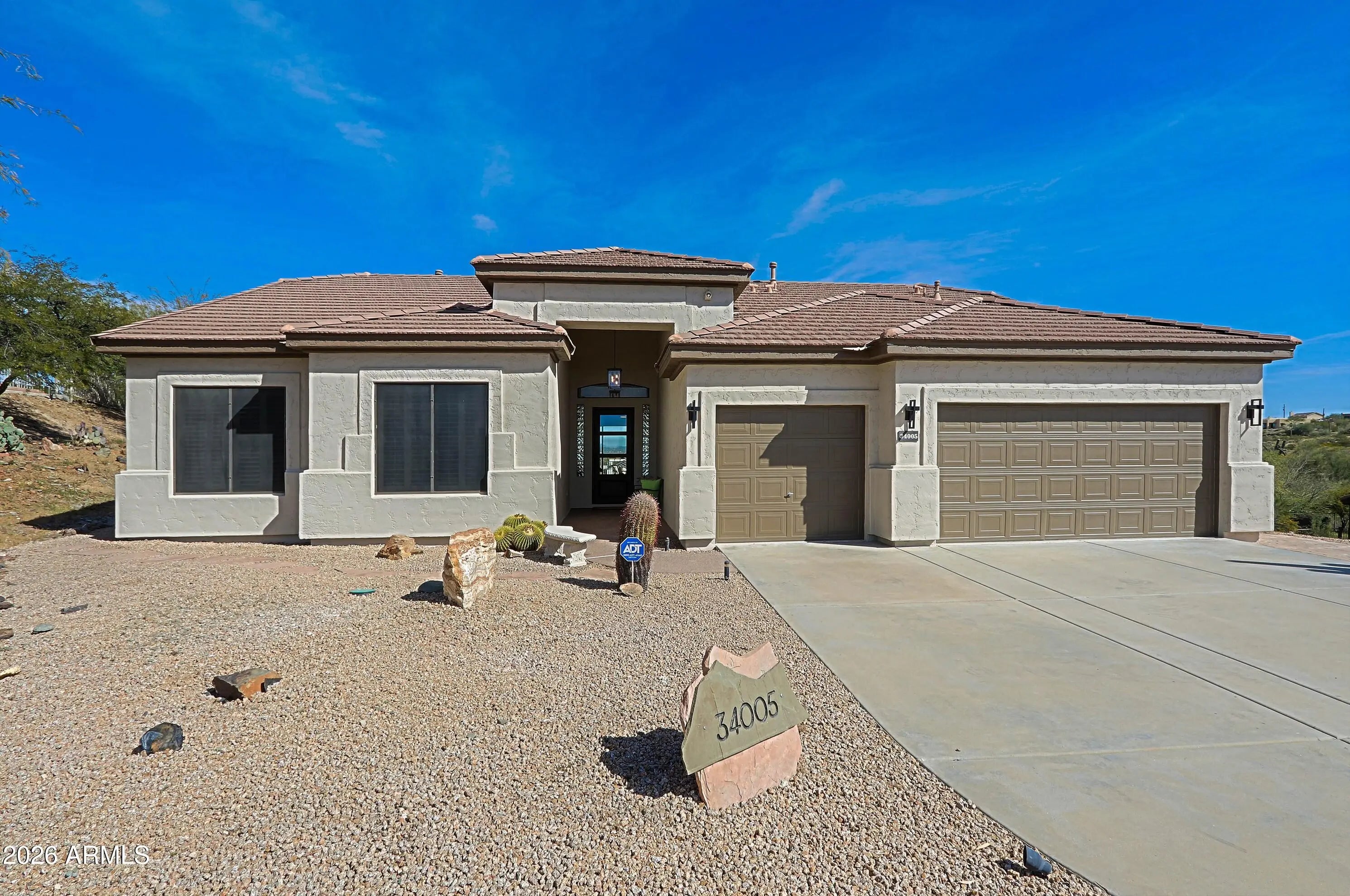 Views! Desirable Desert Hills, great location, easy access to I-17, unobstructed spectacular mountain views, paved roads, city water, S/W gas, large 1 acre lot . Tastefully renovated in modern Farm house style, move in ready. Spacious open floorplan, great room opens to back patio 14 ft sliding door. Master suite offers electric fireplace, wet bar, double sinks, walk in closet separate, large shower, exit to back patio. Gourmet kitchen with induction cooktop, Ge Profile appliances, Quartz countertops, Custom Shaker cabinets, Pendent lights, kitchen island... Highly upgraded with plank tile flooring t/o the house, Custom Wrought Iron front door, 3 fireplaces, 2 wet bars, plantation shutters, barn doors, large laundry room with storage cabinets, extended 3 car garage with epoxy flooring.. 8 ft interior doors, Milgard windows, gas water heater, This home is a must to see. home warranty included. Do not miss opportunity to own this beautiful property and fast growing area by TSMC