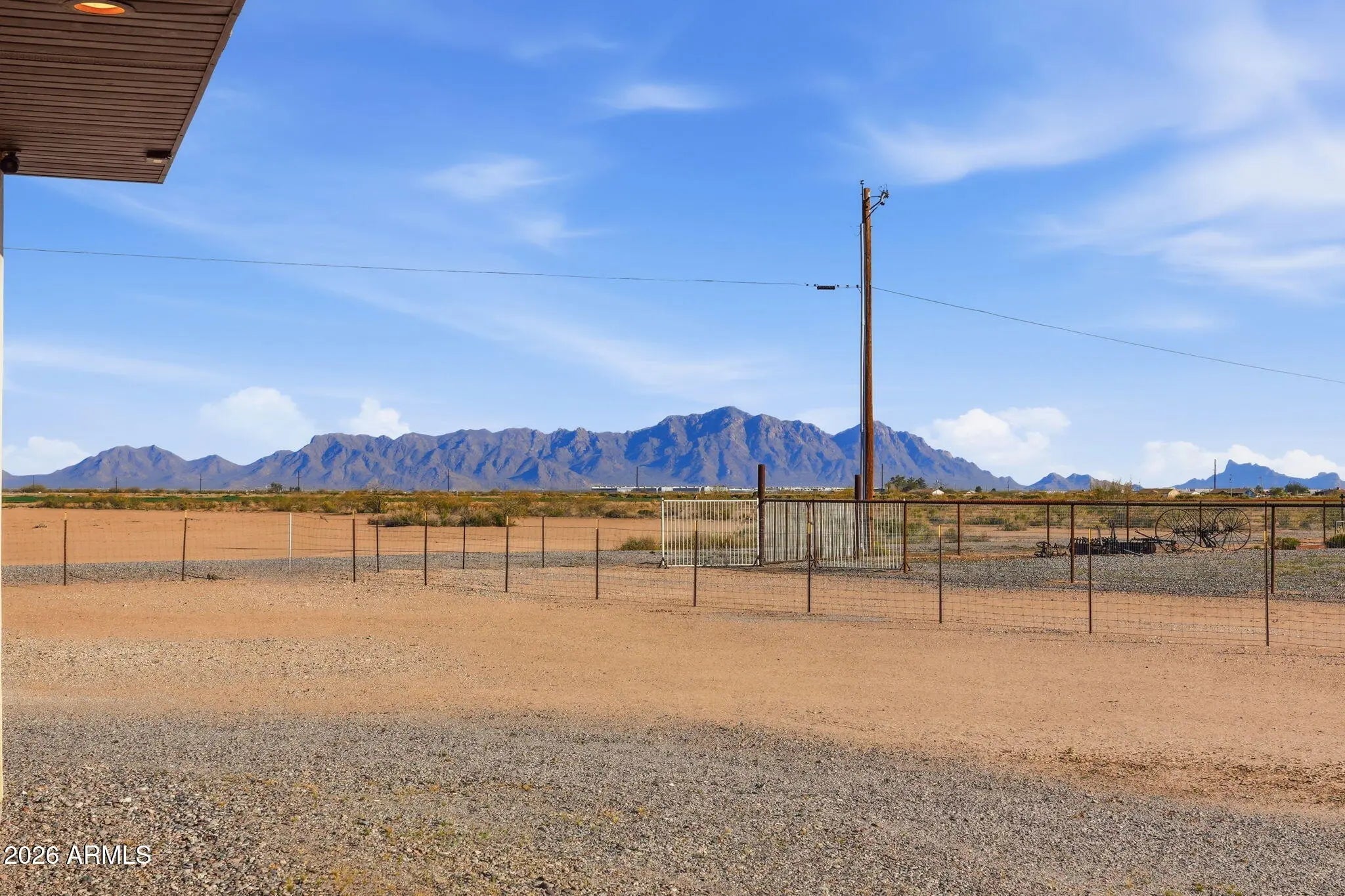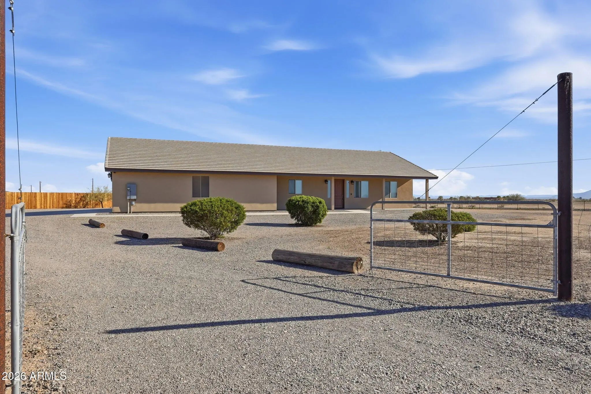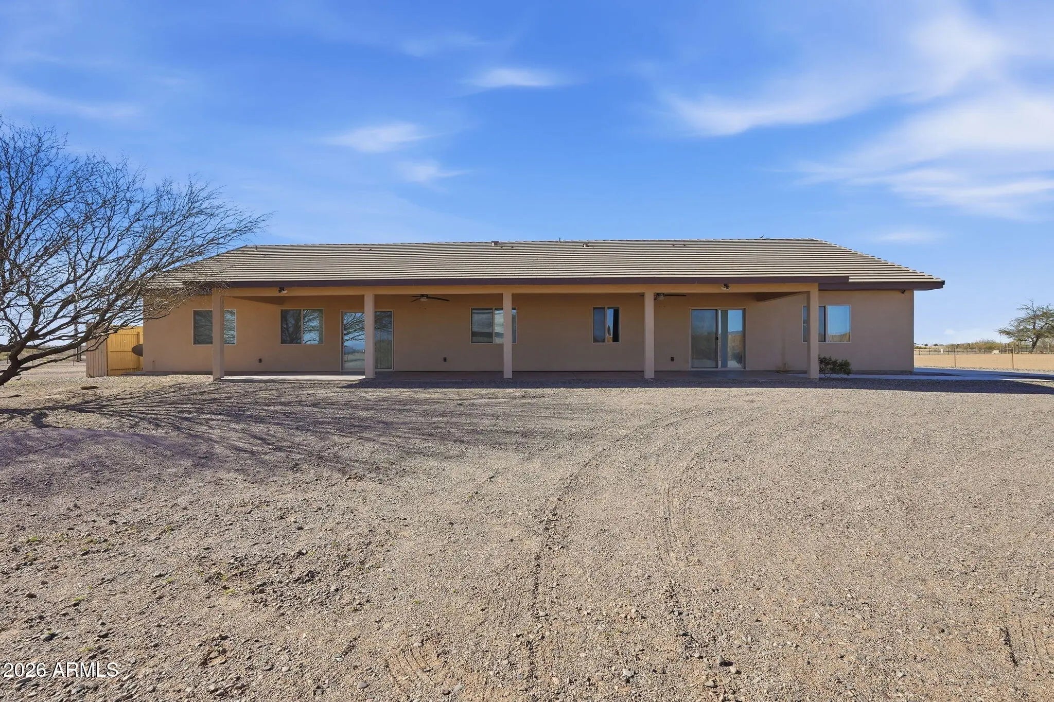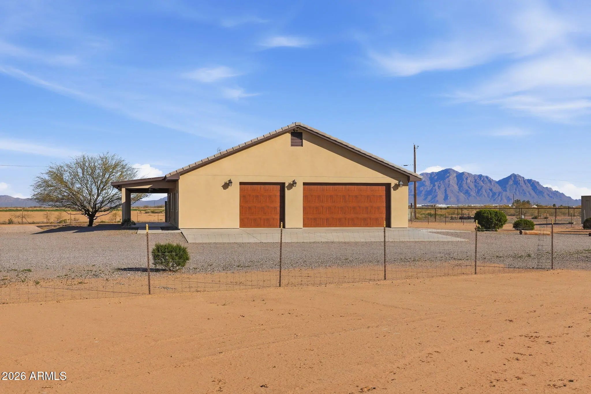 Looking for a truly custom-built home with the features that actually matter? This thoughtfully designed 4 bedroom, 2 bathroom home combines quality construction, energy efficiency, and everyday functionality, all set against beautiful mountain views. Built with 2x6 construction and blown cellulose insulation for superior efficiency, this home also features dual HVAC units, a tile roof, dual-pane windows, whole-house exhaust system, and a water heater with recirculation pump. The extended-length 3-car garage offers 8-foot doors, epoxy floors, and additional storage, plus attic access with drop-down stairs leading to a large decked storage area. Inside, you will love the low-maintenance concrete flooring, vaulted ceilings, recessed lighting, abundant natural light, and ceiling fans throughout. The spacious kitchen offers quartz countertops, matching stainless steel appliances, a range hood, farmhouse sink with peaceful window views, breakfast bar, generous cabinetry, and additional pantry storage in the oversized laundry room. The primary suite features 9-foot ceilings, two ceiling fans, wall-mounted TV wiring, and a large walk-in closet complete with custom wall units, pull-out drawers, and shelving. The en-suite bath includes a jetted soaking tub and separate walk-in shower. The laundry room provides extensive cabinetry, space for a second refrigerator or freezer, and even mountain views while you work. An additional air-conditioned flex room off the garage, with its own private entrance from the back patio, makes the perfect office, guest space, gym, tack room, or hobby room. All of this sits on 1.25 acres of horse-fenced horse property designed for country living. Bring your horses, trailers, toys, and equipment with room to grow. There is covered RV parking with full hookups and plenty of space for trailers and ranch equipment. The adjoining lot is also available, giving you the opportunity to expand to a full 2.5 acres. The additional parcel already has electric and water to the property, making it ideal for building a barn, arena, custom shop, full horse setup, or even a second home for multi-generational living. Two full-length covered patios provide the perfect setting to relax after a ride, take in the mountain views, and enjoy stunning Arizona sunrises and sunsets. Move-in ready and built with intention, this is the kind of property that offers both comfort and capability for true Arizona horse property living.