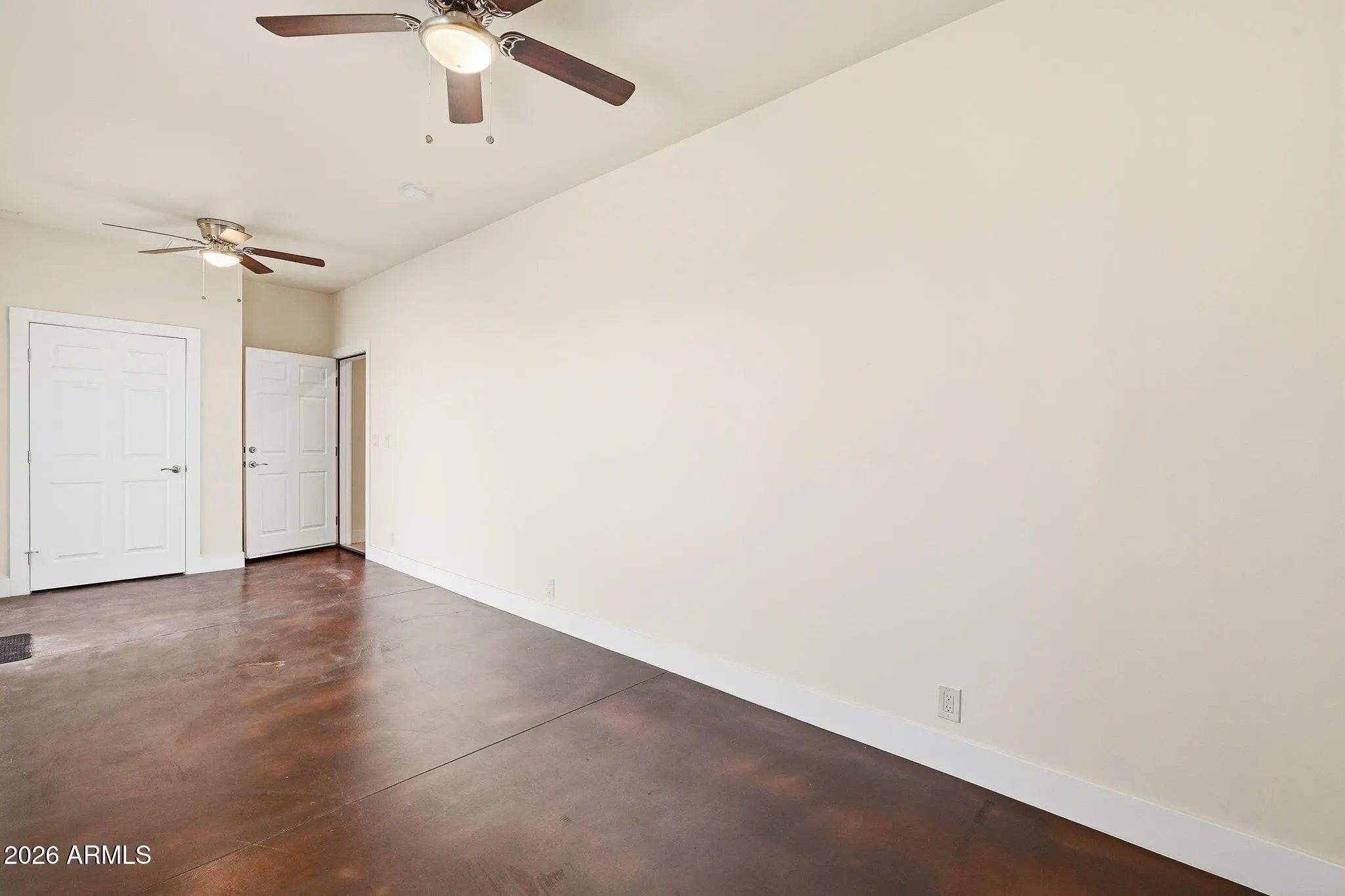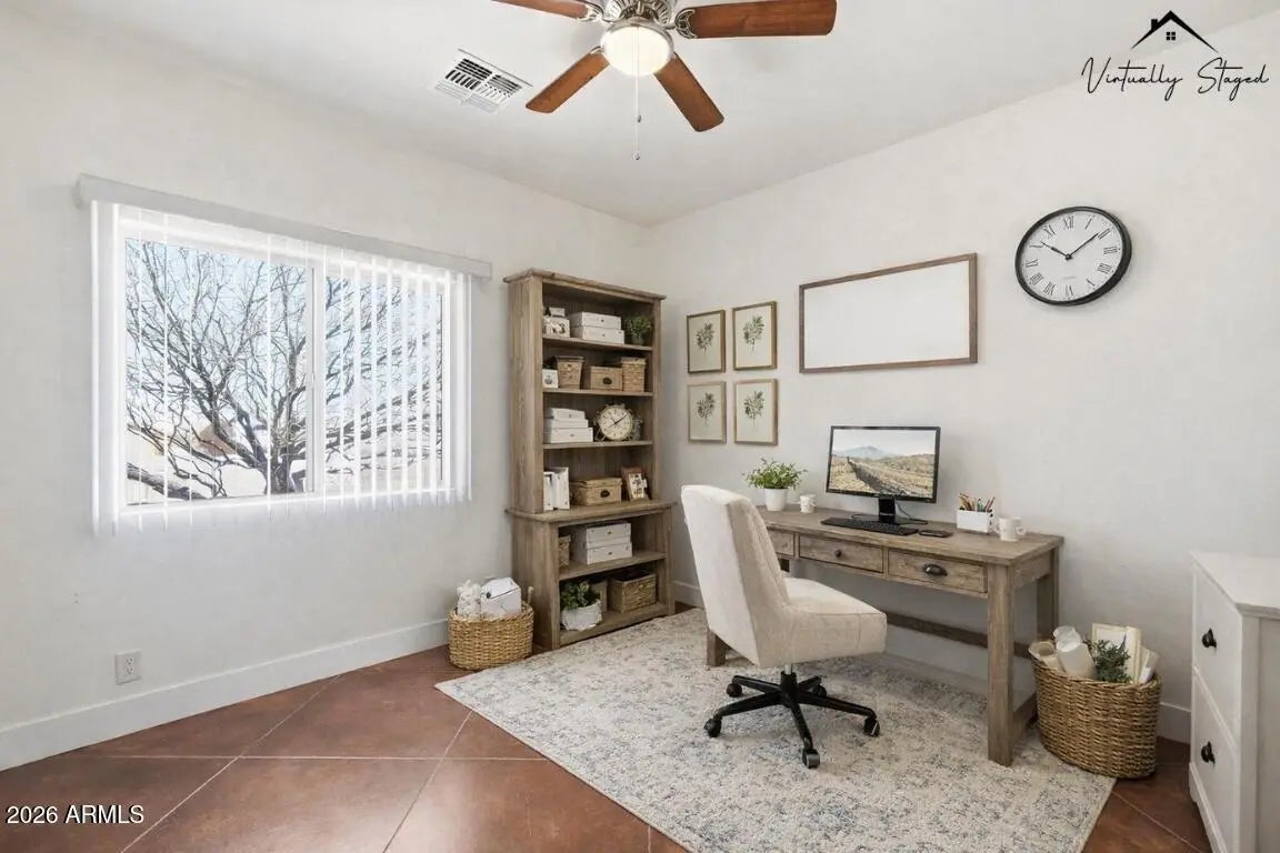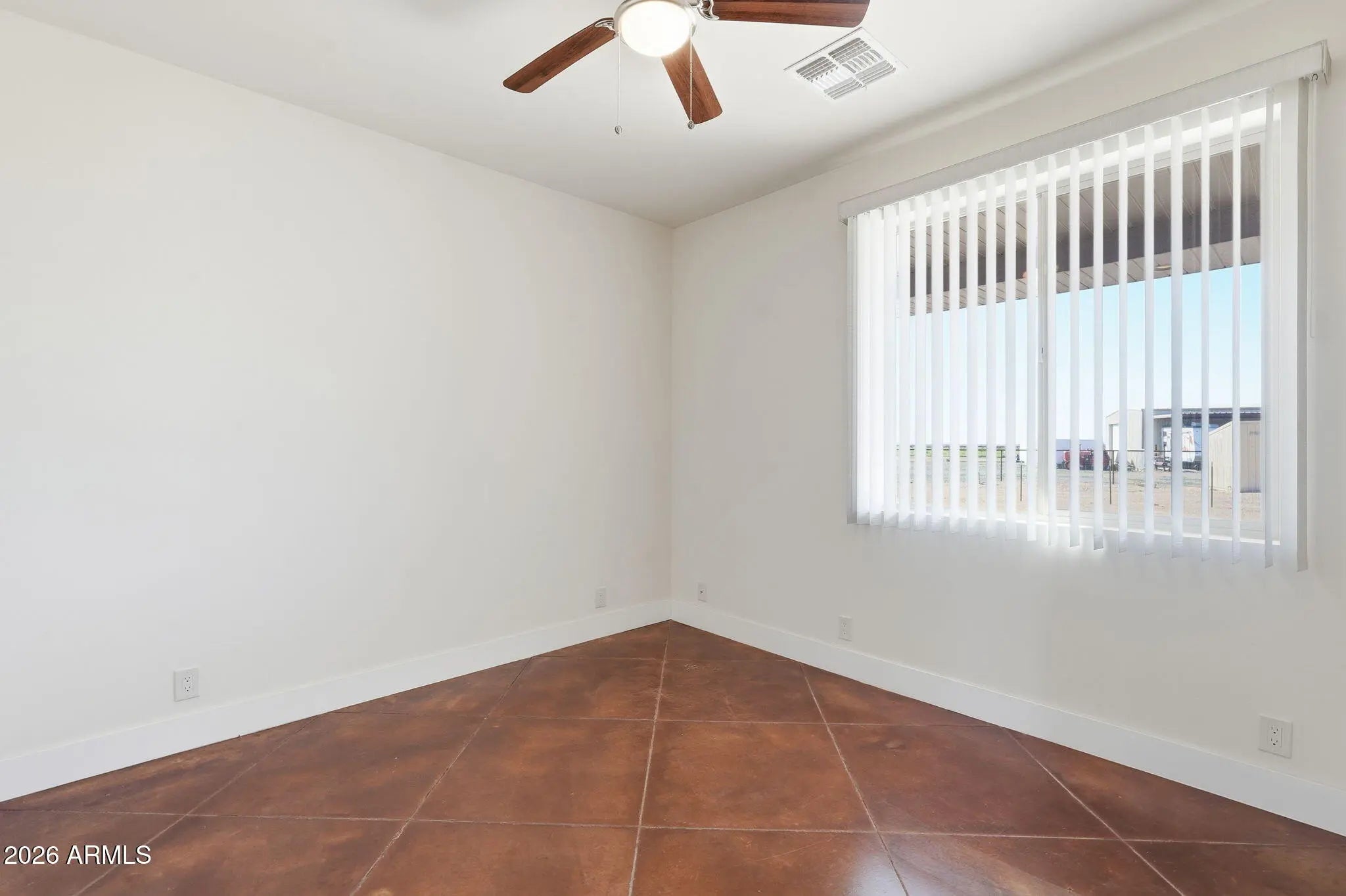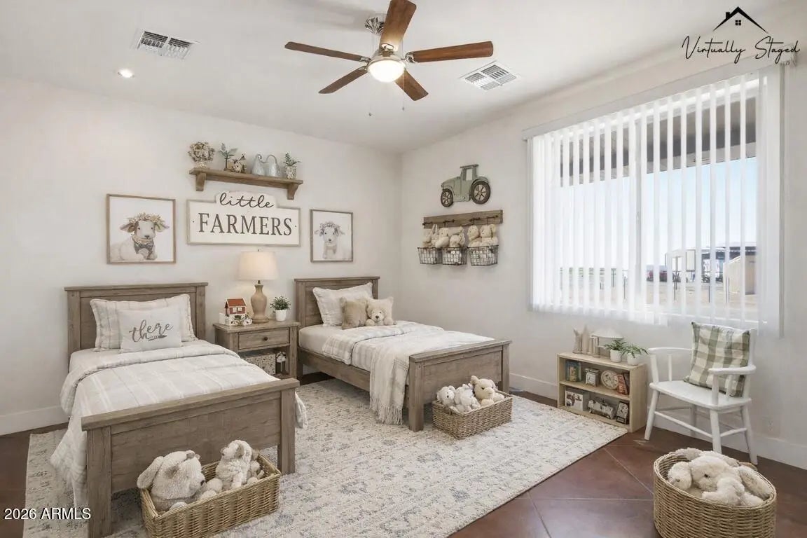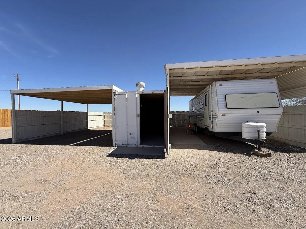 Looking for a truly custom-built home with the features that actually matter? This thoughtfully designed 4 bedroom, 2 bathroom home combines quality construction, energy efficiency, and everyday functionality, all set against beautiful mountain views. Built with 2x6 construction and blown cellulose insulation for superior efficiency, this home also features dual HVAC units, a tile roof, dual-pane windows, whole-house exhaust system, and a water heater with recirculation pump. The extended-length 3-car garage offers 8-foot doors, epoxy floors, and additional storage, plus attic access with drop-down stairs leading to a large decked storage area. Inside, you will love the low-maintenance concrete flooring, vaulted ceilings, recessed lighting, abundant natural light, and ceiling fans throughout. The spacious kitchen offers quartz countertops, matching stainless steel appliances, a range hood, farmhouse sink with peaceful window views, breakfast bar, generous cabinetry, and additional pantry storage in the oversized laundry room. The primary suite features 9-foot ceilings, two ceiling fans, wall-mounted TV wiring, and a large walk-in closet complete with custom wall units, pull-out drawers, and shelving. The en-suite bath includes a jetted soaking tub and separate walk-in shower. The laundry room provides extensive cabinetry, space for a second refrigerator or freezer, and even mountain views while you work. An additional air-conditioned flex room off the garage, with its own private entrance from the back patio, makes the perfect office, guest space, gym, tack room, or hobby room. All of this sits on 1.25 acres of horse-fenced horse property designed for country living. Bring your horses, trailers, toys, and equipment with room to grow. There is covered RV parking with full hookups and plenty of space for trailers and ranch equipment. The adjoining lot is also available, giving you the opportunity to expand to a full 2.5 acres. The additional parcel already has electric and water to the property, making it ideal for building a barn, arena, custom shop, full horse setup, or even a second home for multi-generational living. Two full-length covered patios provide the perfect setting to relax after a ride, take in the mountain views, and enjoy stunning Arizona sunrises and sunsets. Move-in ready and built with intention, this is the kind of property that offers both comfort and capability for true Arizona horse property living.
