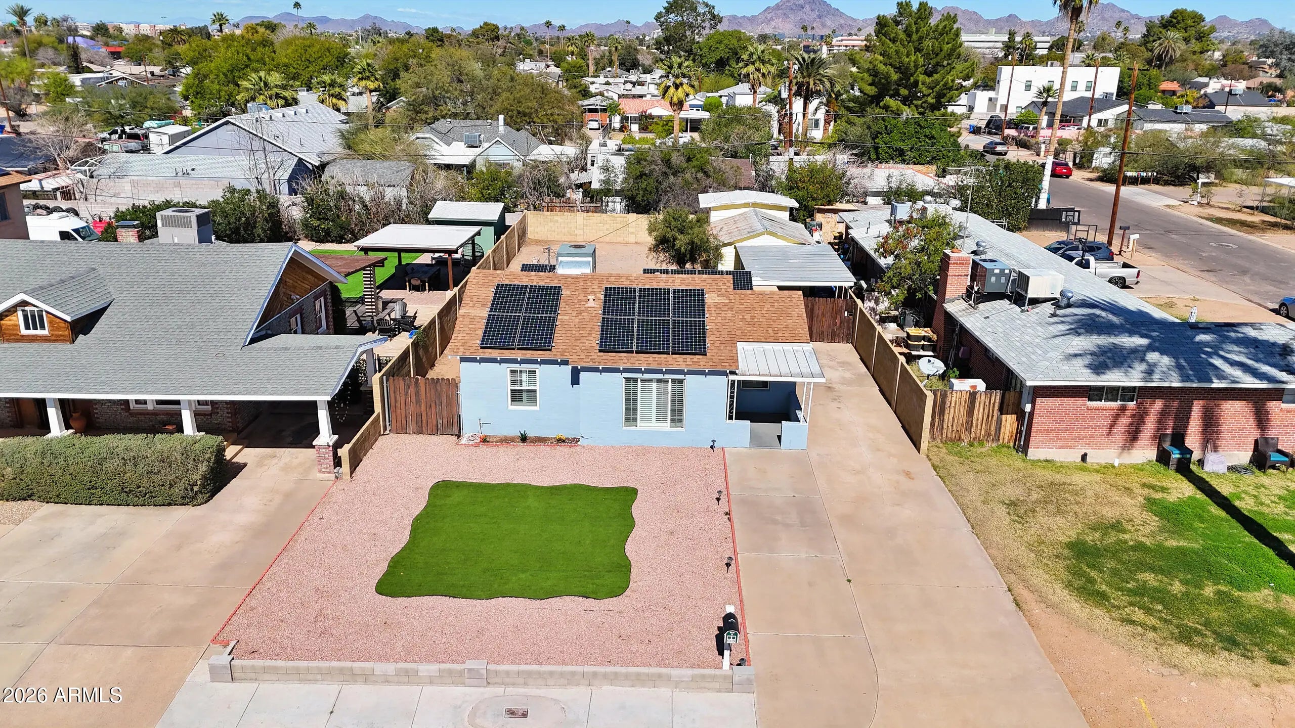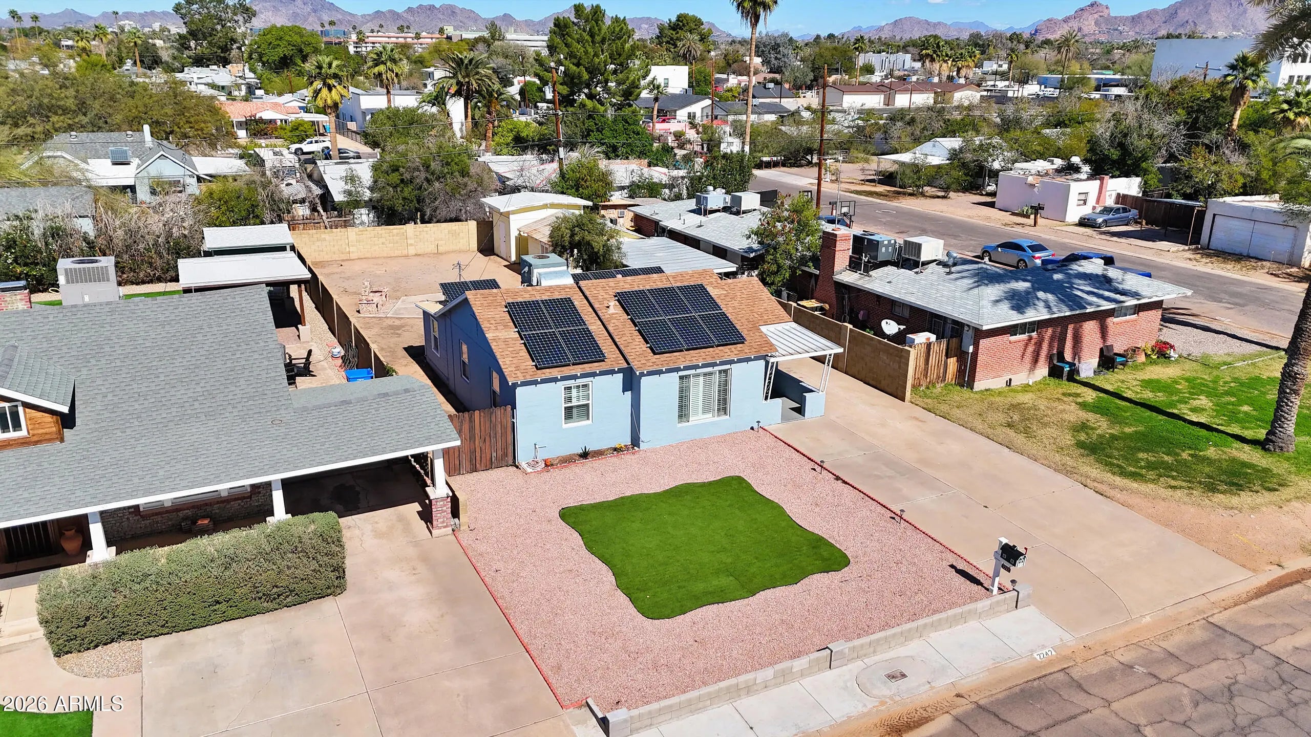 WOW! This midcentury charmer is ready for it's new owner. No HOA in the heart of eclectic DT Phx, this beauty has been lovingly elevated with quality materials & finishes w/ a modern kitchen, SS appliances, gorgeous quarts kitchen counters & tiled bathroom & shower. Vinyl plank throughout main areas & carpet in 2 bedrooms. Solar panels provide unbelievable energy savings! Enjoy easy access to downtown living at Chase Field, ASU DT, Phx Arena, dining, the arts, major freeways, all while having an oversized lot rarely found in a DT area. Tons of storage in the large shed & detached garage. Lg yard is ready for your personal touch. This turn-key property is full of personal touches and love! Explore this gem today!