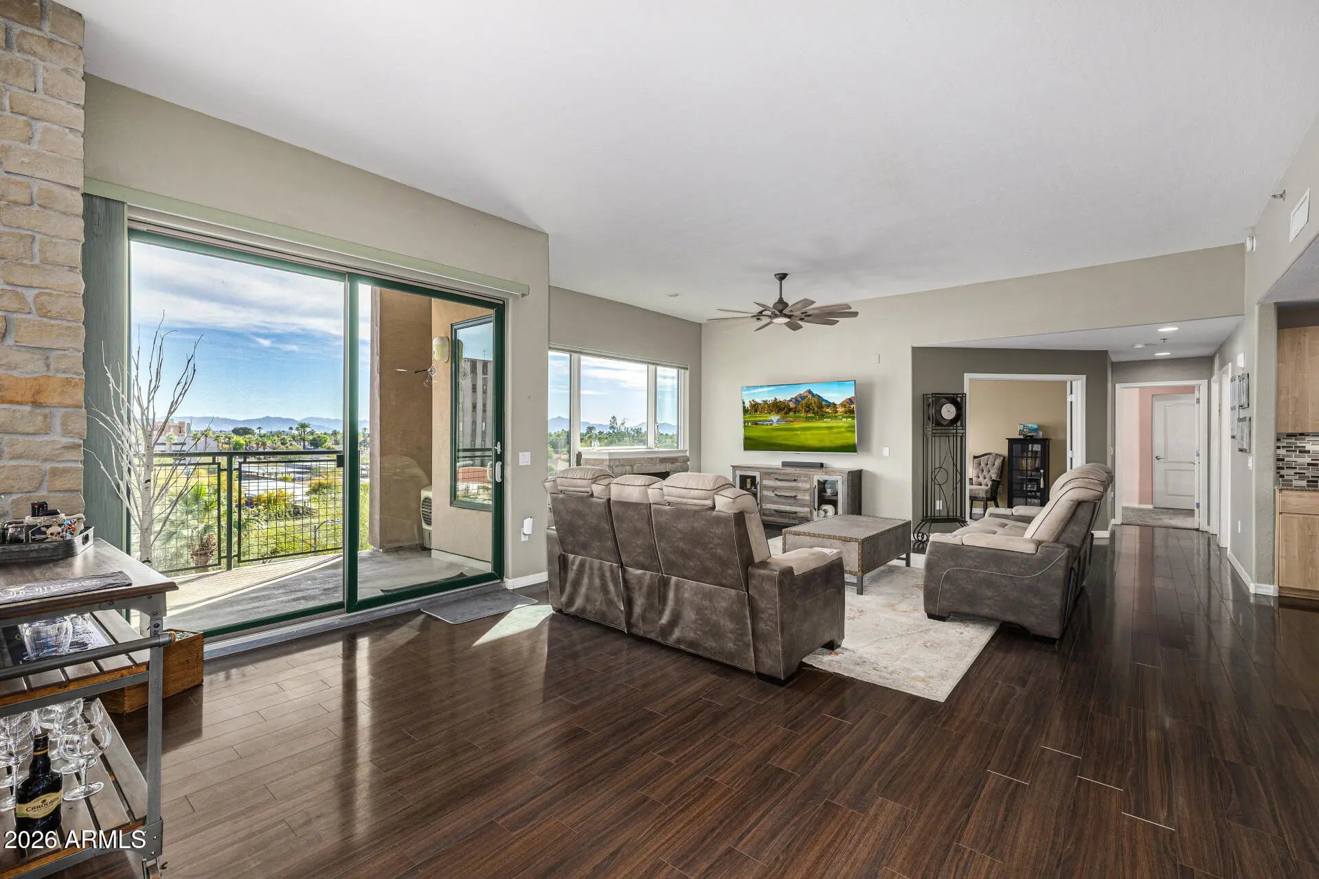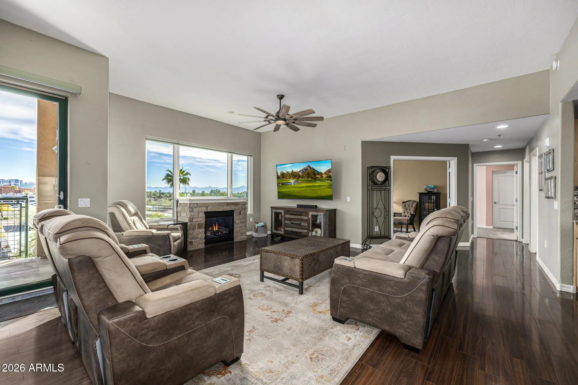 Experience exceptional living at Tapestry on Central! Perfectly situated in the heart of Phoenix, this vibrant location places you steps away from an abundance of restaurants, shops, cafes, and entertainment. The Light Rail provides easy access to both Downtown and Midtown, making your commute seamless & convenient. This 4th-floor condo boasts a stunning open floor plan with expansive windows that flood the space with natural light and offer spectacular views. Discover a sophisticated soft gray palette, elegant laminate flooring, an inviting fireplace, and stone accents in the right places. The magazine cover kitchen features recessed lighting, ample storage, tile backsplash, granite countertops, stainless steel appliances, and a spacious island. Enjoy two private balconies with unbelievable views of downtown Phoenix and surrounding mountain's - ideal spaces for both relaxation and entertaining. The lavish main suite showcases a custom accent wall, plush carpeting, breathtaking views, balcony access, and an oversized walk-in closet. The ensuite bathroom offers dual granite vanities and a relaxing soaking tub. A second main bedroom provides its own balcony, full bathroom, and walk-in closet. The generous balcony with sweeping views of the mountains and city is perfect for enjoying colorful sunsets. Enjoy resort-style amenities including gym, cinema, sauna, pool, spa, grills, and more. Don't miss this one-of-a-kind opportunity!