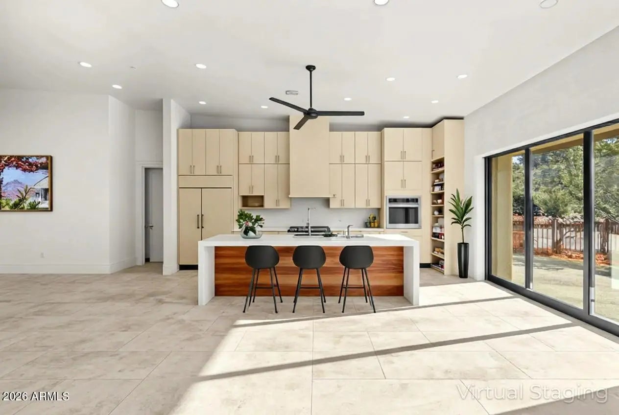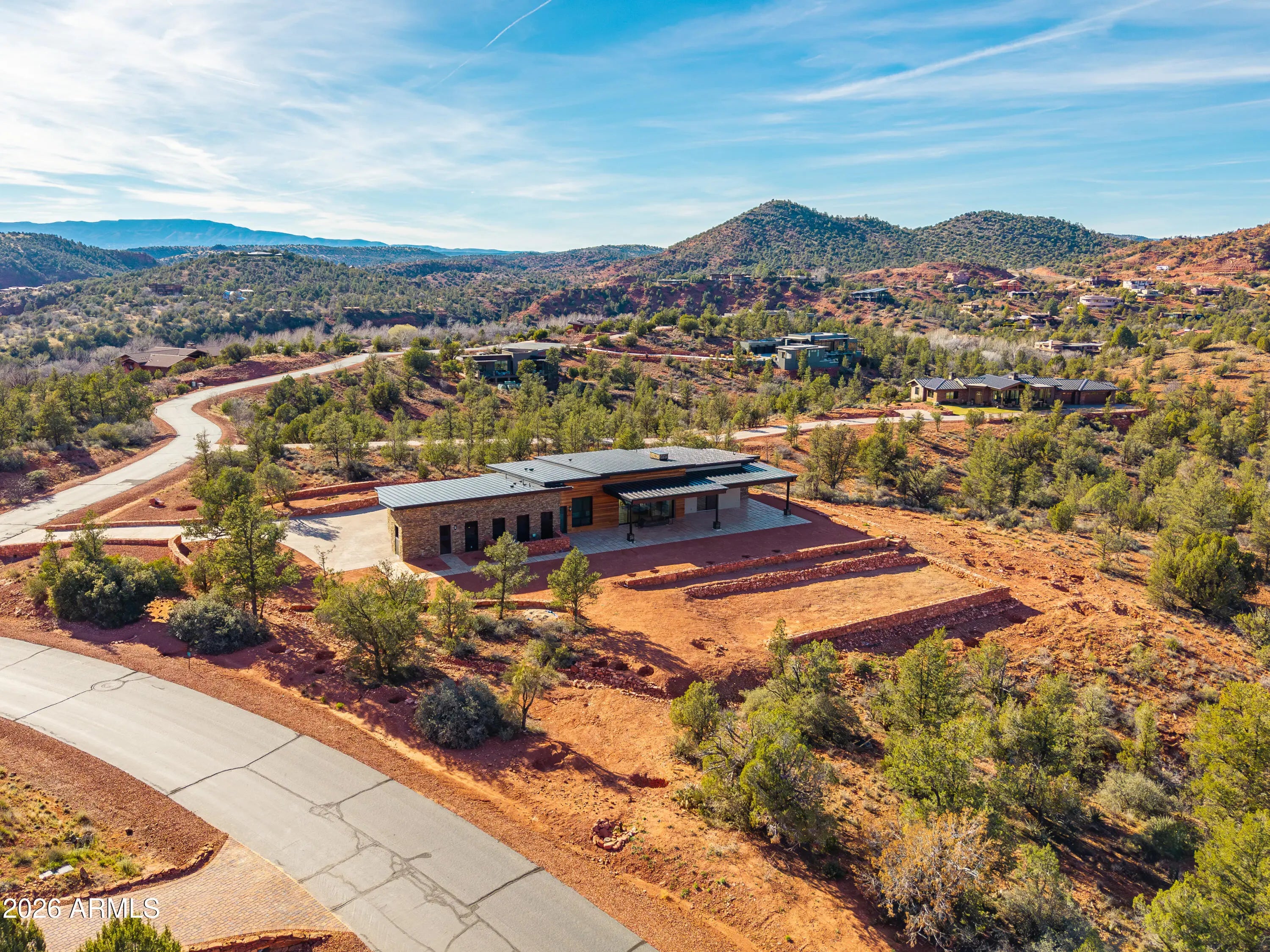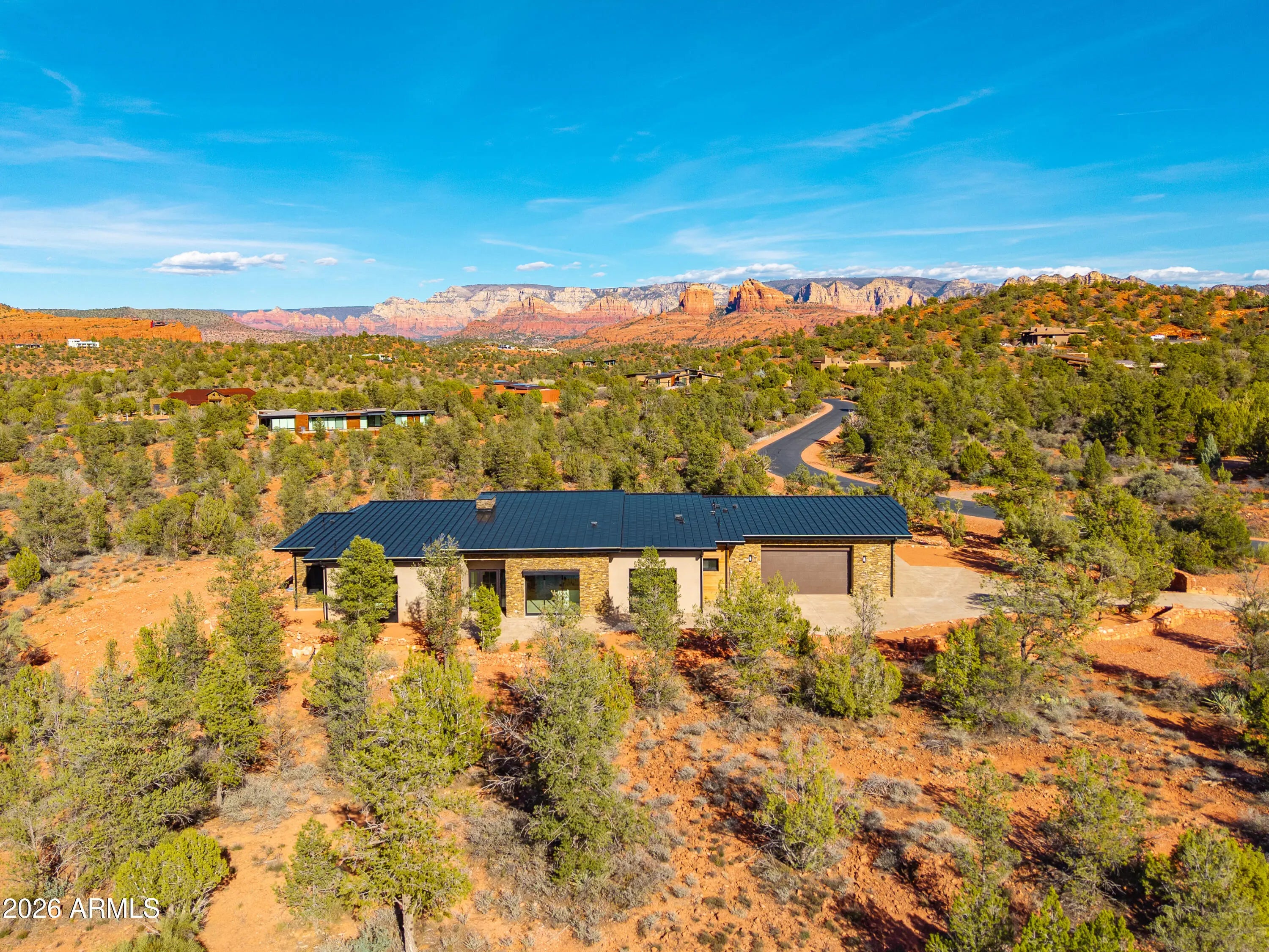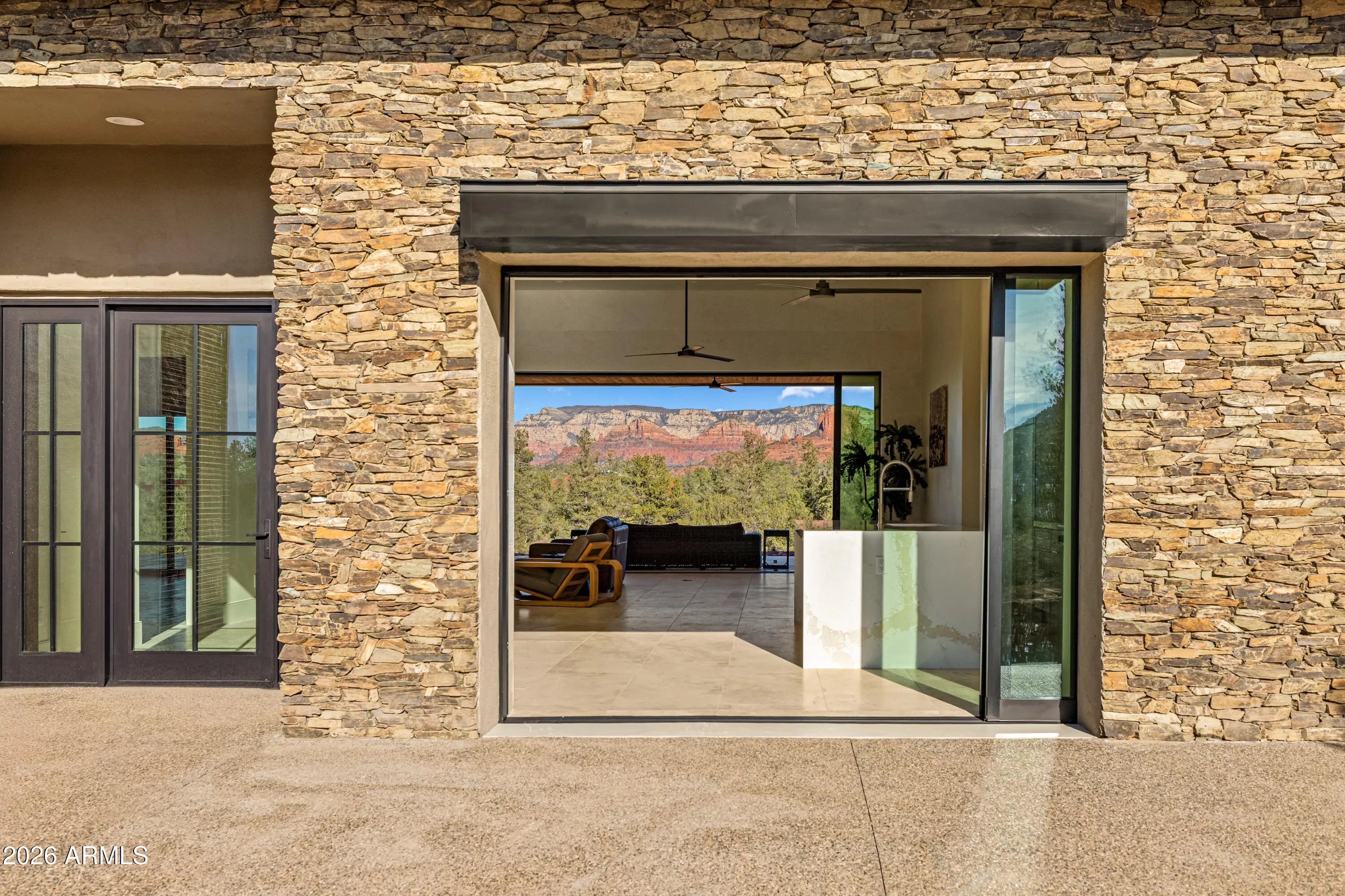 The perfect traffic-free location in Sedona. Feel an immediate sense of escape from the world within your indoor/outdoor backyard oasis of stunning panoramic views and zen-like tranquility. The tourists are on the other side of town. This high-end gated community affords easy access to Phoenix and beyond. A study in enduring construction, built with 8-inch insulated concrete forms (ICF), natural stone, fire-treated redwood, and a metal roof, the home was designed for longevity, resilience, and exceptional thermal performance. Thick walls create deep-set windows and a sense of permanence rarely found in contemporary builds. Cross-ventilation and expansive openings help keep the home comfortable for much of the year, minimizing the need for mechanical heating and cooling. Telescoping window glass doors dissolve the boundary between indoors and out, inviting gentle desert breezes and uninterrupted red rock vistas into the living spaces. At the heart of the home, an entertainer's kitchen and gathering space open seamlessly to a redwood-accented travertine terrace. A full wall of retracting glass frames Cathedral Rock in cinematic fashion, making for an unforgettable backdrop. The floor plan is intentionally scaled, intimate yet open. All the bedrooms have soundproof walls for privacy. The primary suite offers a serene retreat with an adjoining den, office, fitness studio, or optional bedroom. Two additional guest suites, each with private entrances and dramatic views, are designed with flexibility in mind. There is a new washing machine near the primary suite. In addition, there is a washer-dryer hookup in the garage. Plumbing and 220V power have been thoughtfully installed in the master and 4th bedroom to accommodate future concepts, an art studio, a caretaker kitchenette, or a wellness space. An extended 2.5 car garage with dramatic view windows and workshop-ready 220V service supports creative pursuits or collector needs. A sprinkler alarm will alert the local fire station in the event of a fire. Approach along a sweeping drive bordered by handcrafted red rock walls quarried directly from the site and reinforced with concrete and rebar. Real stacked-stone accent panels complement refined redwood details, creating a cohesive architectural narrative rooted in the land itself. The exterior is prepared for personalization: " Irrigation infrastructure and approved planting plans are in place " Stone-lined drainage washes installed " Power and plumbing are ready for a future spa or pool " Pebbled aggregate driveway and parking court for a polished arrival The home's neutral interior palette, Italian tile, quartz surfaces, and natural finishes provide a sophisticated blank canvas for a discerning owner's aesthetic vision. A rare natural Legacy, Cross Creek Ranch is one of Sedona's most treasured private enclaves, defined by lush meadows, cottonwood and sycamore groves, amber cliffs, and panoramic red rock vistas. Historic 1880s irrigation canals feed Oak Creek, creating a true oasis within the high desert. Modern convenience complements the tranquility, with newly installed fiber optic connectivity, providing seamless high-speed access for remote work and global connection. Seize this timely opportunity to acquire a custom-crafted Sedona estate built with intention, designed for longevity, and positioned within one of the region's most extraordinary private communities. Cross Creek Ranch has several access points into Red Rock State Park, where the hiking options are endless. For the buyer who values privacy, architectural substance, and an immersive connection to nature, this is Sedona at its most refined.