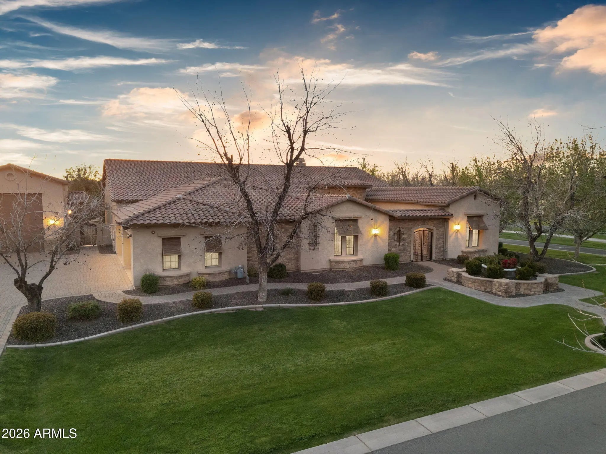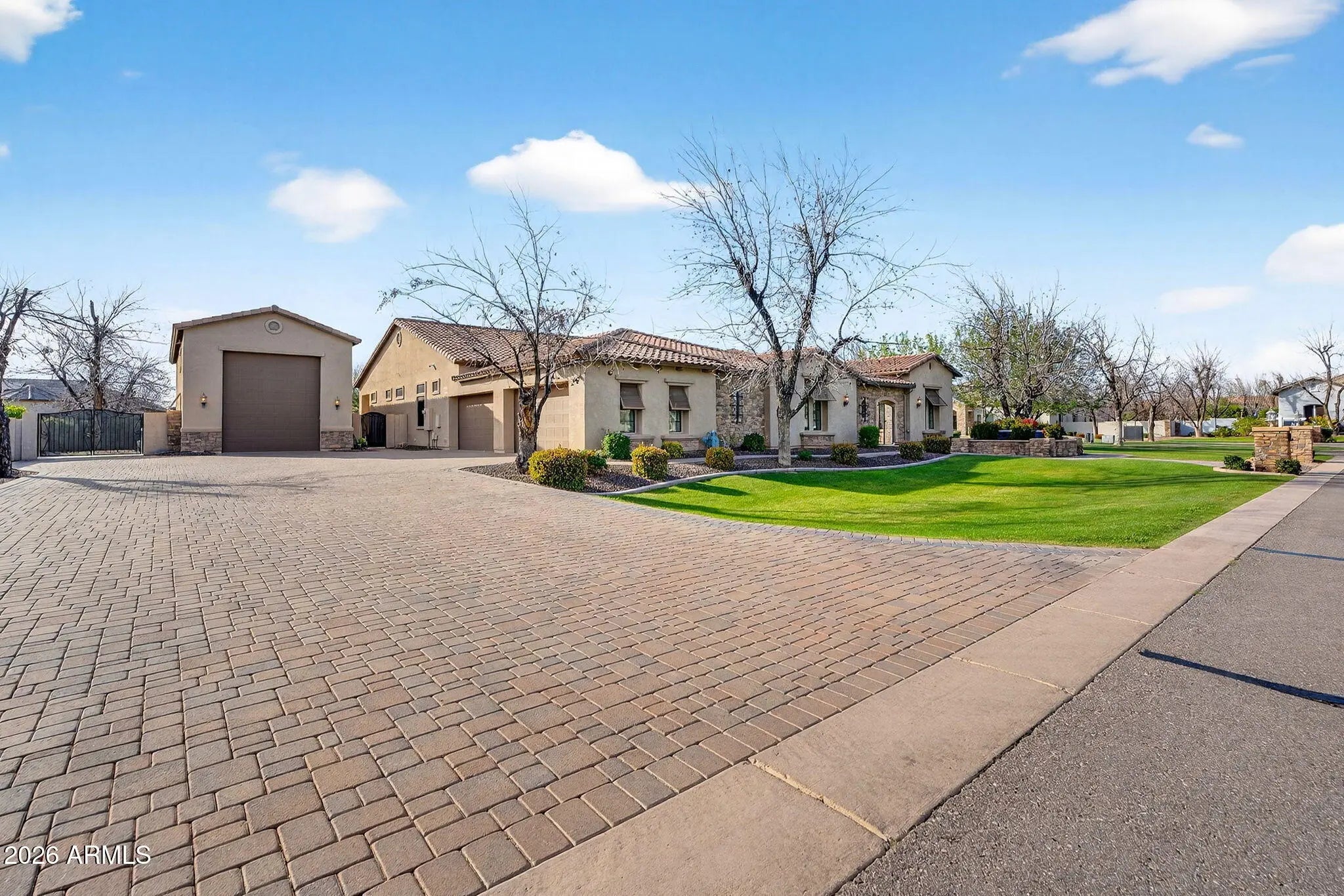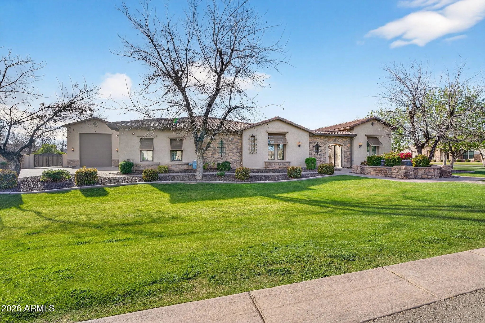 From the moment you enter the gates of Queen Creek's premier luxury community, The Pecans, with tree-lined streets, & stunning scenery, you feel transported. This single-level corner-lot home delivers exceptional design with spacious open living, soaring 12' ceilings, & a chef's kitchen with upscale appliances, oversized pantry, and a massive island. 5 bedrooms include ensuite baths, including two attached private suites on either side of the courtyard each with its own living area & separate bedroom, ideal for guests, multigenerational living, or a home office. The showstopper is the resort-style backyard with an approx. 75,000-gallon pool & huge spa & putting green. Complete with an attached 4-car garage + a rare oversized detached RV garage for an RV, cars or all your toys + more.. Interior just fully repainted, beautifully maintained throughout. Upgraded heated pool equipment with gas plus two heat pumps for added efficiency. Tons of parking with an expansive driveway. Gated courtyard with an attached casita/suite offering private access--perfect for a home office or guests. Spacious laundry room with abundant cabinetry, sink, and an overflow refrigerator. Expansive primary bath featuring a large walk-in shower, separate soaking tub area, split vanities, plus his-and-her closets. Exceptional oversized RV garage and more. Exceptional Queen Creek location close to Pecan Lake Entertainment. Olive Factory and so much more.