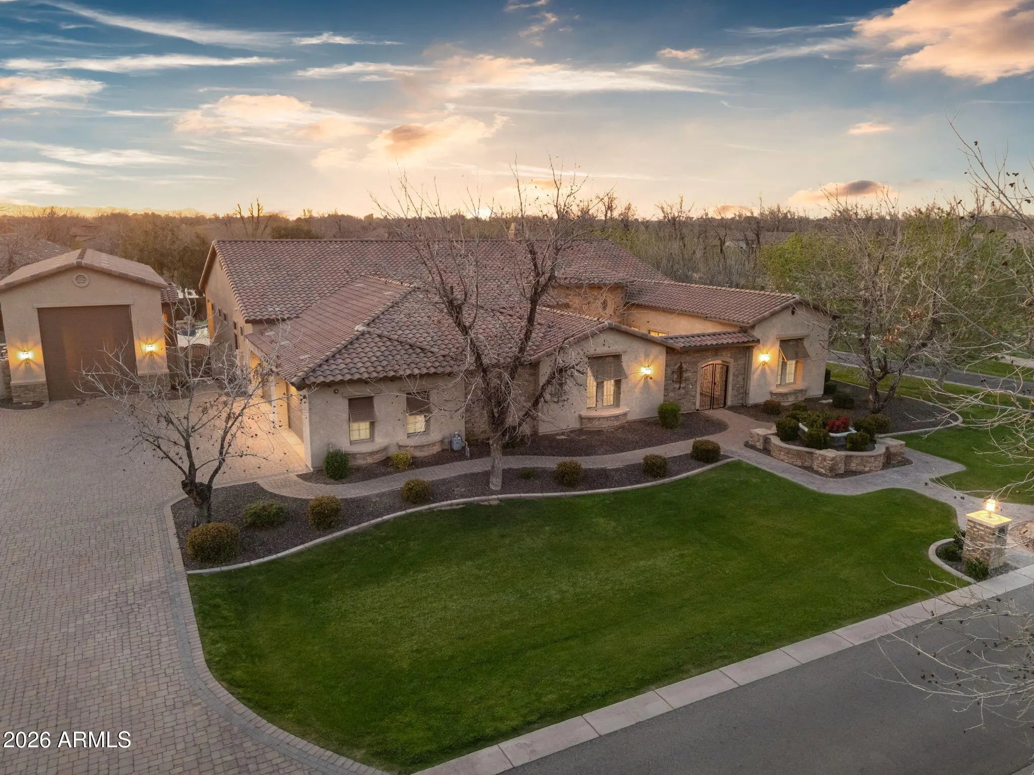 From the moment you enter the gates of Queen Creek's premier luxury community, The Pecans, with tree-lined streets, & stunning scenery, you feel transported. This single-level corner-lot home delivers exceptional design with spacious open living, soaring 12' ceilings, & a chef's kitchen with upscale appliances, oversized pantry, and a massive island. 5 bedrooms include ensuite baths, including two attached private suites on either side of the courtyard each with its own living area & separate bedroom, ideal for guests, multigenerational living, or a home office. The showstopper is the resort-style backyard with an approx. 75,000-gallon pool & huge spa & putting green. Complete with an attached 4-car garage + a rare huge 50 x 20 detached garage for an RV, cars or all your toys + more.. Interior just fully repainted, beautifully maintained throughout. Owner added over $200,000 of additional upgrades such as upgraded heated pool equipment with gas plus two heat pumps for added efficiency. Tons of parking with an expansive driveway and additional slab behind gate, beside RV Garage, Enclosed for privacy the 2 attached casitas, added closet and more. Gated courtyard with an attached casita/suite offering private access--perfect for a home office or guests. Spacious laundry room with abundant cabinetry, sink, and an overflow refrigerator. Expansive primary bath featuring a large walk-in shower, separate soaking tub area, split vanities, plus his-and-her closets. Exceptional oversized RV garage and more. Exceptional Queen Creek location close to Pecan Lake Entertainment. Olive Factory and so much more.