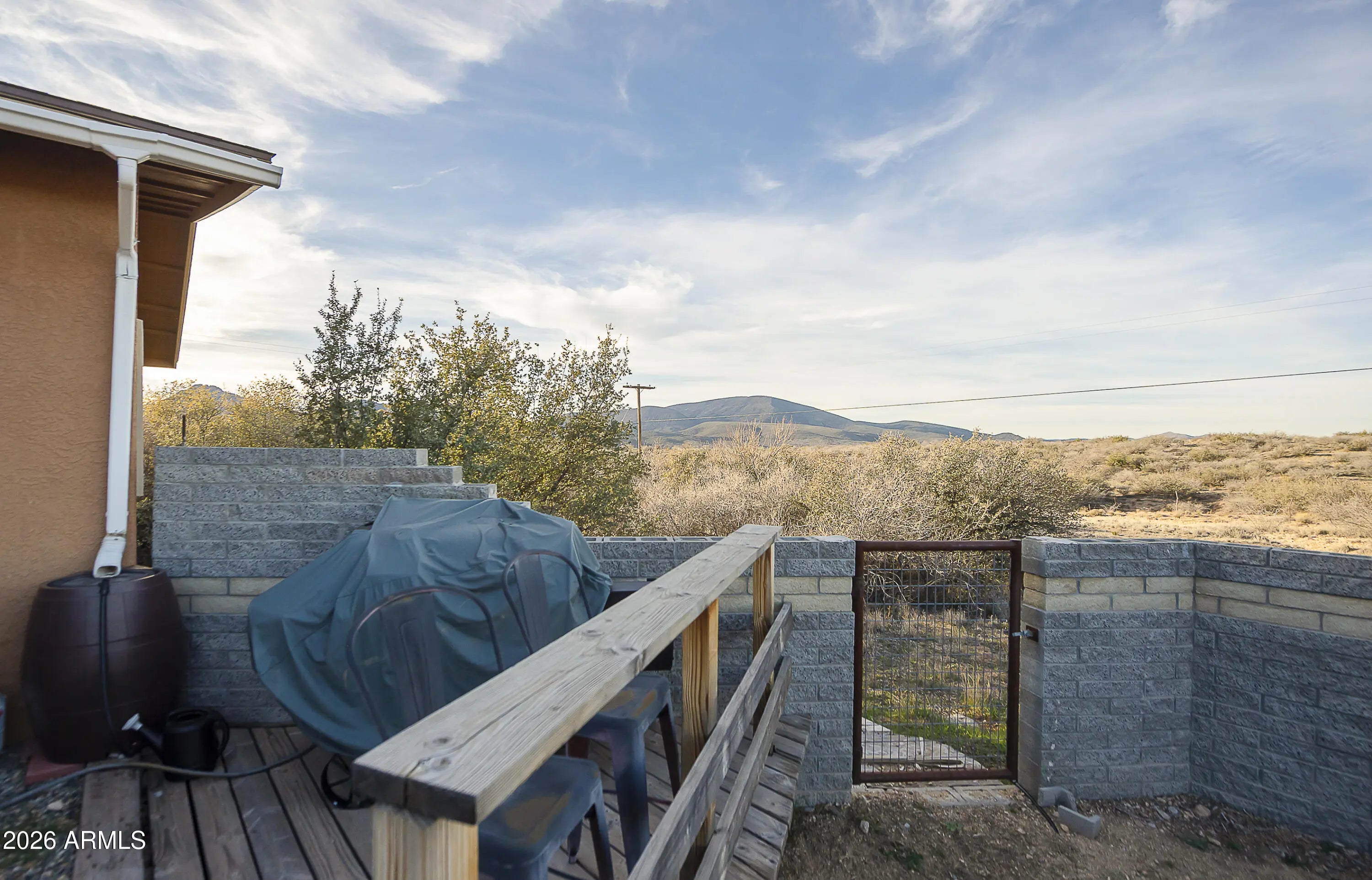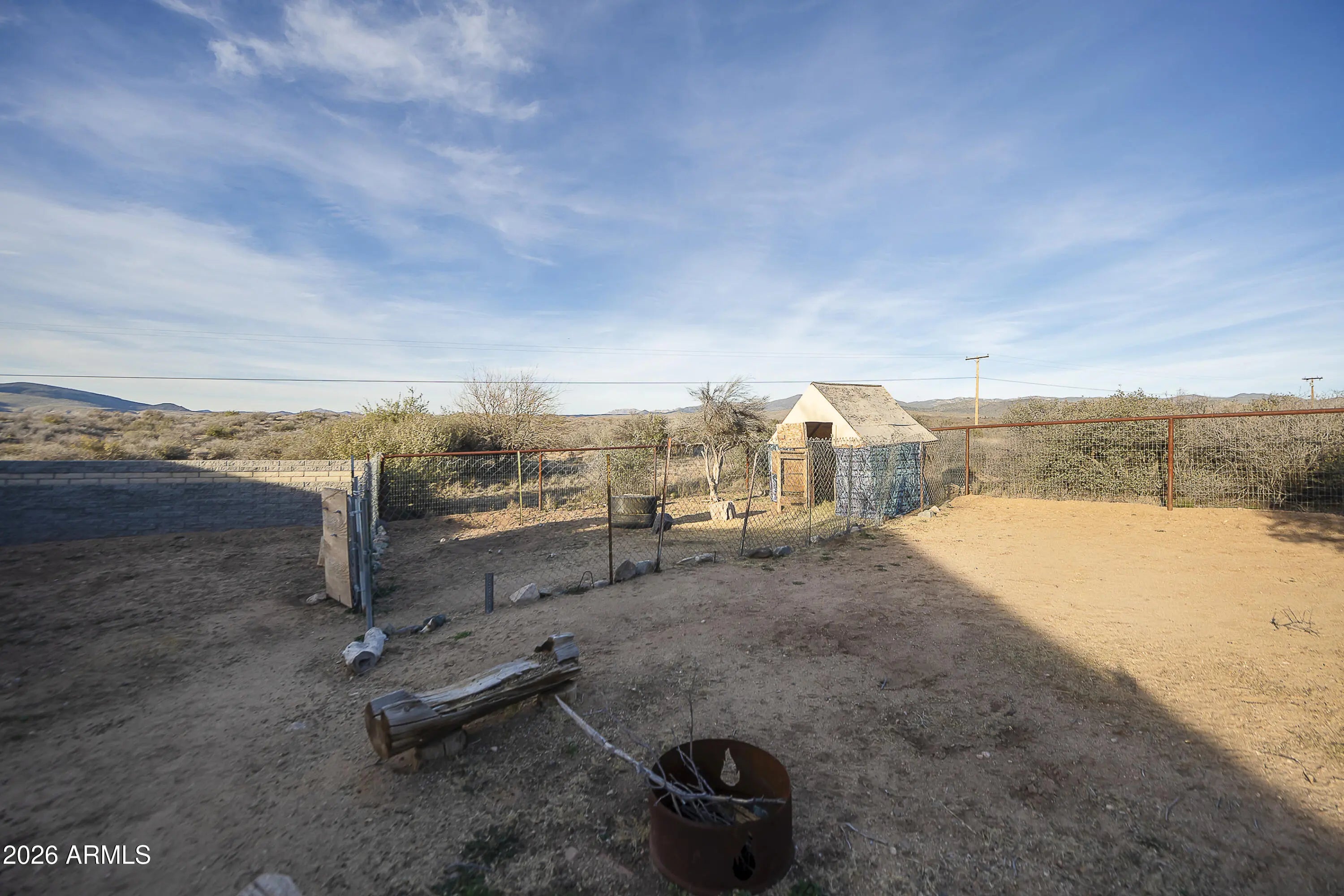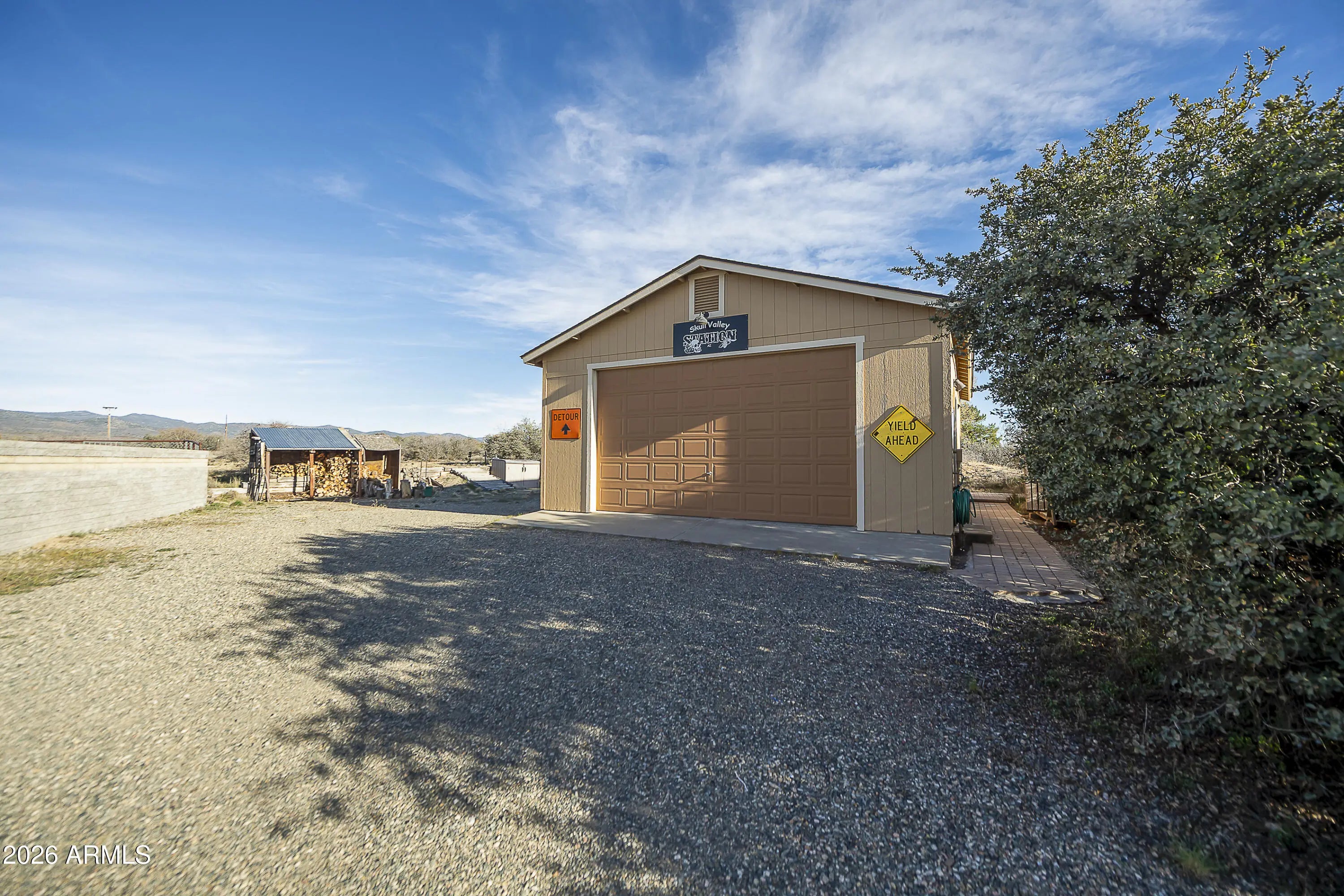 Nestled in scenic Skull Valley, this beautifully maintained home sits on 2.42 acres and captures breathtaking panoramic mountain views in every direction. The main residence offers 3 bedrooms and 2 bathrooms, along with an attached 2+ car garage. In addition, you'll find a detached RV garage/workshop and a separate guest casita--ideal for visitors, hobbies, or extra workspace. RV garage has it's own septic and RV Dump!The island kitchen is thoughtfully designed with recessed lighting, slate tile flooring, slab granite countertops, and a custom backsplash. The open living and dining area features upgraded luxury vinyl plank flooring, creating a warm and inviting space for everyday living or entertaining. Relax year-round in the Arizona Room, complete with a cozy wood-burning stove and French doors leading to the patio.The spacious primary suite includes a ceiling fan, private bath, and walk-in closet. Comfort is ensured year-round with an efficient heat pump providing both heating and cooling. Recent updates and features include a newer roof (2017), skylights, and solar for added efficiency. The private well (165 feet deep, producing 35 GPM) provides an excellent water supply.Outside, enjoy a fenced yard, patio and deck areas, raised garden beds, and irrigation in both the front and back yards--perfect for taking advantage of the peaceful rural setting. The included hot tub is a great way to wind down in the evenings and enjoy our clear night skies and plentiful stars!Located in the Skull Valley School District, this well-cared-for property offers space, functionality, energy efficiency, and stunning views--truly a wonderful place to call home.