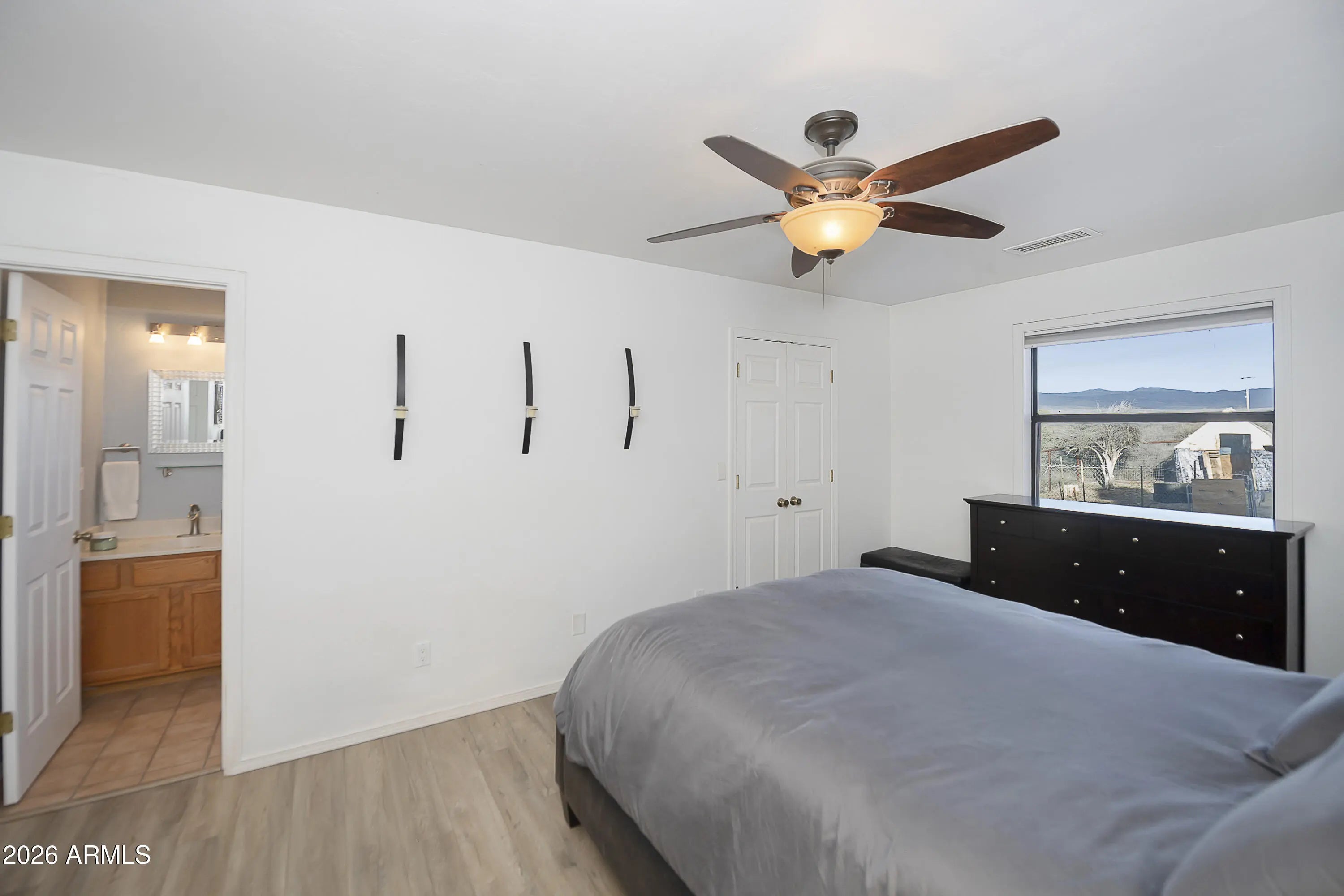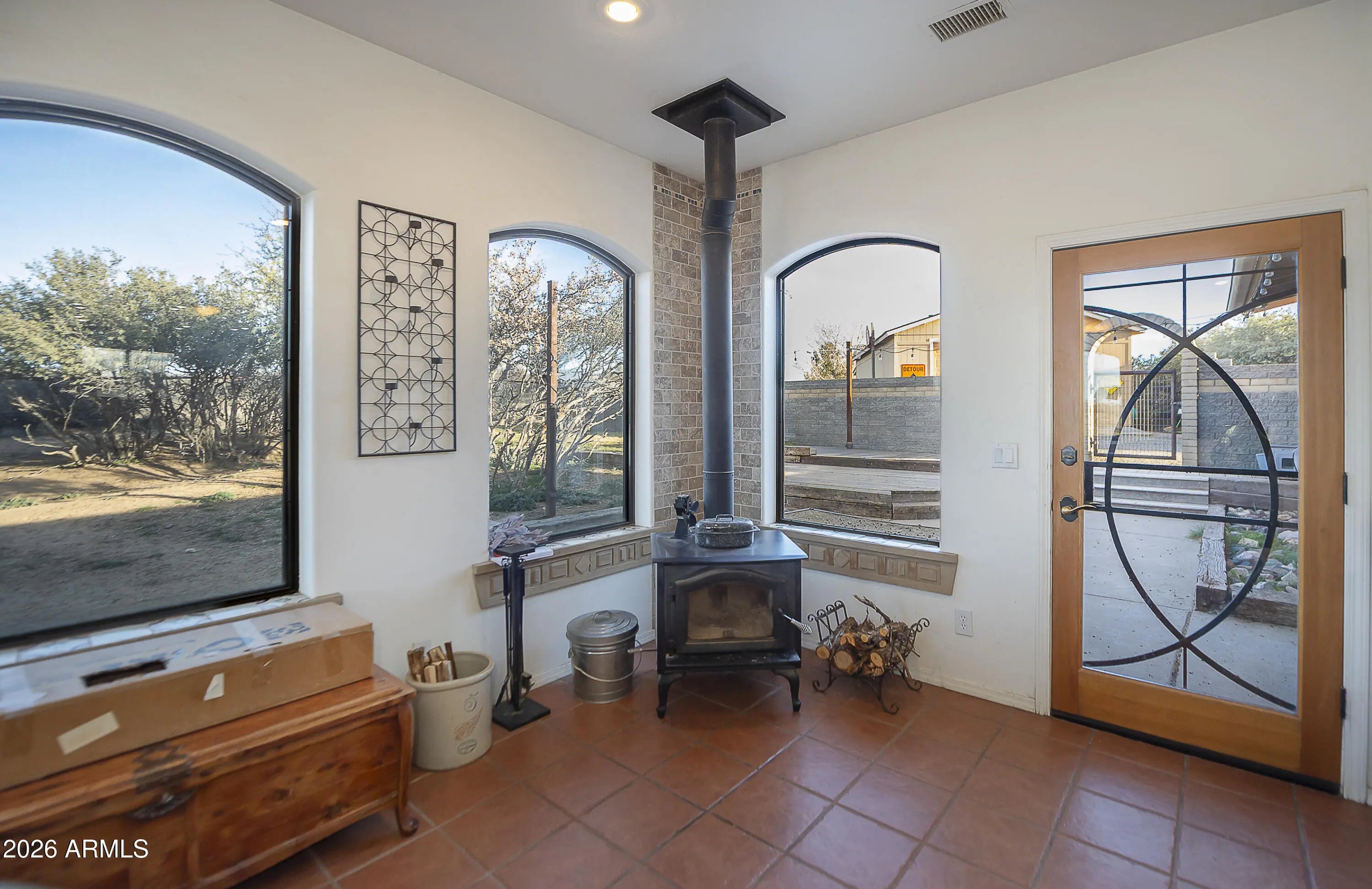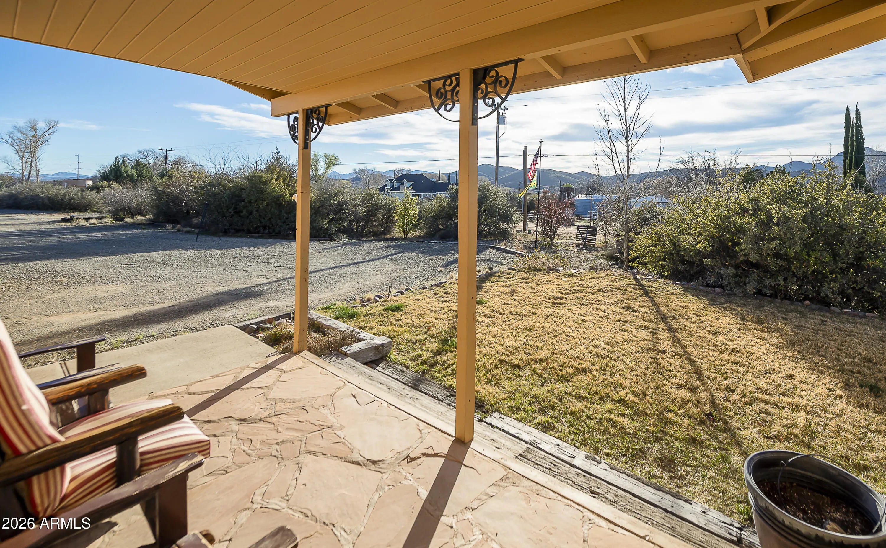 Nestled in scenic Skull Valley, this beautifully maintained home sits on 2.42 acres and captures breathtaking panoramic mountain views in every direction. The main residence offers 3 bedrooms and 2 bathrooms, along with an attached 2+ car garage. In addition, you'll find a detached RV garage/workshop and a separate guest casita--ideal for visitors, hobbies, or extra workspace. RV garage has it's own septic and RV Dump!The island kitchen is thoughtfully designed with recessed lighting, slate tile flooring, slab granite countertops, and a custom backsplash. The open living and dining area features upgraded luxury vinyl plank flooring, creating a warm and inviting space for everyday living or entertaining. Relax year-round in the Arizona Room, complete with a cozy wood-burning stove and French doors leading to the patio.The spacious primary suite includes a ceiling fan, private bath, and walk-in closet. Comfort is ensured year-round with an efficient heat pump providing both heating and cooling. Recent updates and features include a newer roof (2017), skylights, and solar for added efficiency. The private well (165 feet deep, producing 35 GPM) provides an excellent water supply.Outside, enjoy a fenced yard, patio and deck areas, raised garden beds, and irrigation in both the front and back yards--perfect for taking advantage of the peaceful rural setting. The included hot tub is a great way to wind down in the evenings and enjoy our clear night skies and plentiful stars!Located in the Skull Valley School District, this well-cared-for property offers space, functionality, energy efficiency, and stunning views--truly a wonderful place to call home.