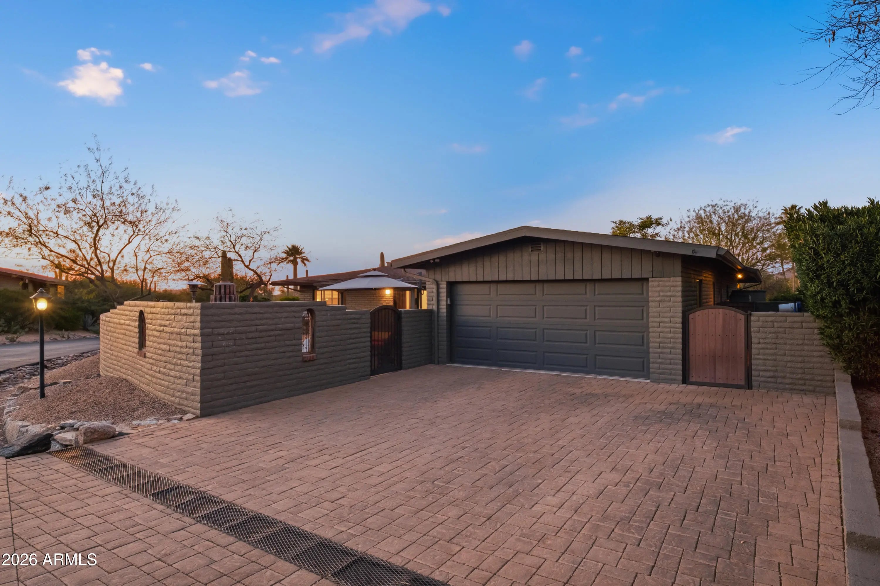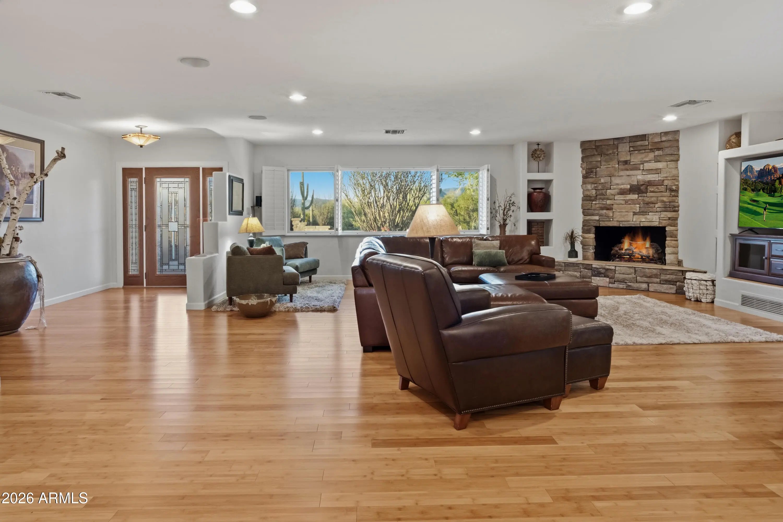 Welcome to this beautiful 3-bedroom home in the peaceful community of Carefree Estates. Built with solid block construction, this residence offers comfort, quality, and design throughout. Bamboo wood floors add warmth and character across the main living areas The kitchen has been redesigned with cooking and gathering in mind, featuring an induction cooktop, double steam convection ovens, and a large island with rich cherry wood cabinetry and soft-close drawers. A wet bar adds an easy touch for entertaining guests. The home offers a split floor plan, providing privacy between the primary suite and guest bedrooms. The primary suite includes a spacious walk-in closet, offering excellent storage and organization. A large stone fireplace anchors the living space, creating a cozy setting for cooler desert evenings. You'll also appreciate the generous storage throughout. Situated on an oversized corner lot, the property captures mountain views to both the north and south. In addition to the south-facing veranda, a welcoming front courtyard patio provides the perfect place to enjoy peaceful mornings and take in the north mountain views. The south-facing veranda offers front-row sunsets and ideal year-round sun exposure -- perfect for enjoying Arizona's beautiful climate. The veranda features a spacious patio, built-in BBQ, and exterior fireplace for outdoor living. Just down the street, you'll find an assortment of restaurants serving breakfast, lunch, and dinner -- all while maintaining the quiet, peaceful setting of this residence. Residents also enjoy a charming community pool and spa, adding to the relaxed desert lifestyle. An attached 2-car garage completes the home, offering convenience and additional storage. Comfortable living, mountain views, inviting outdoor spaces, nearby dining, and community amenities all come together in this Carefree Estates home