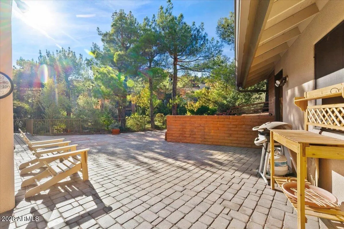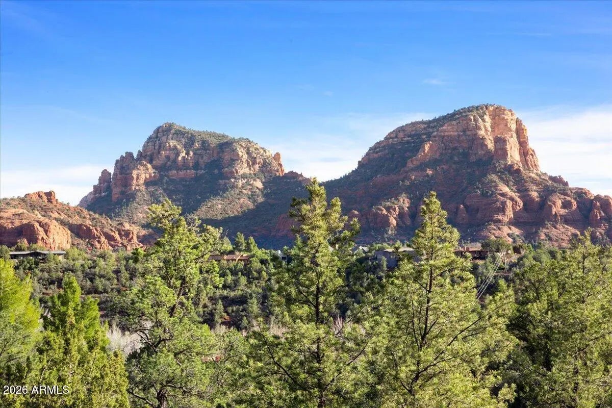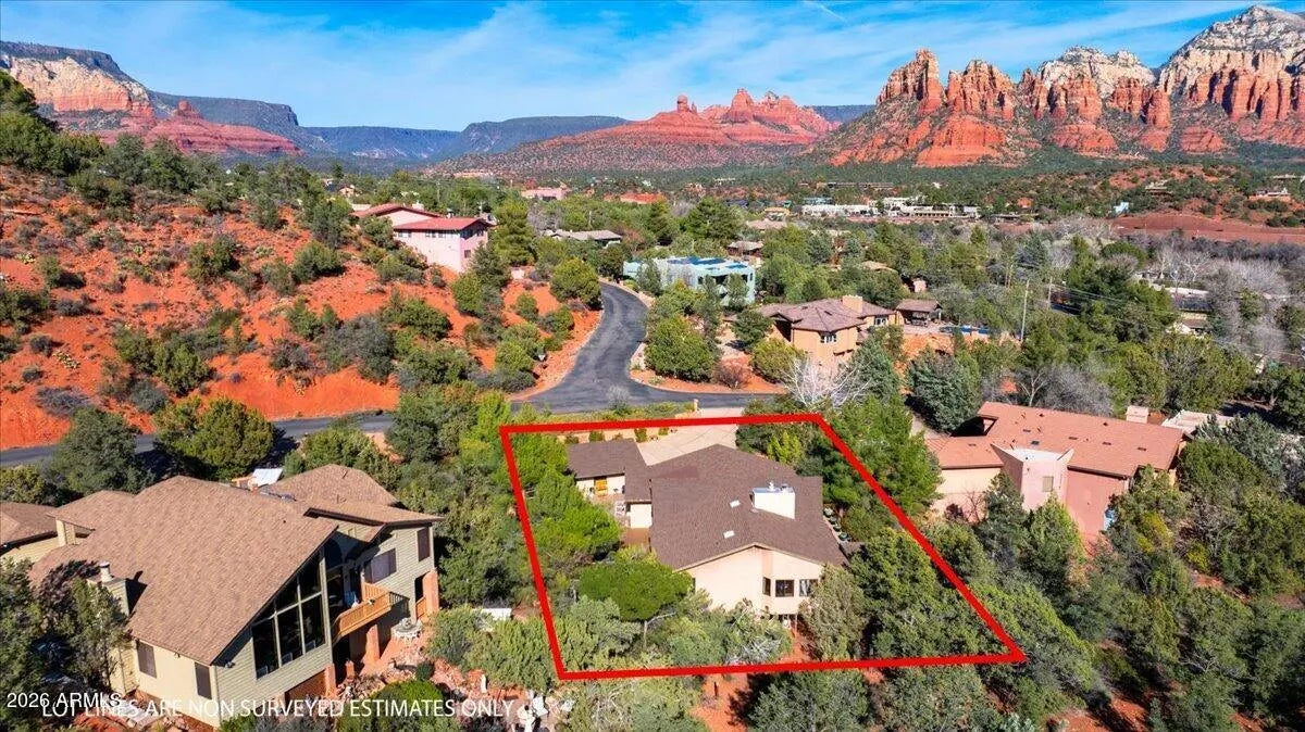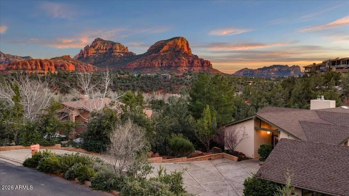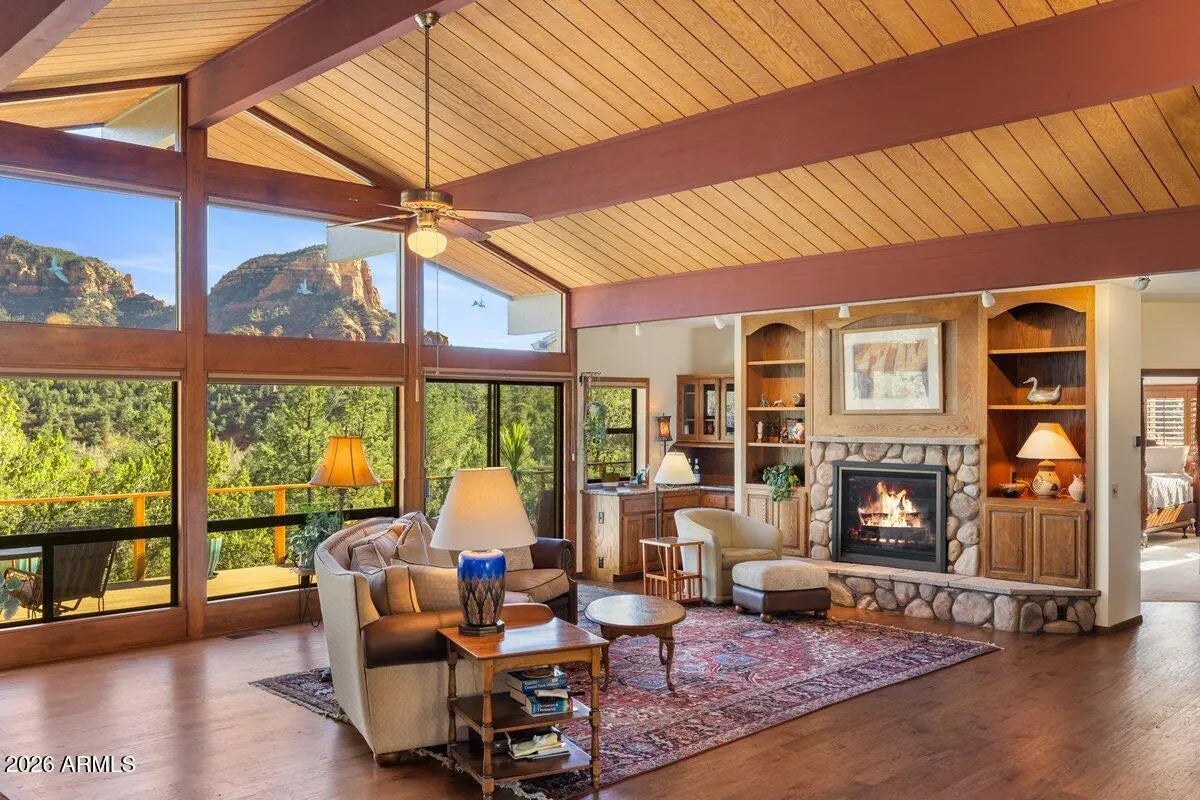 Some homes have a view. This property has Elephant Rock, Munds Mountain, Twin Buttes, and a sea of radiant red - and it never lets you forget it. The developer of the Palisades neighborhood built this home in 1986, and took full advantage of the lot orientation when designing the floor plan. This 3-bed, 2-bath home was designed with one purpose: to put red rock views front and center, in a single-level home. With extensive seller upgrades and no HOA, it delivers that rare combination of turnkey condition and timeless Sedona character. Review the short-term rental proforma to see why this property is one of Sedona's strongest investment opportunities. Step through the front entry, and the expansive great room opens before you - vaulted tongue-and-groove ceilings, full-length support beams, and a wall of glass that pulls the landscape inside. A stone fireplace wrapped in custom oak cabinetry anchors the room, and warm hardwood floors run throughout. The beautifully remodeled kitchen pairs custom cabinetry with striking stone countertops and GE Café appliances in a highly functional layout with plenty of counter and cabinet space - this is truly a chef's special place. The primary suite is its own retreat: a gas fireplace, jaw-dropping red rock views, and a recently renovated bathroom with dual vanities, a walk-in closet, and a sun-drenched walk-in shower (adjacent to the shower, the floor is plumbed for a future bathtub). Step directly from the primary bedroom to a private hot tub perched above the treetops, with the red rocks right there, right in front of you. Bedroom #2 offers an ensuite bath and a walk-in closet. Bedroom #3 - is currently a craft room (with plenty of space to accommodate a king-size bed), and a half bath that can be restored to a full bath. The back deck is where this home truly lives: Trex decking, new railings, a hot tub, and unobstructed red rock panoramas. Below, a small fenced yard is ready to become the perfect dog run. On the west side of the home, a lovely, enclosed courtyard has its own deck and a natural water feature adds one more layer of charm. A large two-car detached garage and a generous front driveway with plenty of parking space round it all out. This home has something newer builds can't recreate - warmth baked into its bones. The woodwork, the beams, the glass, its elevation above the trees. It all adds up to a postcard-perfect home to be your own. Check the documents tab for the full upgrade list and the short-term rental proforma.