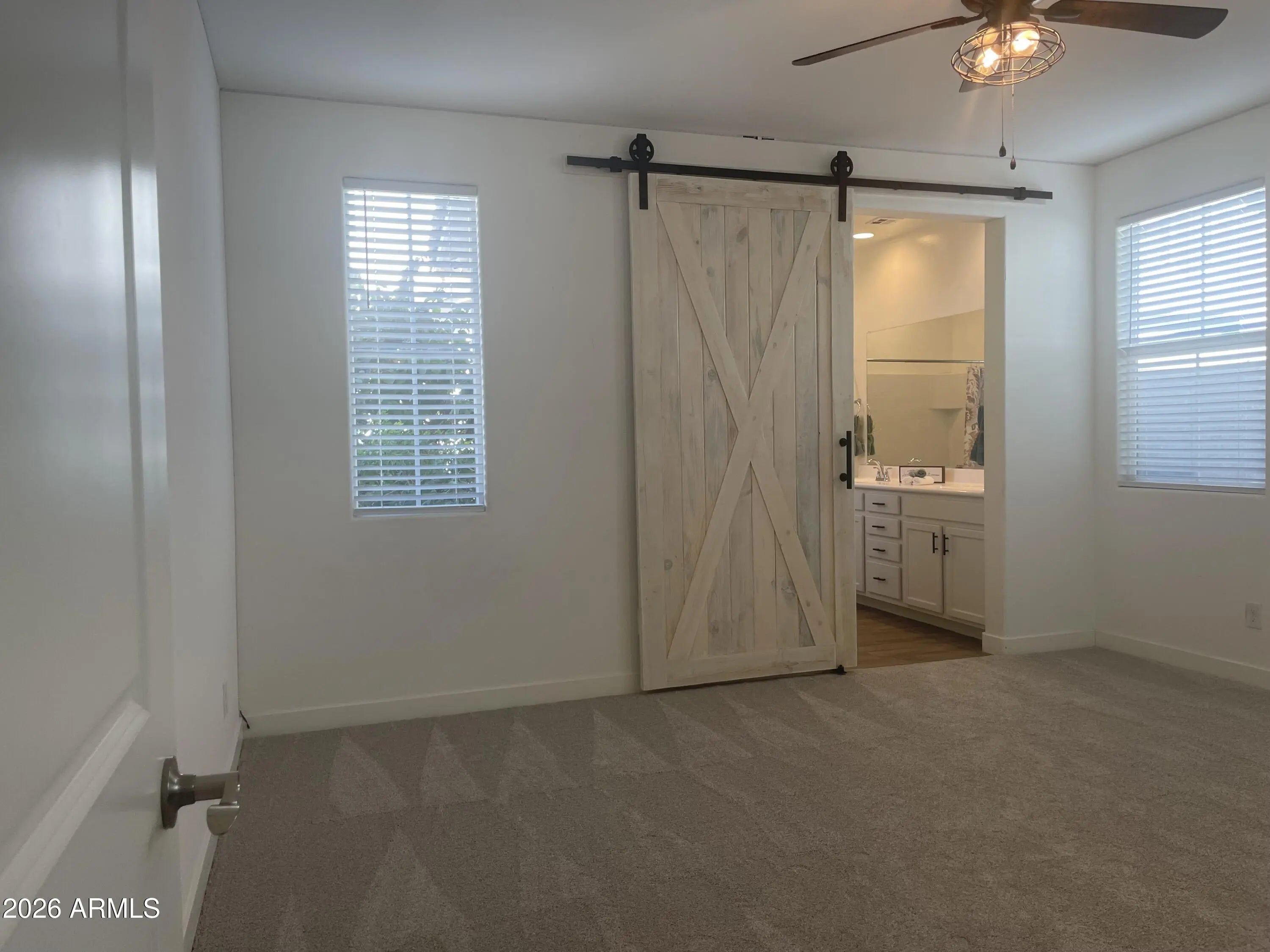 Move-in ready with brand new carpet installed February 2026! A bright, warm and spacious atmosphere flows throughout this lovely modern home. This spacious four bedroom residence offers two primary suites - one upstairs and one downstairs - while the other two bedrooms are upstairs and are generously sized.Each primary suite features sliding barn doors opening to a private ensuite bath. Walk-in closets in all bedrooms with most walk-in closets featuring windows providing an abundance of beautiful natural light. An open great room pairs beautifully with the upgraded white kitchen cabinetry, quartz counter, center kitchen island & stainless appliances. Wood looking ceramic tile downstairs and NEW carpet in all bedrooms, upstairs hallway and stairway. The two car garage features an epoxy floor, shelving and direct entry to home. The backyard is complete with ground pavers and turf grass for low-maintenance living. Resort-style Cadence Community amenities are in abundance featuring a large community pool with water slides, a lap pool & hot tub, parks, playgrounds, sports courts, fitness center, community center, game room, STIR community social functions, and an event center. Close to Highways 24, 60, 202, and only minutes away from numerous shopping destinations and dining choices.