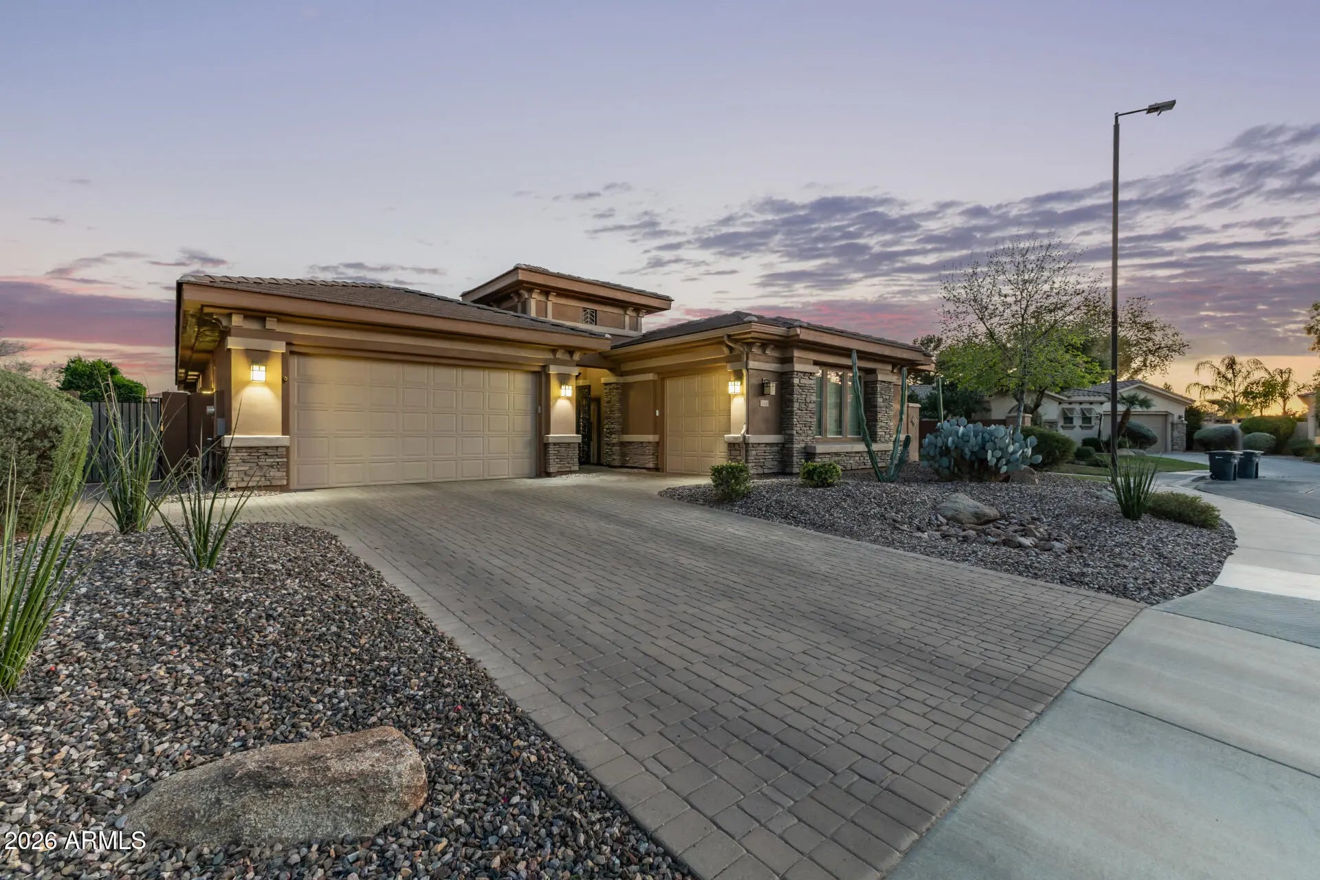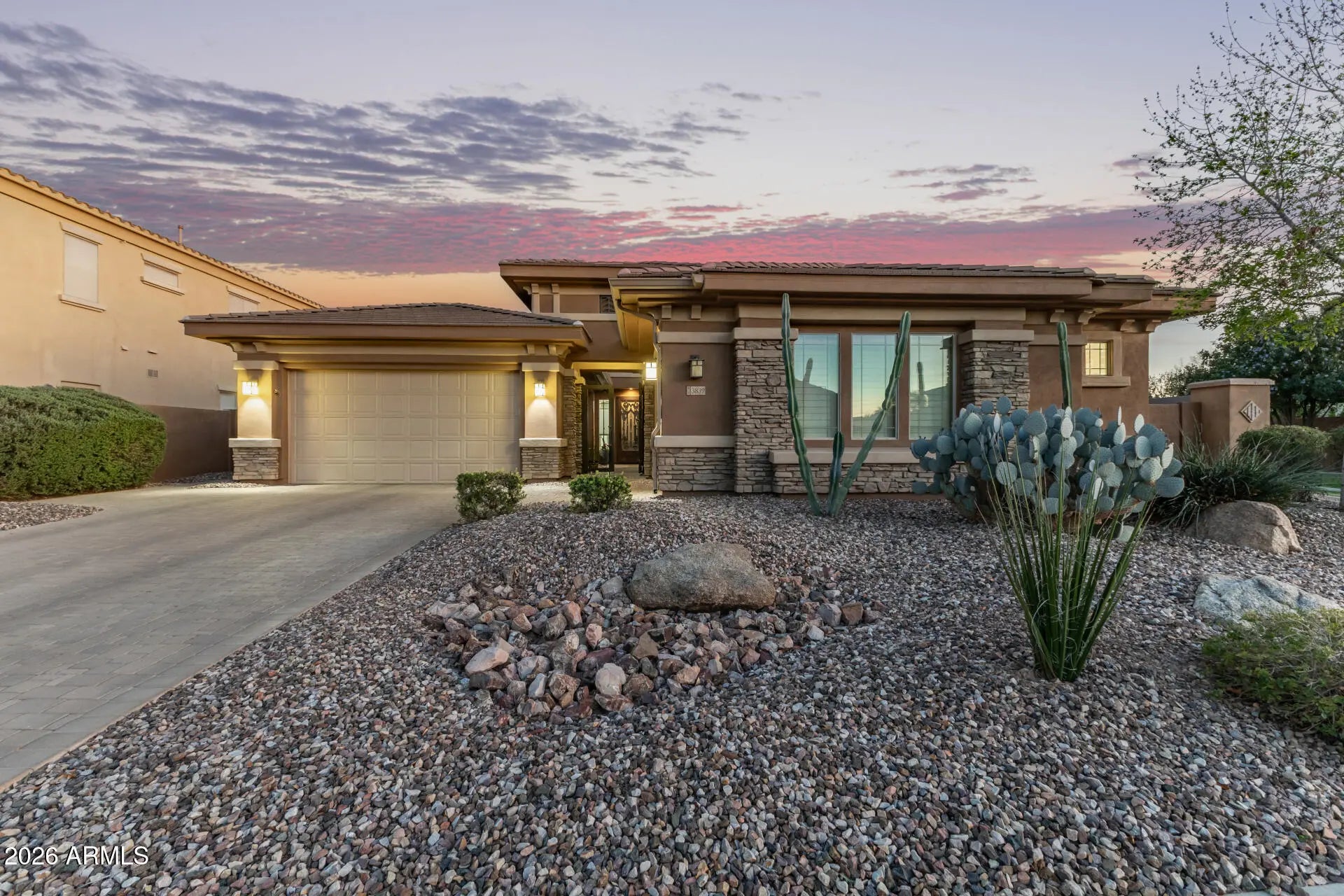 Welcome to this stunning 4-bed, 3.5-bath gated residence in the South Chandler neighborhood of Pontevedra at Valencia. The striking facade features stone accents, stunning courtyard, a paver driveway, and a 3-car garage. Inside, discover formal living areas with durable tile, high ceilings, and a cozy fireplace. The chef's kitchen boasts granite counters, built-in appliances, and a prep island. Retreat to the primary suite with a lavish ensuite and private outdoor access. The backyard is an entertainer's dream, featuring a sparkling pool, relaxing spa, and a fully equipped outdoor kitchen. From the crown molding to the custom garage cabinets, every detail of this home combines elegance with modern comfort in a premier location.
