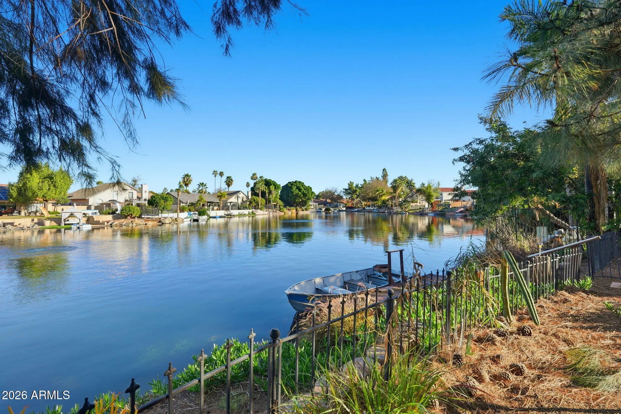 Don't miss this rare opportunity to own a home situated directly on the water in Chandler. Enjoy one of the most serene and peaceful backyard settings the area has to offer -- complete with mature trees, citrus, lush shrubs, and expansive green space that keeps the yard cool and inviting all summer long. Step inside to an open, airy layout featuring soaring vaulted ceilings, neutral tones, and classic Saltillo tile. The main home offers 3 bedrooms and 3 bathrooms, with the primary suite serving as a private retreat that spans nearly the entire second floor. The kitchen features butcher-block countertops, black appliances, and matching cabinetry for a warm, cohesive feel. Relax in the spacious great room with an attached den. Property also has a CASITA complete with its own bathroom
