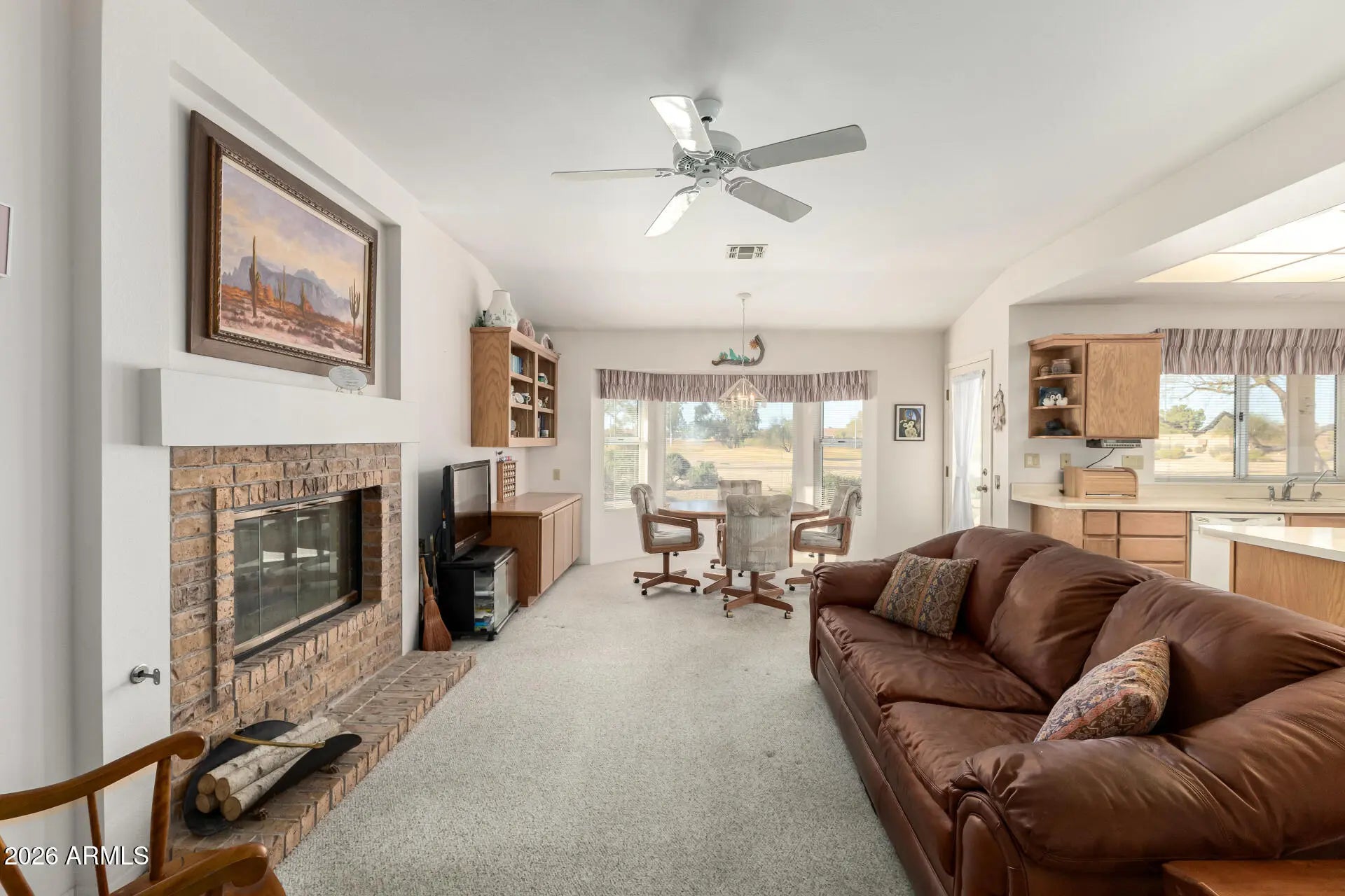Popular Cromwell model with 2 bedrooms plus den/office room with double doors overlooking 9th fairway of Trail Ridge Golf Course. Spacious kitchen with plenty of cabinets opens to large living area with cozy gas fireplace. Primary bedroom features double vanity in bathroom and walk-in closet. Split floorplan for extra privacy. Inside laundry with washer/dryer and utility sink. Two car garage with cabinets, soft water system. Enjoy the endless golf course views of the 9th fairway and 2 driving ranges from the covered rear patio. Water heater (2023). Great location, quiet street. Come see this amazing home!