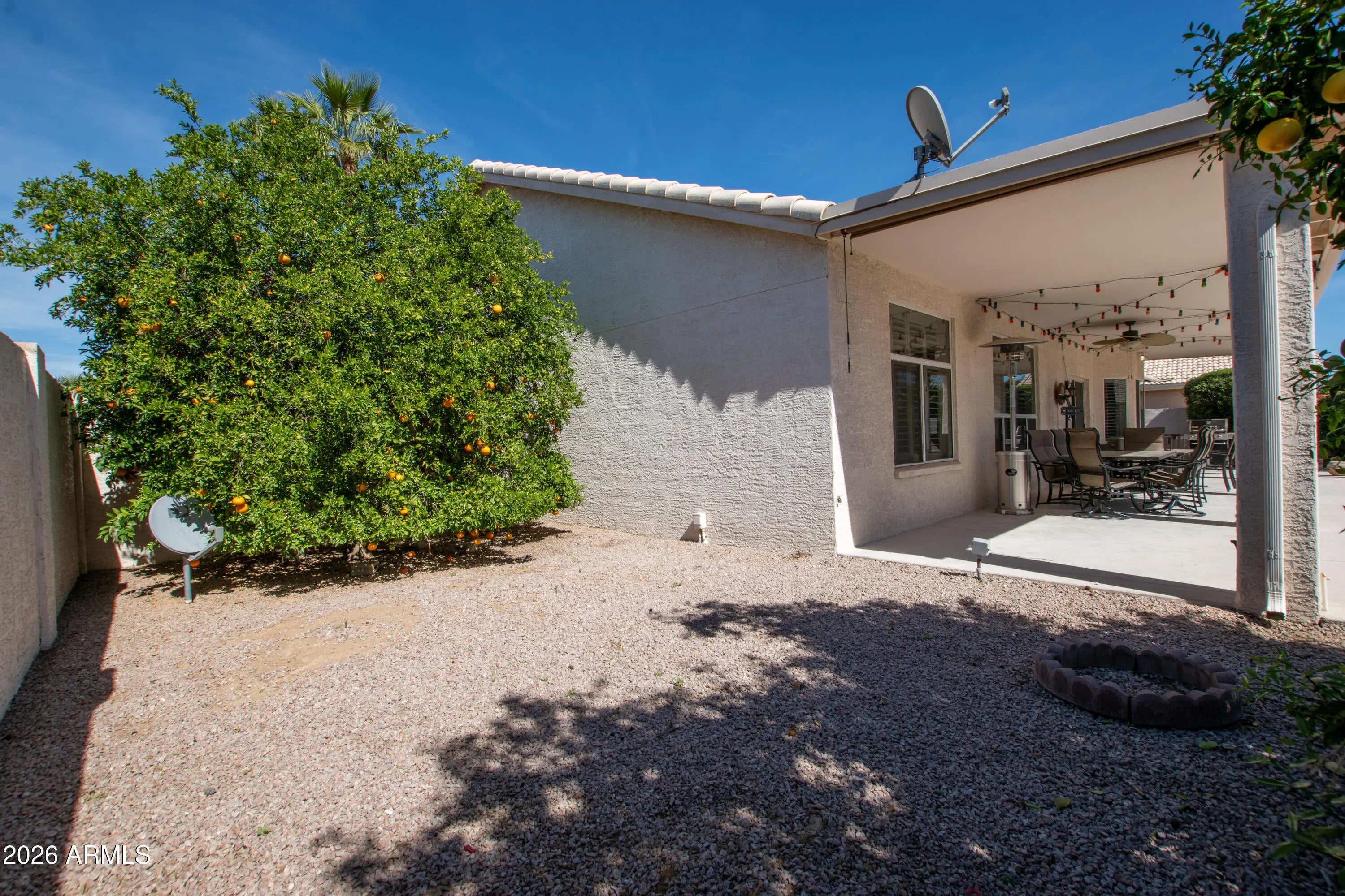 This well-maintained home sits on an extra-wide lot and comes fully furnished for a seamless move-in experience. The open kitchen features stainless steel appliances, quartz countertops, an undermount sink, center island, and breakfast bar, all flowing into a spacious great room ideal for entertaining. Plantation shutters are found throughout the home, adding timeless style and energy efficiency. Major systems including the AC, furnace, and water heater are approximately five years old. The primary bath features a walk-in sit-in tub for added comfort and accessibility. Enjoy outdoor living under the covered patio with gas BBQ stub and fruit trees. Extended-length garage includes built-in storage cabinets.