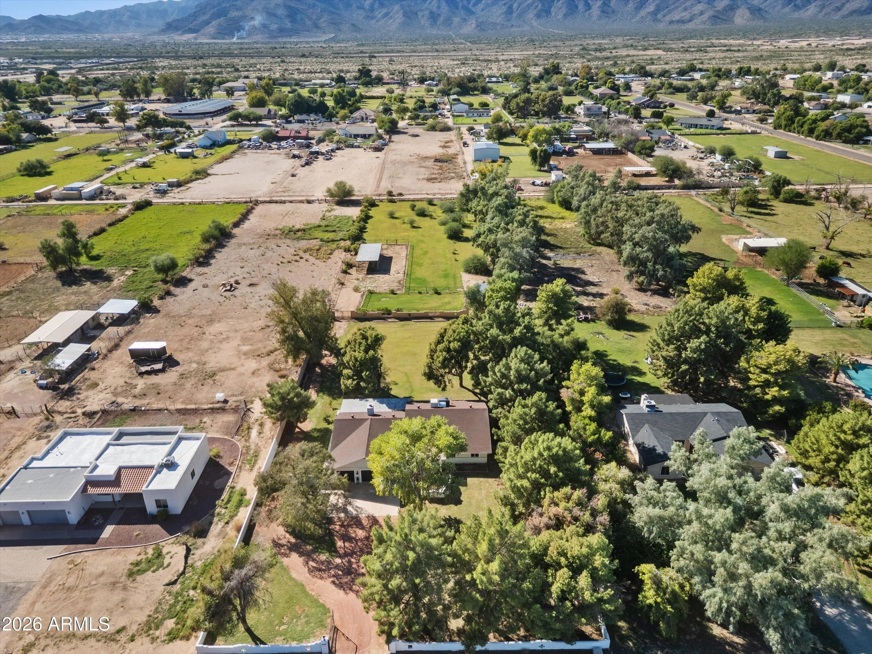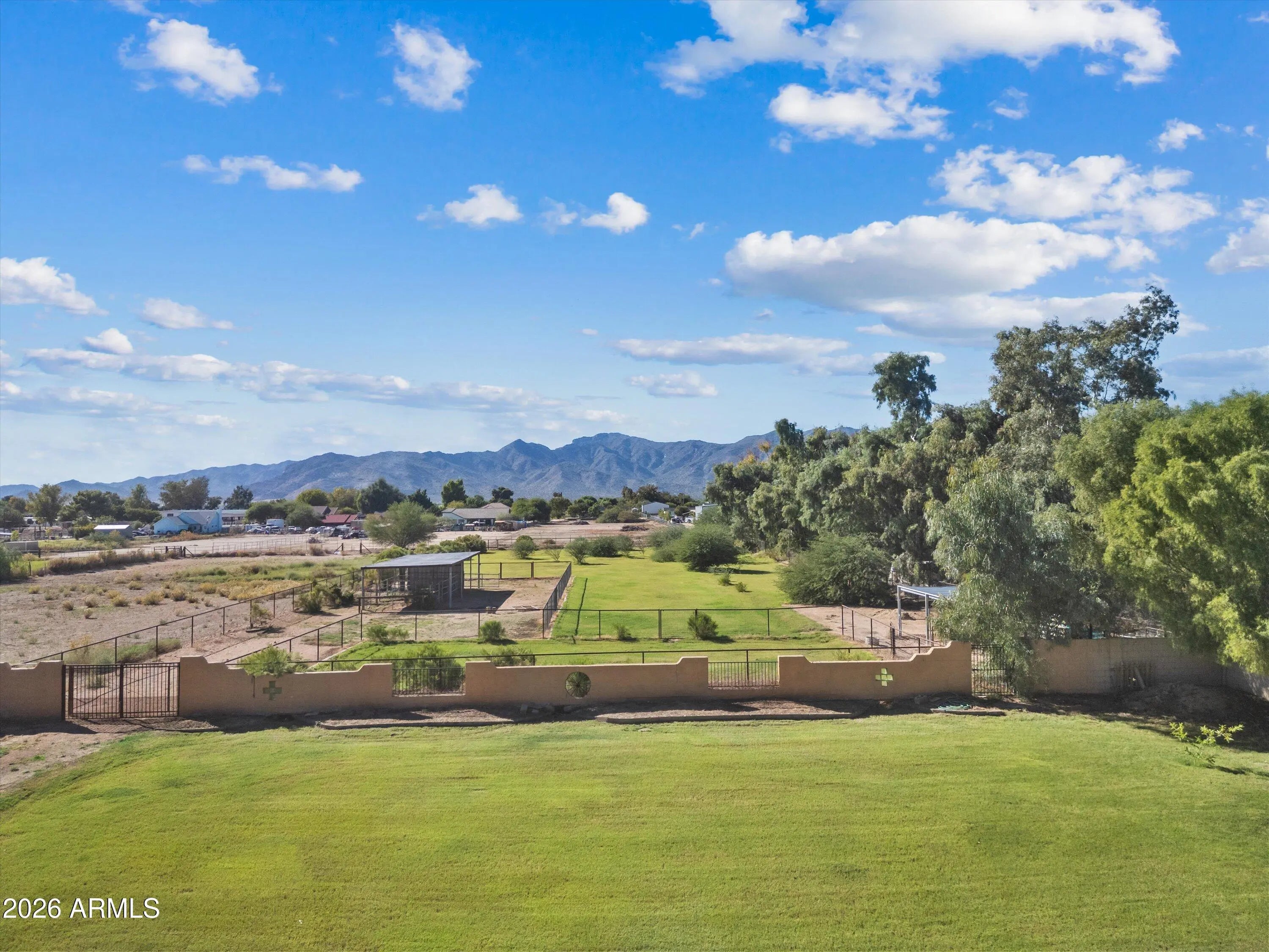 Welcome to your very own slice of paradise, where rustic charm meets modern luxury! Nestled on 1.8 flood irrigated, fenced acres, this stunning property is perfectly designed for both elegant living and equestrian enjoyment. Step through the front door and into a space that feels both fresh and inviting. The new flooring flows seamlessly throughout, complemented by fresh interior paint that makes every room light and airy. Natural light pours in from windows that frame breathtaking views of the White Tank Mountains, where each evening delivers a front-row seat to Arizona's most spectacular sunsets. Complete with matured trees and lush green grass. The horse facilities feature four covered stalls, a covered feeding stall, and a tie post - ready for your horses to settle in and thrive Whether you're enjoying your morning coffee on the patio, watching your horses graze, or admiring the sunsets over the mountains, this property offers the peace, privacy, and beauty that every horse lover dreams of. Additional Highlights: - 10 minutes from grocery/retail stores/restaurants - Gated driveway for privacy and security - RV gate with easy trailer and vehicle access - Fully fenced acreage with irrigation throughout - New Dutch front door - New AC unit - New water heater (transitioned into the garage rather than in the home) - Fully remodeled bathrooms - 3 car garage with epoxy floors - Workshop area in the garage - Bonus room with separate entrance/exit if needed Come see this rare gem today! Your dream ranch retreat awaits!