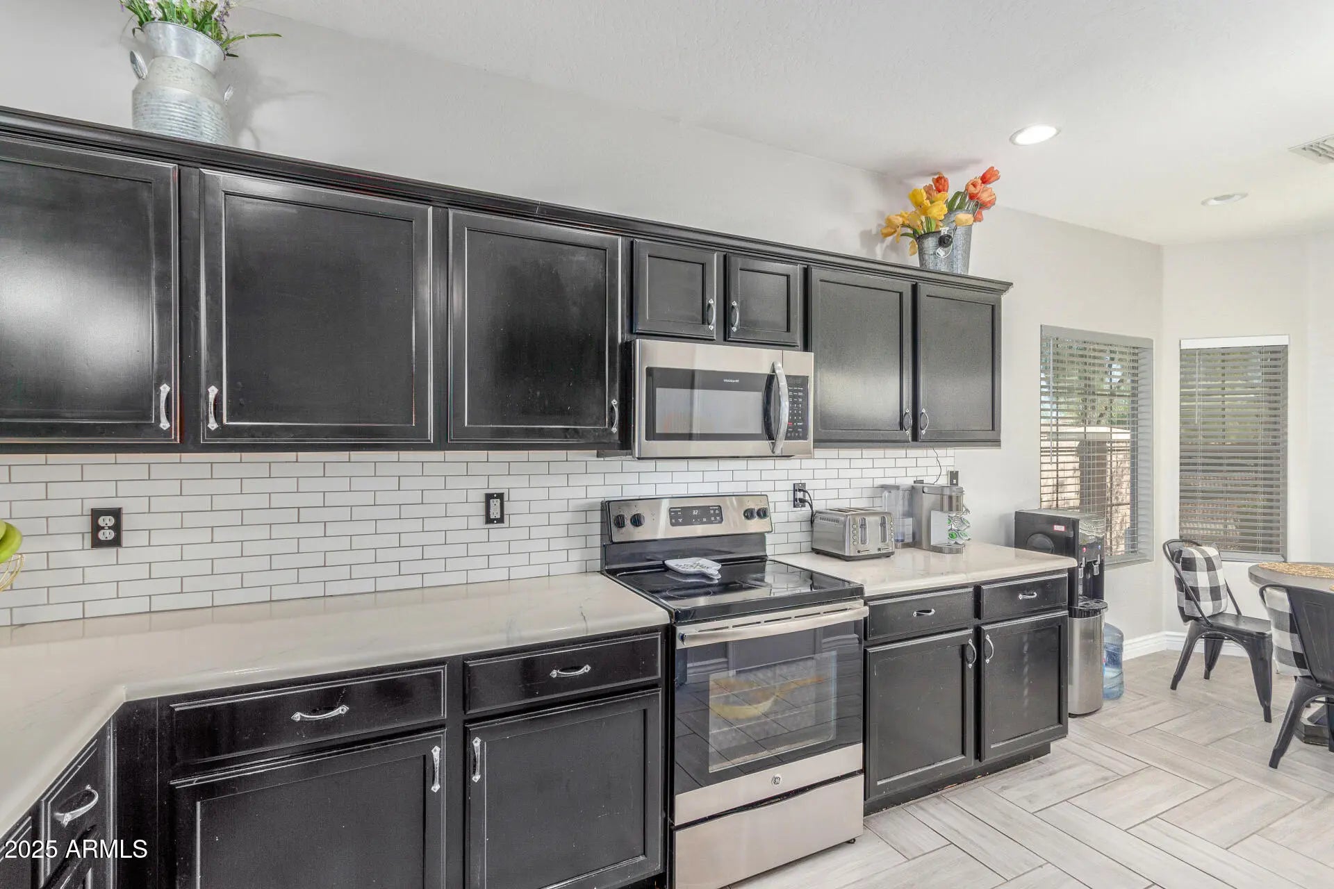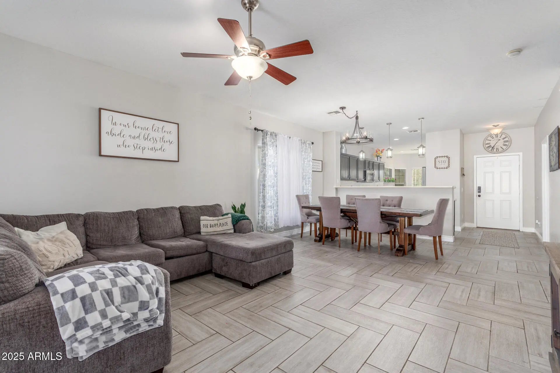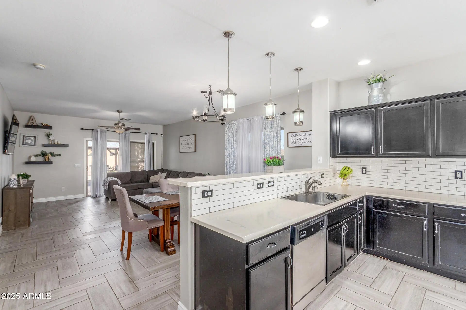 Single-level 3 bedroom home in Acacia Crossings, Maricopa AZ on a premium lot bordering a walking path. Open great room with chevron tile flooring flows into an updated kitchen featuring stained cabinets, subway tile backsplash, single-basin sink, reverse osmosis system, pendant lighting, and gas stub for future range. Bright bay window breakfast nook. Spacious primary suite with dual sinks, two closets, and walk-in shower with bench. Guest bath with floor-to-ceiling tile. Covered patio, gazebo, grassy yard, EV hookup, storage racks, plus nearby parks, playgrounds, and basketball courts.