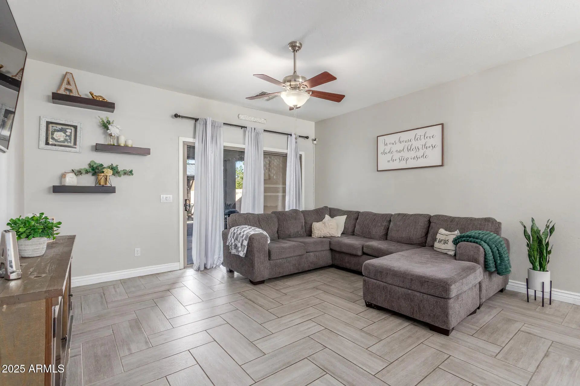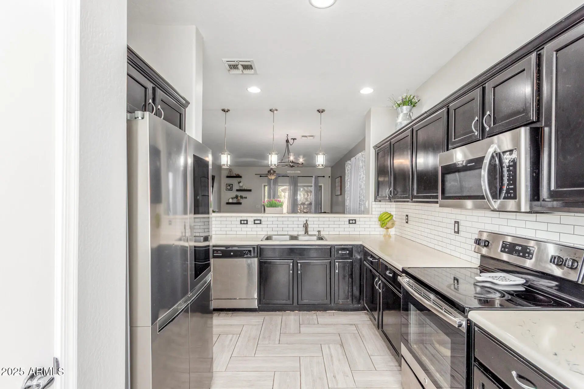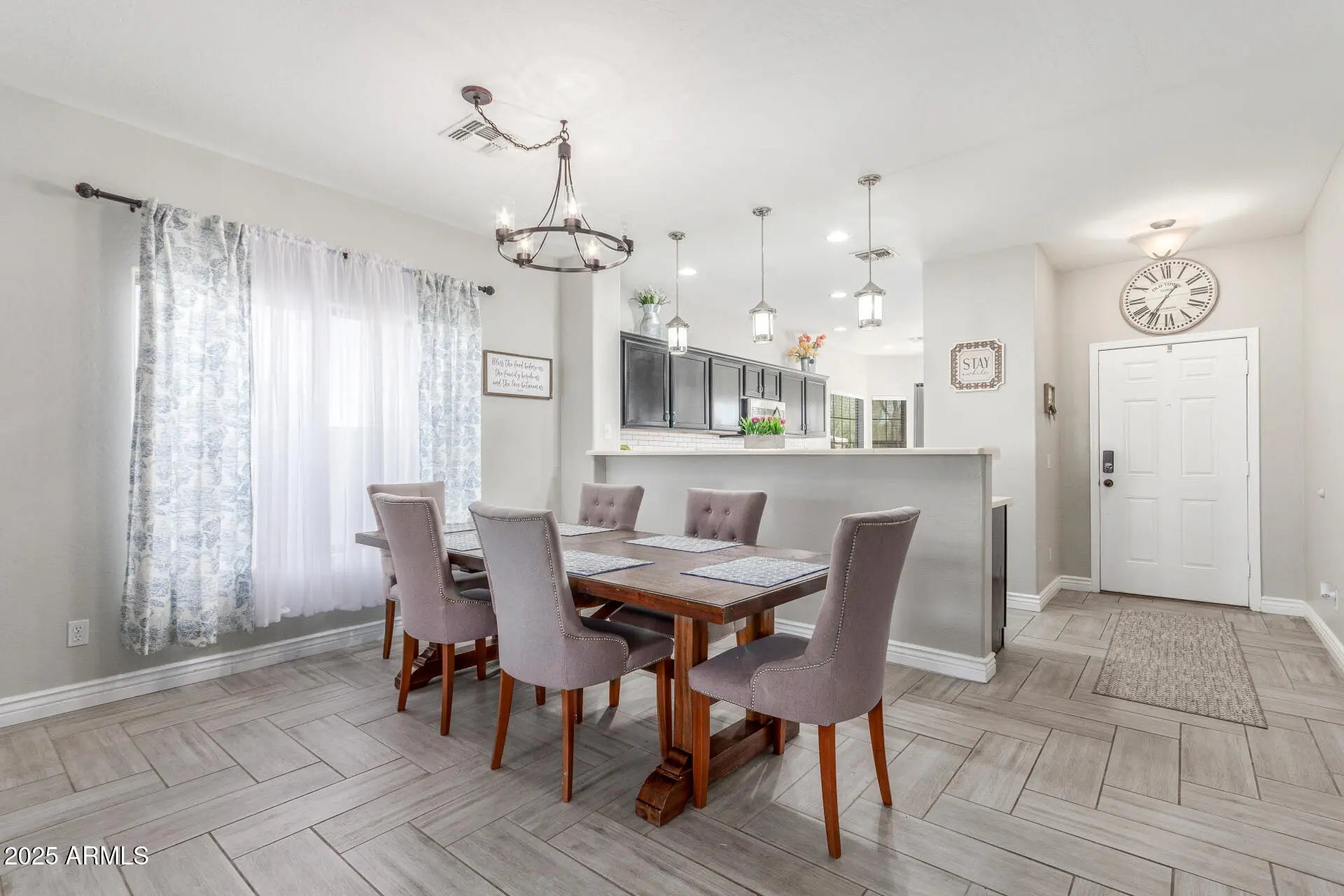 Single-level 3 bedroom home in Acacia Crossings, Maricopa AZ on a premium lot bordering a walking path. Open great room with chevron tile flooring flows into an updated kitchen featuring stained cabinets, subway tile backsplash, single-basin sink, reverse osmosis system, pendant lighting, and gas stub for future range. Bright bay window breakfast nook. Spacious primary suite with dual sinks, two closets, and walk-in shower with bench. Guest bath with floor-to-ceiling tile. Covered patio, gazebo, grassy yard, EV hookup, storage racks, plus nearby parks, playgrounds, and basketball courts.
