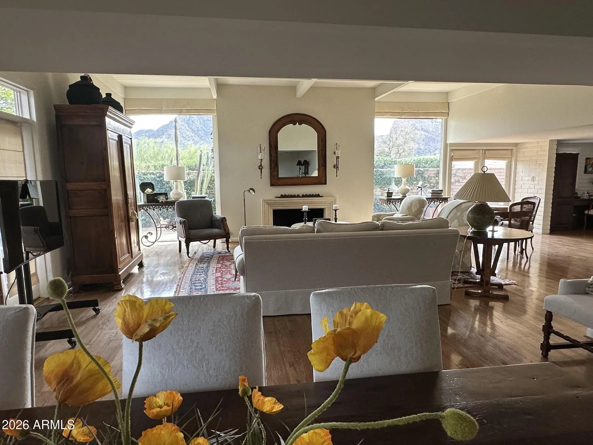 Experience unparalleled sophistication in this 3,344 sq. ft. estate nestled behind the prestigious 24-hour guard gates of Colonia Miramonte. This rare single-level residence boasts dramatic vaulted, wood-beamed ceilings and a grand fireplace, creating an atmosphere of refined elegance. The gourmet kitchen features premium granite counters and high-end stainless appliances.A detached guest house provides private accommodations for visitors. Step outside to your private courtyard oasis with flagstone patios and breathtaking mountain views. Residents enjoy a vibrant social atmosphere with curated excursions and a heated community pool/spa. Discover the perfect blend of privacy and community in Arizona's most coveted zip code