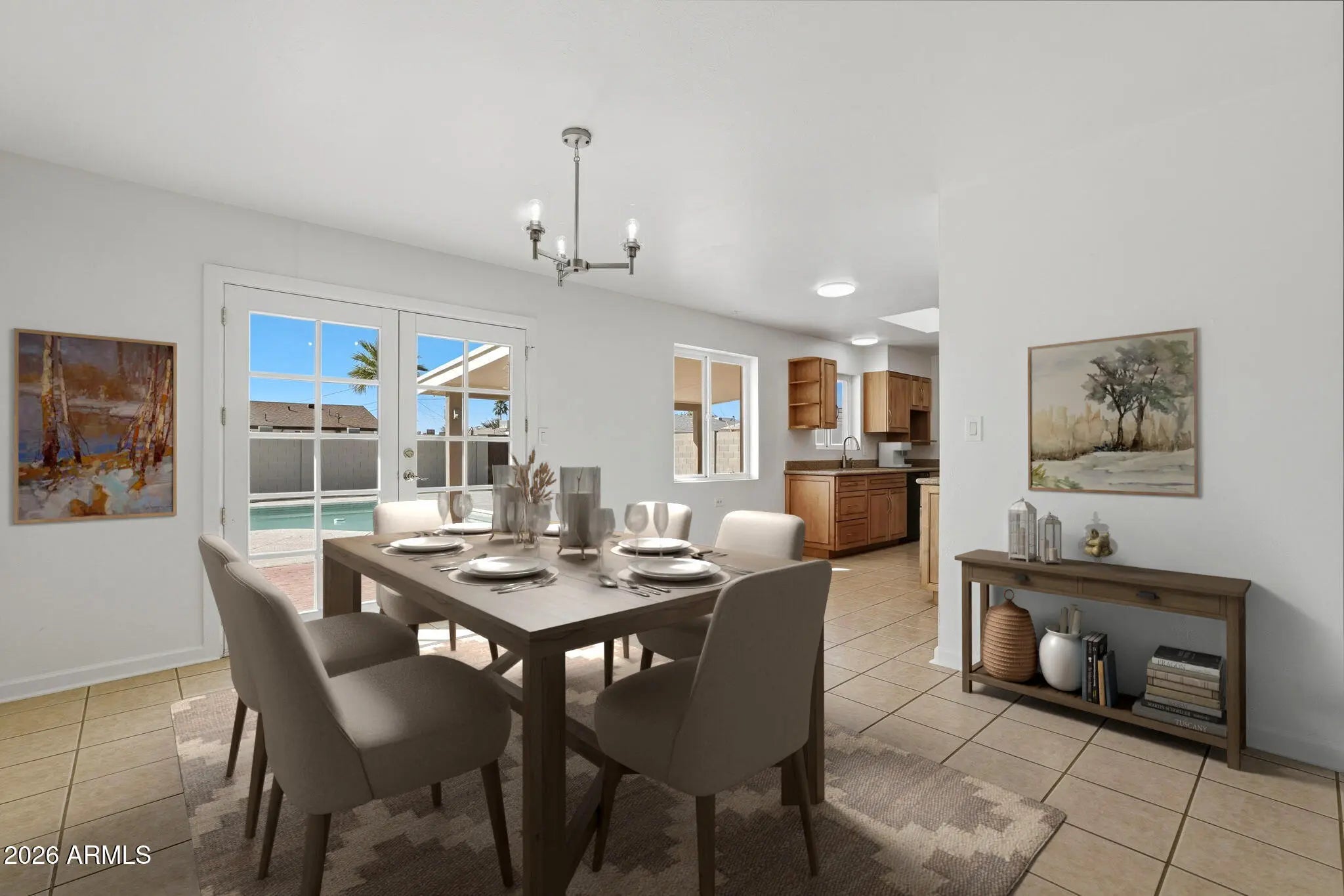 Located in the heart of South Scottsdale just minutes from Scottsdale Fashion Square, this classic Arizona single-level home sits on a spacious lot with a private pool and no HOA. Featuring 3 bedrooms and 2 bathrooms, the home offers new interior and exterior paint, luxury vinyl flooring, updated fixtures, and new dual-pane windows throughout for improved energy efficiency. The open living space flows into the kitchen, with an inside laundry room conveniently located just off the kitchen. French doors near the dining area lead to the backyard, creating easy indoor-outdoor living. Bathrooms feature tile shower surrounds for a clean, elevated feel. Outside, enjoy a covered patio, rear RV gate, large driveway, and 2-car carport. Low-maintenance desert landscaping welcomes you in front.