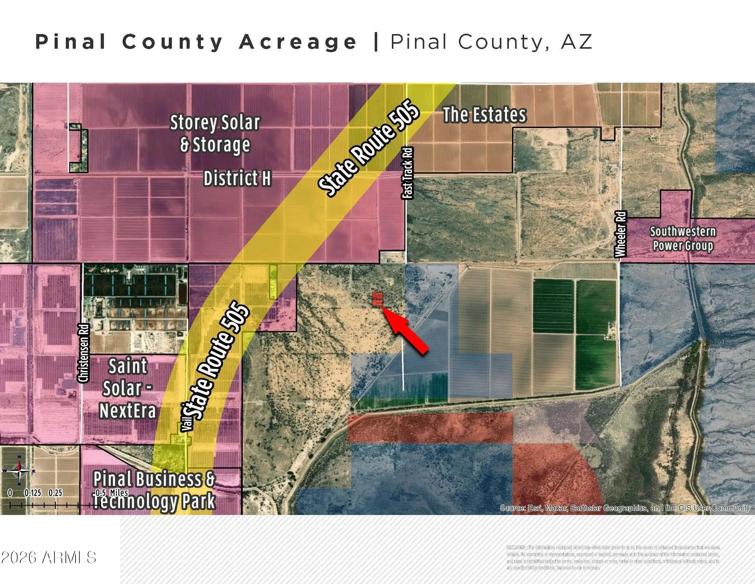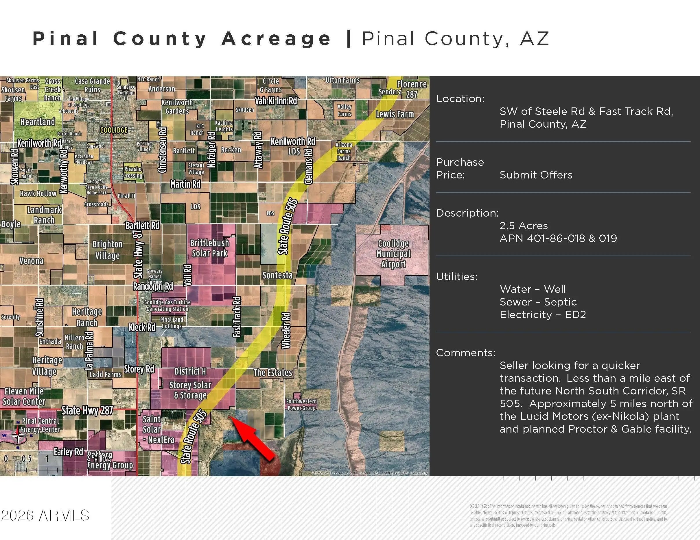 This 2.5-acre property, with APN 401-86-018 & 019, is positioned southwest of Steele Rd & Fast Track Rd, it's less than a mile east of the future North South Corridor, SR 505. The area is set to experience significant growth, being approx. 5 miles north of the Lucid Motors (ex-Nikola) plant and the planned Proctor & Gable facility. This prime location is less than 15 minutes south of the Coolidge's city center, 20 minutes south of the Florence's city center, and 30 minutes east of the Casa Grande's city center. Surrounded by residential and horse properties this is a golden opportunity for investors or those looking to build their dream home in a picturesque setting. Adjoining 2 parcels to the east, an additional 2.5 acres, may be available for purchase as well for a total of 5 acres.