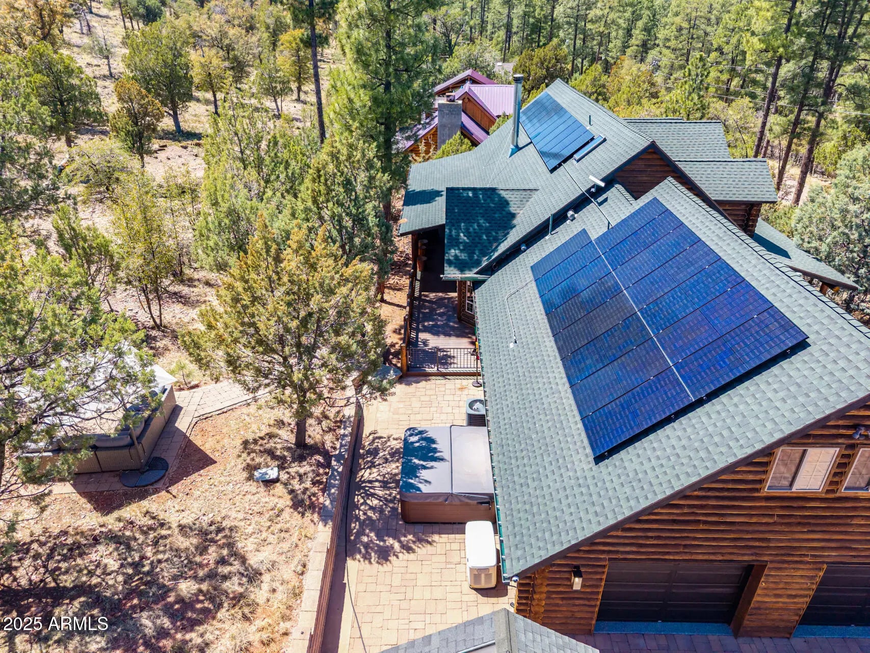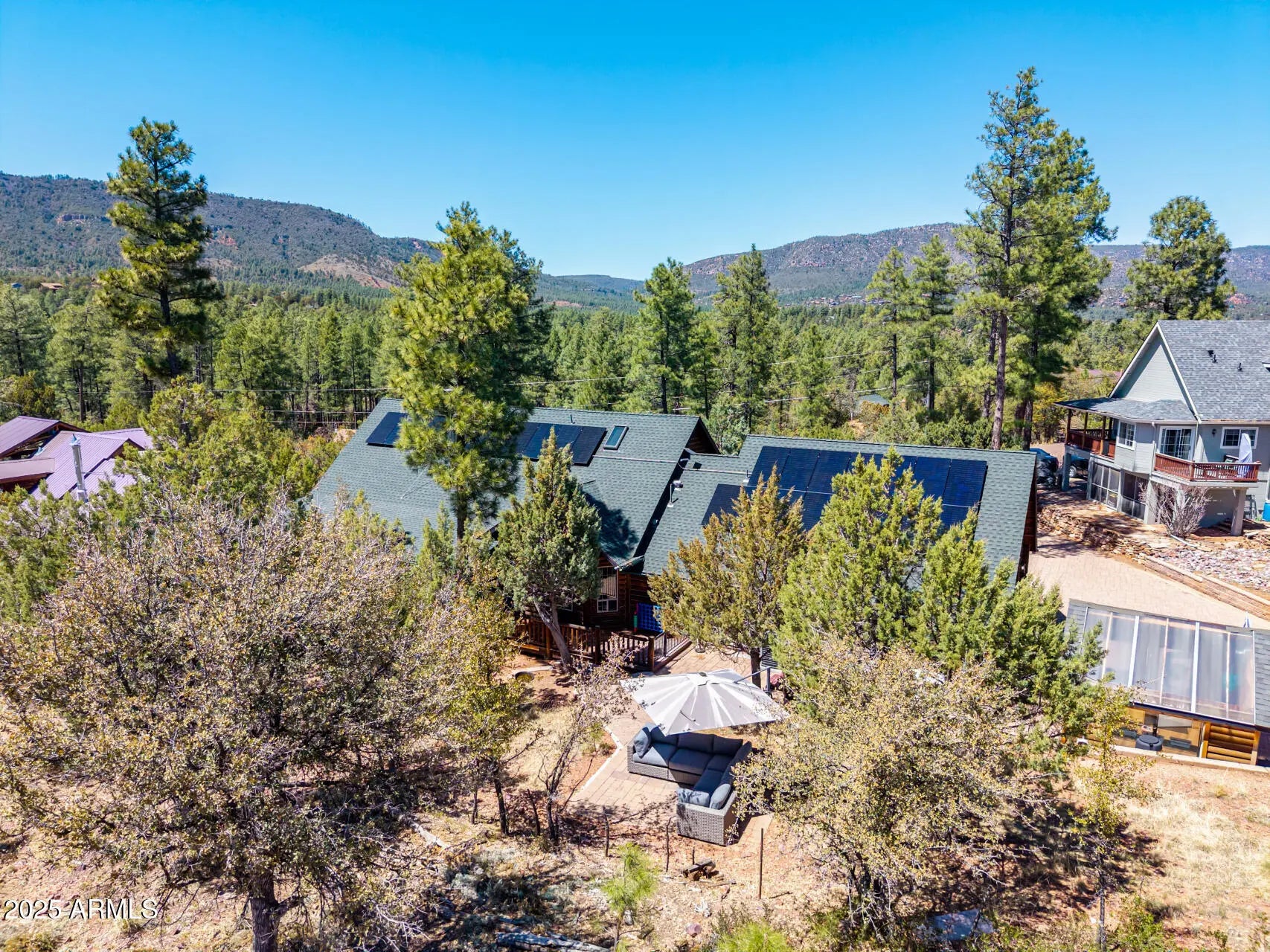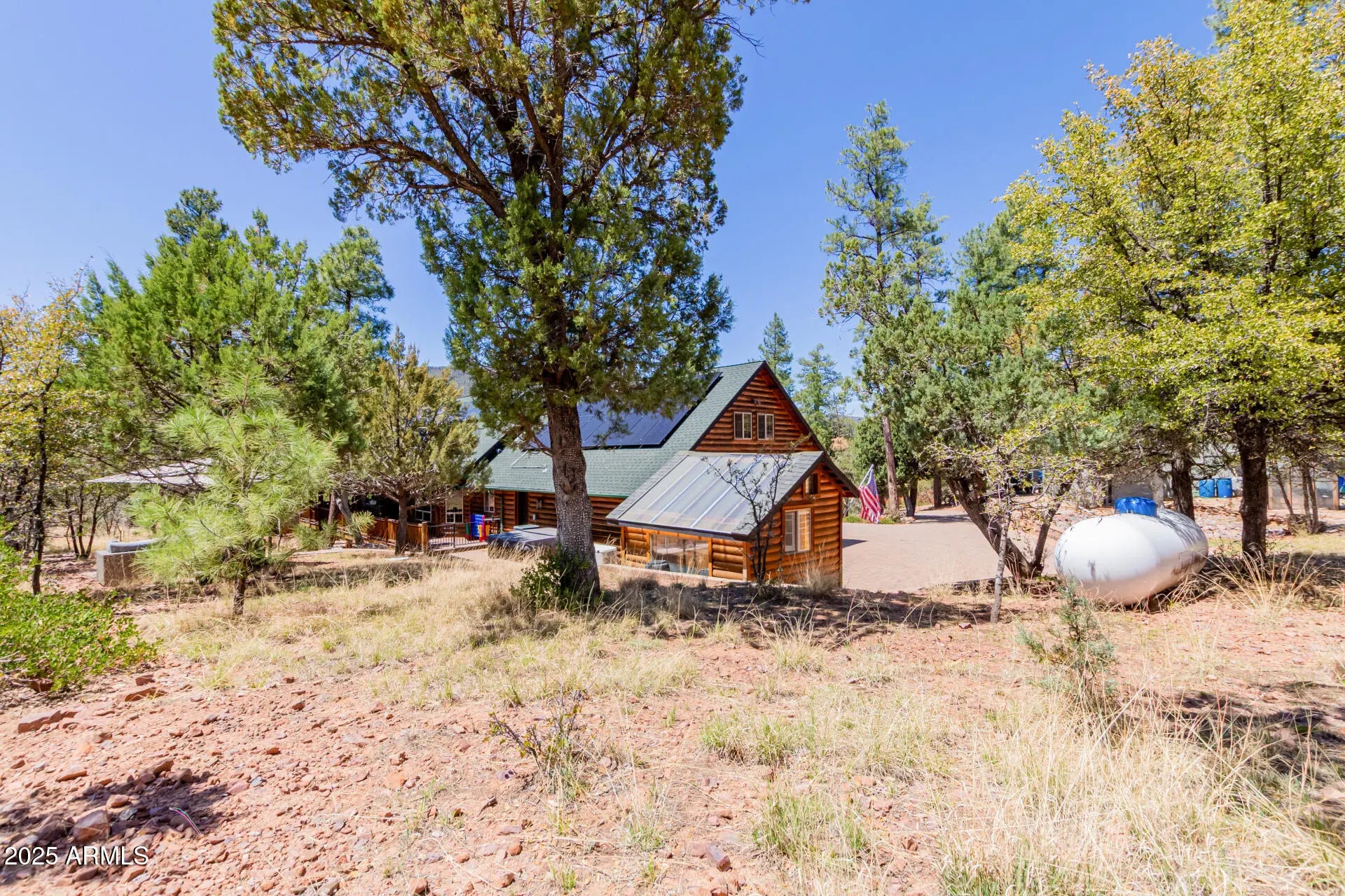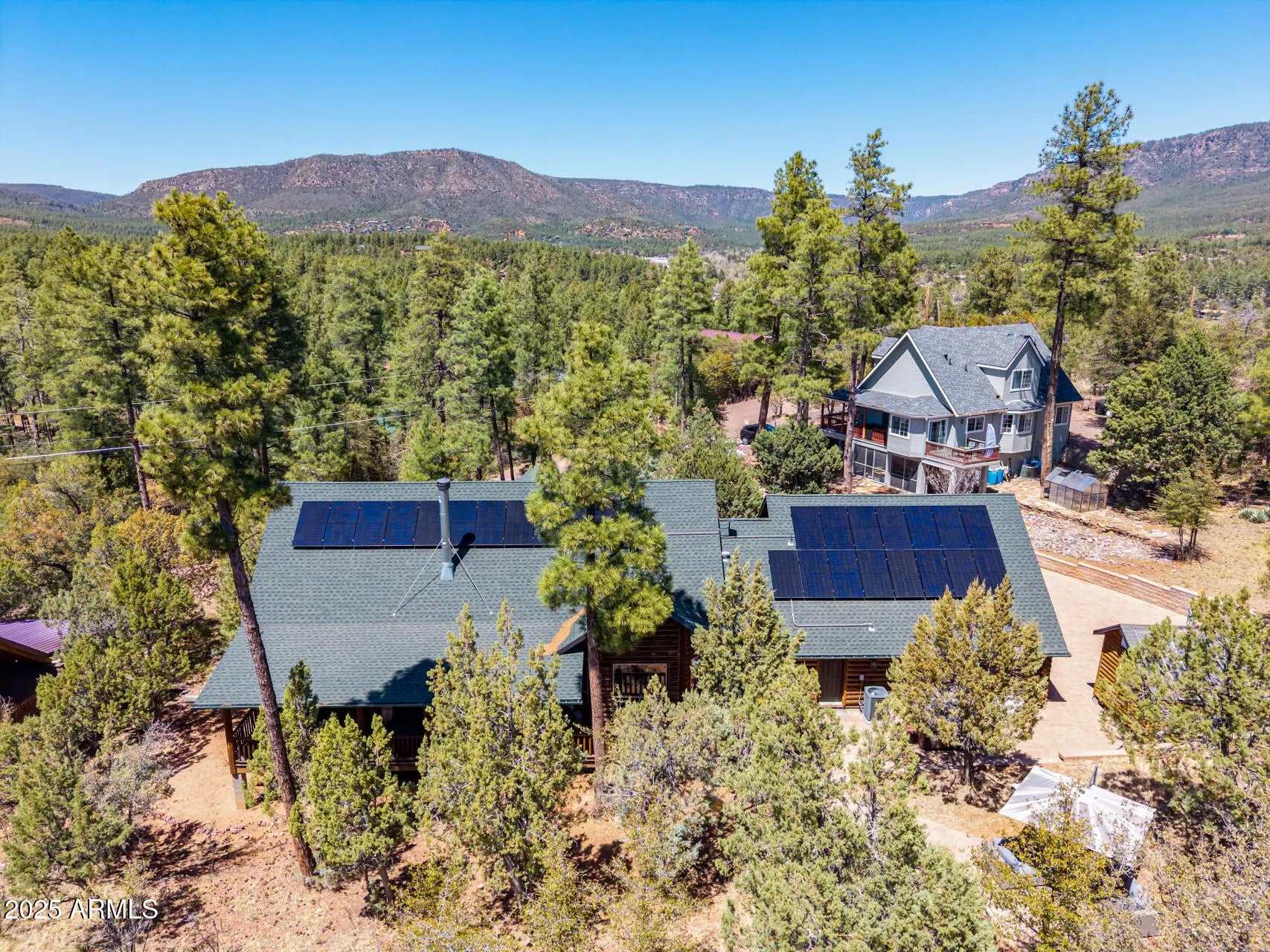 Fully furnished, beautiful Full Log construction home is situated on the edge of the Tonto National Forrest with thousands of acres to explore. Enjoy mountain living at it finest, with unobstructed views, daily wildlife sightings, & the fresh mountain air! Notable features of this stunning home are: paid off solar, Tesla Powerwall battery, Generac backup generator, 2,500 gallon water backup water reserve tank, Starlink internet hardwired, & a state of the art camera monitoring system to keep an eye on the home while you are away. The ultimate off grid capable mountain retreat, with no HOA! Recent updates include: freshly chinked & stained, anew roof, new AC, alternative septic systems, new Anderson sliding doors, Bullfrog hot tub & much more