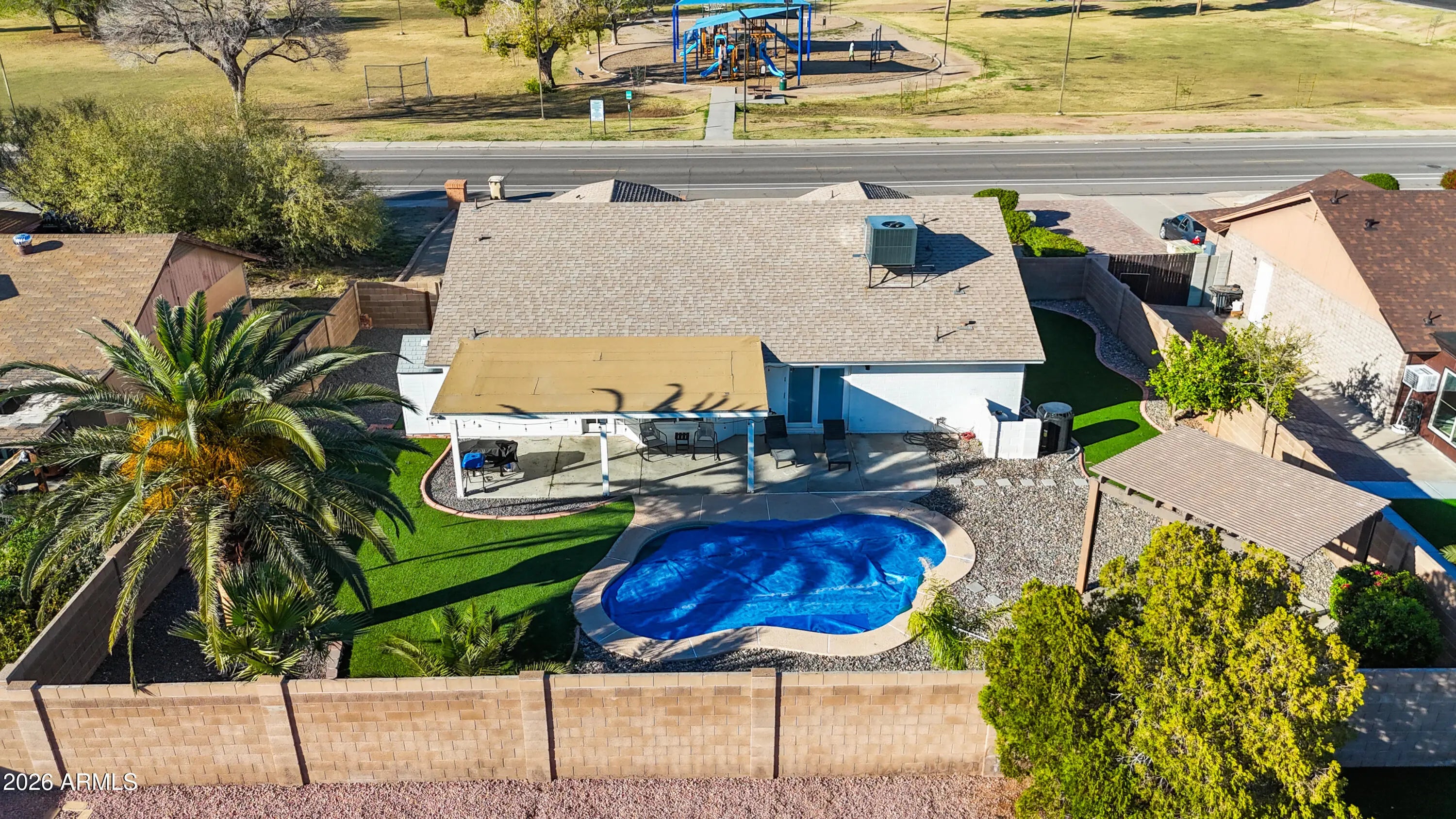 This immaculate, move-in ready, Integra block home offers endless possibilities. Vaulted ceilings and wood look tile flooring in all the right places creates a bright open feel. Spacious living and family rooms provide comfortable everyday living and a space for easy entertaining. The open kitchen includes hard surface countertops, attractive cabinetry, recessed lighting, a breakfast bar, and plenty of counter space. There are three generously sized bedrooms and the spacious fourth room is ideal for an office, gym, or flex room. More than $40,000 in recent upgrades include: pool resurfacing, pool heat pump (Mar 2022), turf landscape upgrade (Nov 2022), new AC unit (Nov 2023), new landscape irrigation system (Aug 2023). Outside you will find a large front yard, an extended driveway (cont) for extra parking, and Sunnyside Park directly across the street. The backyard offers a covered patio, low maintenance landscaping, a free standing cabana, and a heated play pool. Located in a quiet neighborhood with no HOA, this home presents a rare opportunity you won't want to miss.