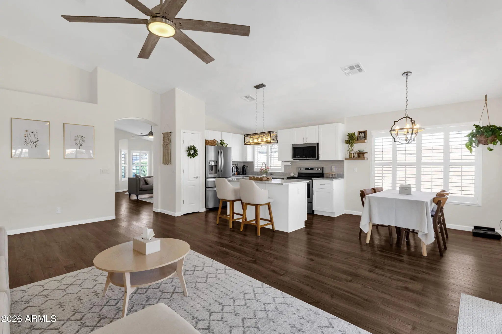 Set in Gilbert's Kristin Manor neighborhood, just minutes from the US-60 and Loop 202, this beautifully maintained single-level home immediately impresses with its charming curb appeal, featuring a classic stucco exterior, tile roof, covered front porch, and a spacious 3-car garage. The formal living room welcomes you with vaulted ceilings and a bright bay window that fills the space with natural light. Double French doors with grid detailing open to a private den/office, ideal for working from home or as a potential bedroom. The heart of the home is the open-concept great room, also highlighted by vaulted ceilings, which flows seamlessly into the kitchen and dining area. The kitchen offers timeless white cabinetry with soft-close doors and drawers, a pantry for added storage, a center island for prep and gathering space, and stainless steel appliances, including a smooth-top electric range. The open layout ensures you're always connected to the main living areas. The primary suite features a raised-panel double-door entry and a light-filled, airy feel. The ensuite bathroom includes a dual-sink vanity and a beautifully finished, glass-enclosed custom tile walk-in shower, creating a comfortable retreat. Two additional bedrooms share a full bathroom with a shower/tub combination, providing flexibility for family or guests. Additional interior highlights include shutters, wood-look laminate flooring throughout, and solar sun screens on all the windows for improved energy efficiency and comfort. Thoughtful architectural details, including arched doorways and decorative niches, add character to the home. The three-car garage features an epoxy-coated floor and built-in shelving for extra storage. Step outside to a spacious backyard designed for relaxation and enjoyment. A covered patio overlooks a grassy area, offering the perfect setting for gatherings. Enjoy peaceful morning sunrises and shaded evenings in this private outdoor space, complete with block fencing. This move-in ready home combines thoughtful upgrades, functional living spaces, and an unbeatable Gilbert location.