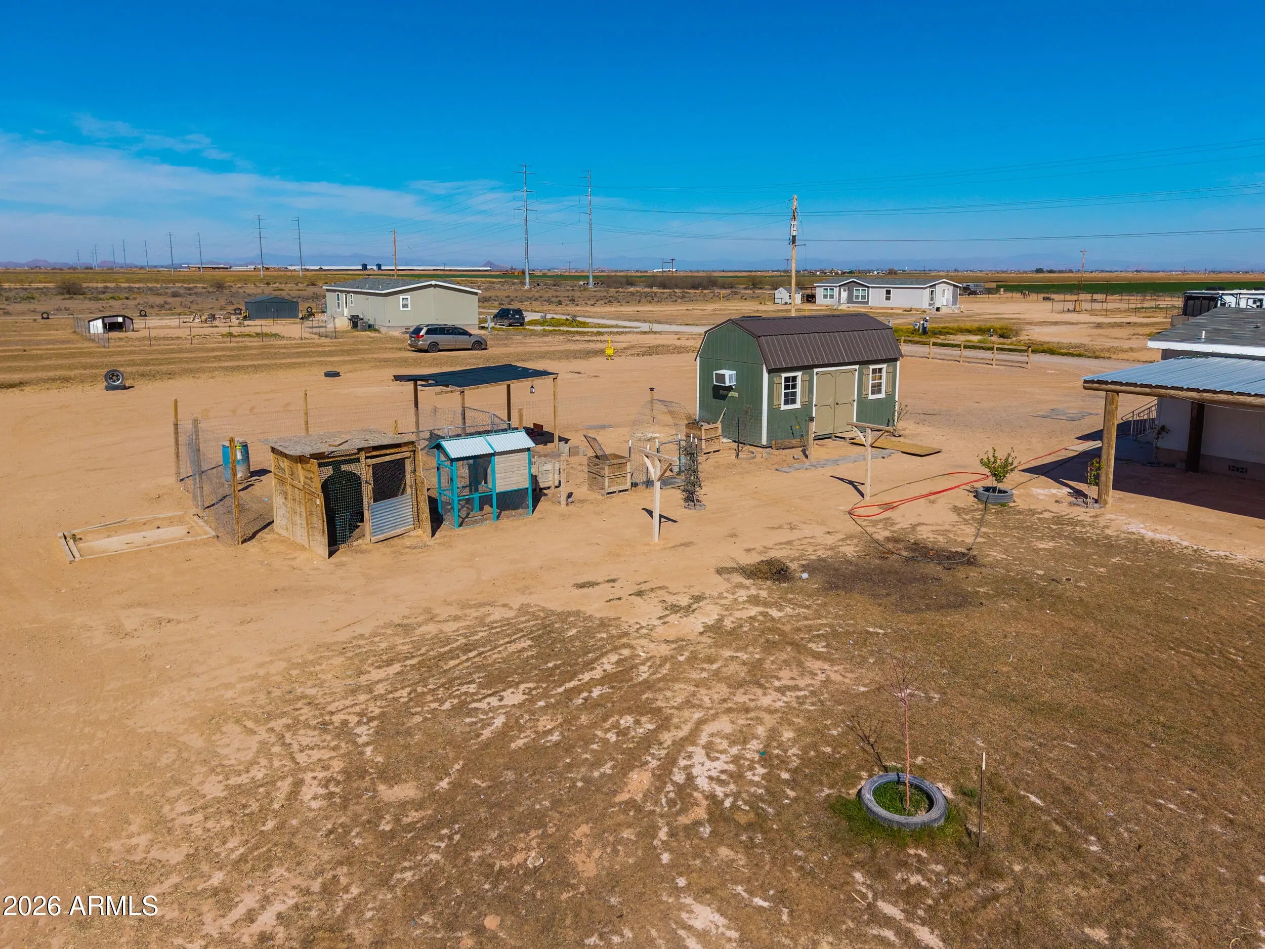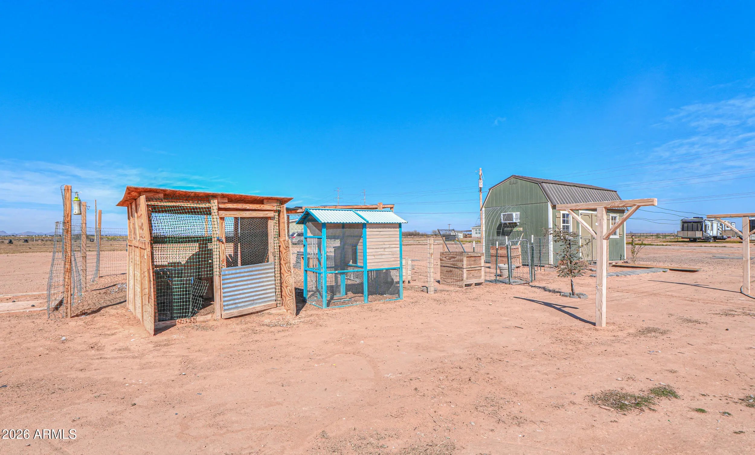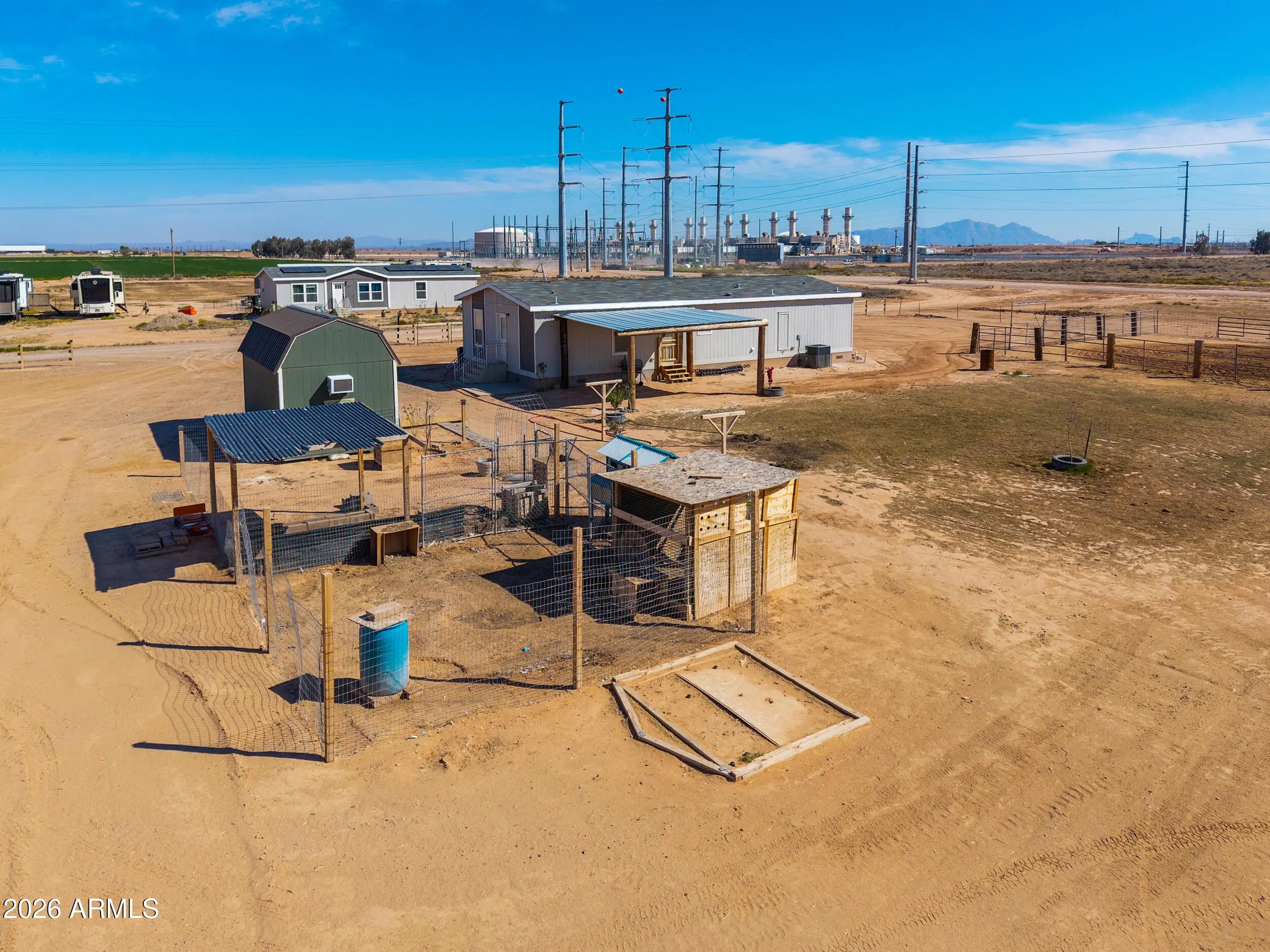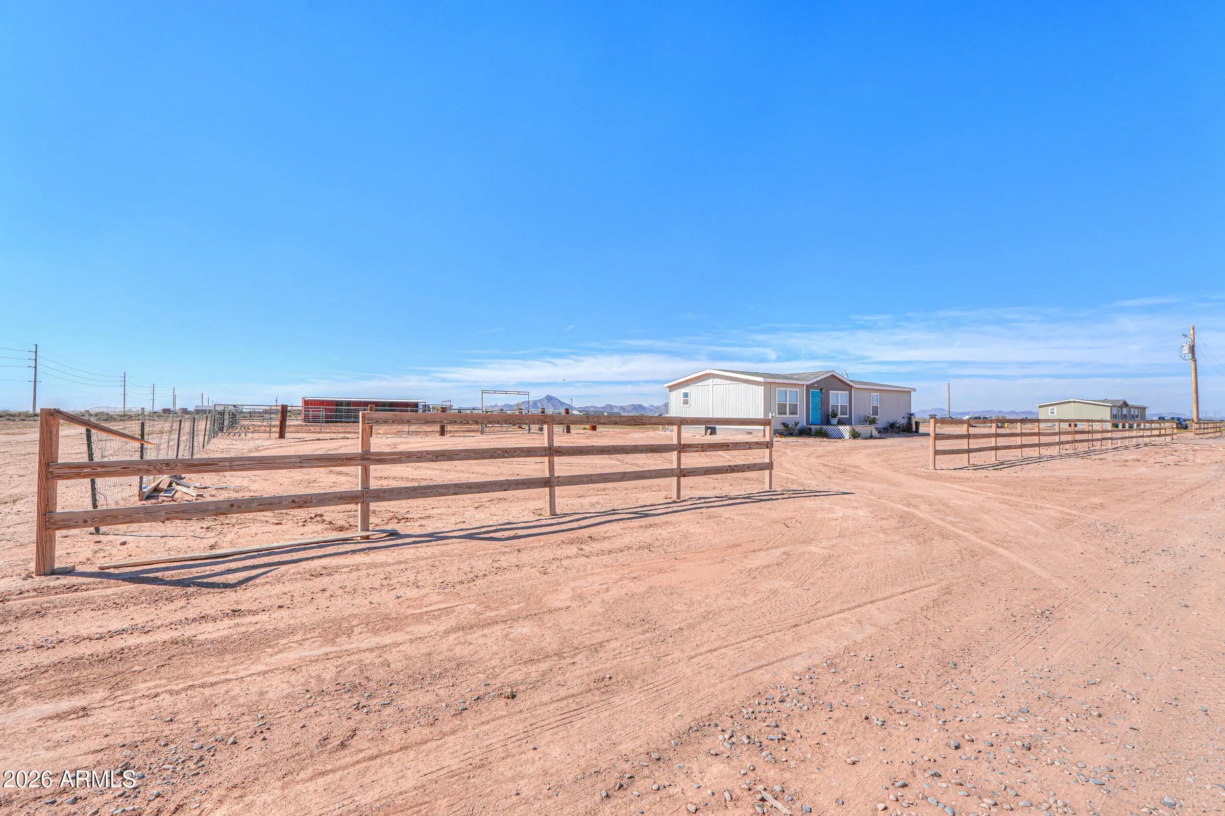 Beautiful 3-bedroom, 2-bath home built in 2023 on 1.25 acres with no HOA! This thoughtfully designed split floor plan offers modern finishes and an open, inviting feel. The spacious kitchen features an oversized island, stylish backsplash, reverse osmosis system, and light oak shaker-style cabinets. Secondary bedrooms are generously sized, and the guest bath includes extended vanity space and storage. The bright primary suite offers a double-sink vanity and large walk-in closet. Enjoy rural living with a chicken coop, horse arena and stalls with attached tack room, 12x20 lofted barn, hay shade, and covered patio with stunning sunset views.
