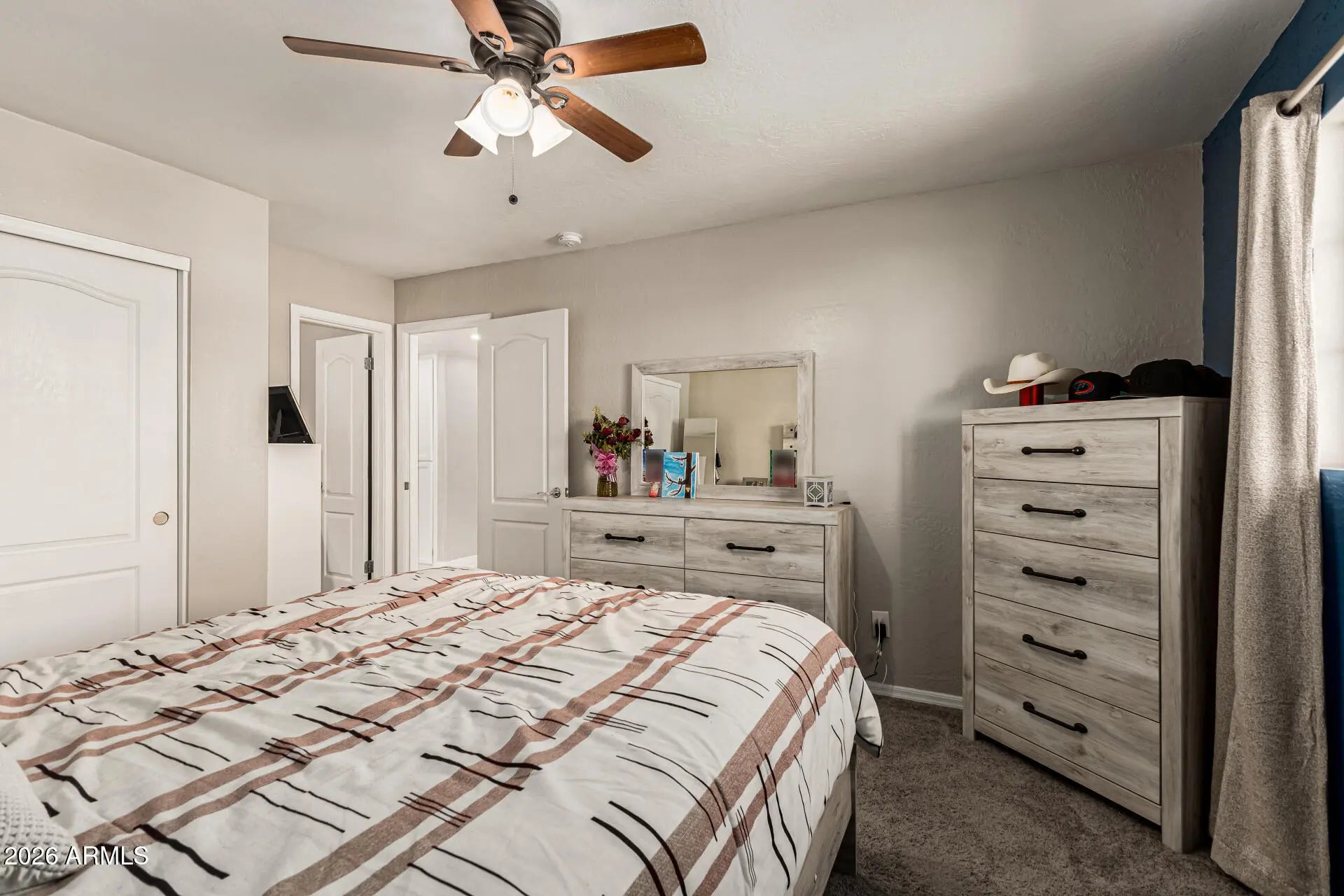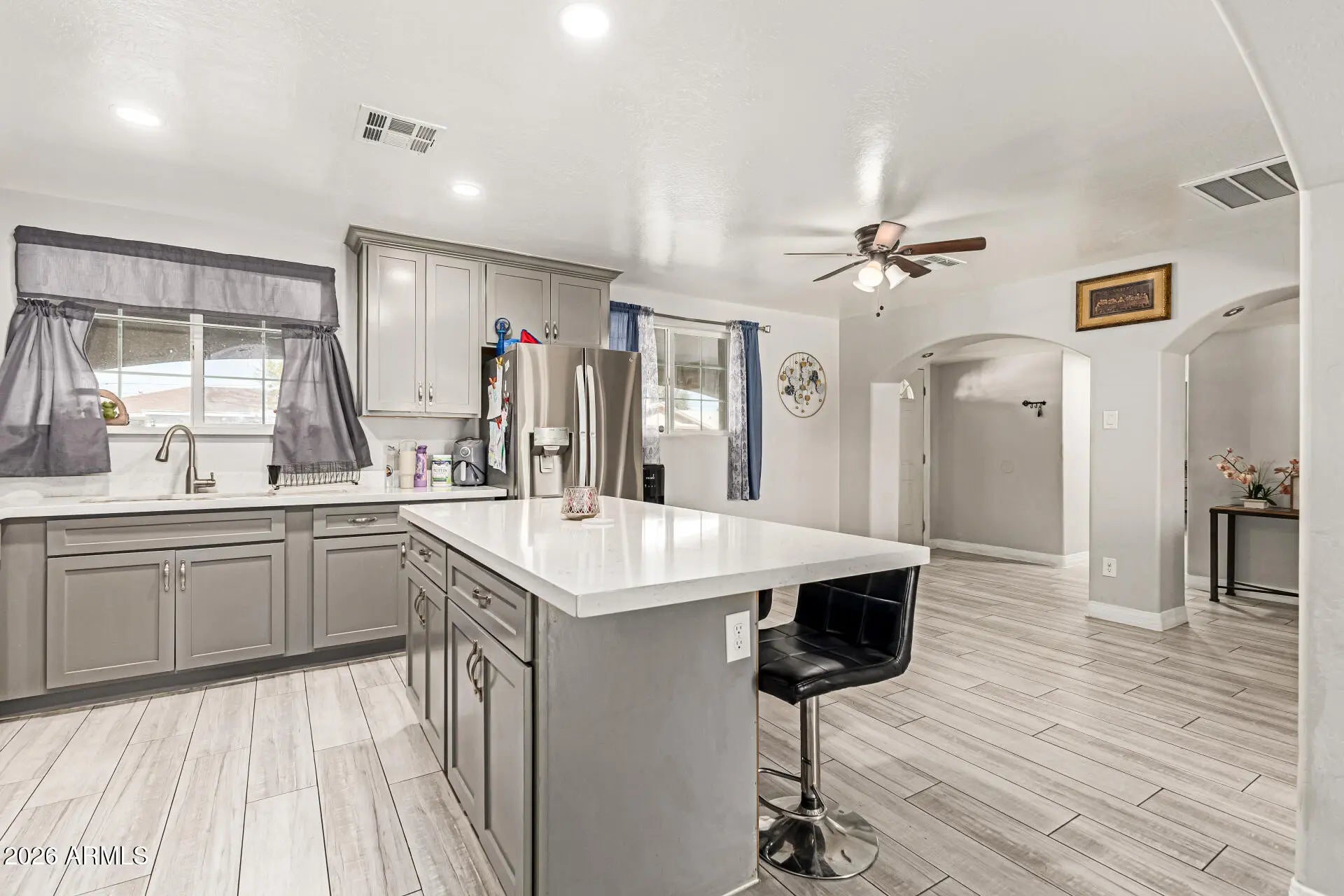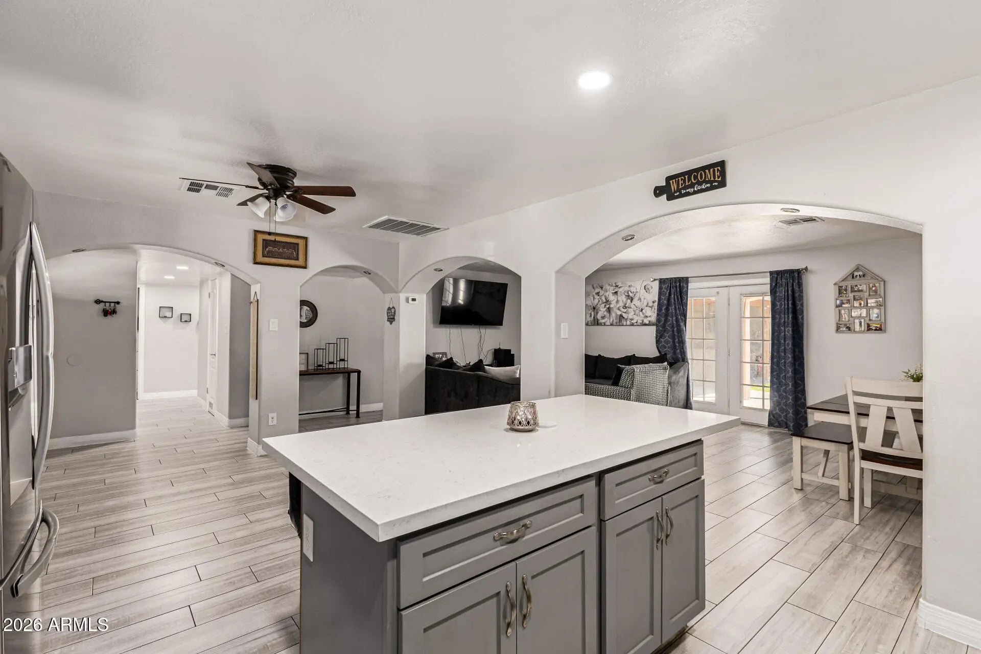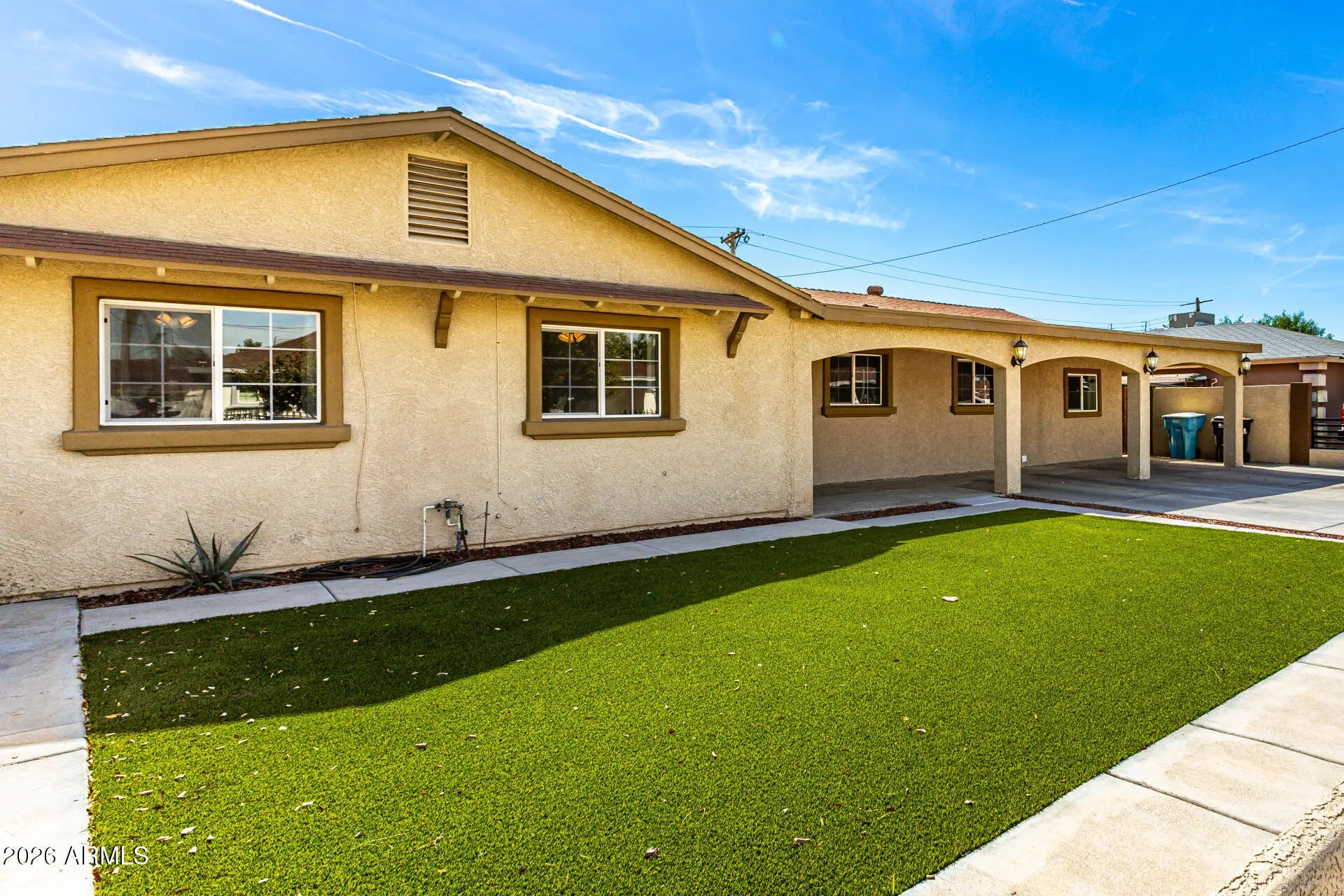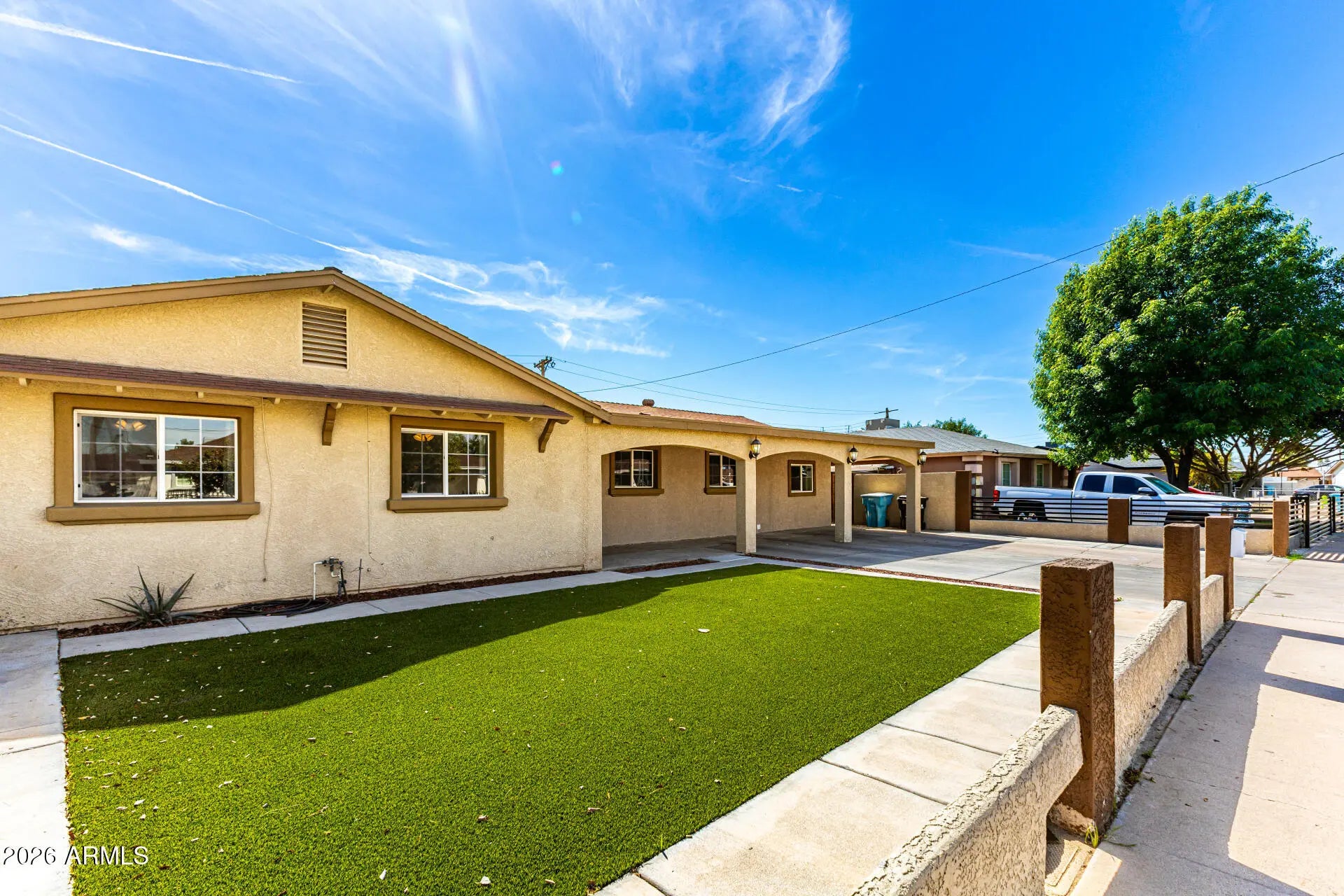 Don't miss this charming, spacious single-level home in Phoenix! Displaying a large front yard with a front porch, driveway parking, and a synthetic lawn. The inviting interior showcases tons of natural light, a designer palette, and soft carpet & wood-look tile flooring throughout. You'll love the semi-open layout, which perfectly balances privacy & connectivity! French doors merge the inside & outside activities. The impressive kitchen boasts SS appliances, quartz counters, gray shaker cabinetry, recessed lighting, and an island w/breakfast bar. The main bedroom has a private bathroom for added comfort. Enjoy relaxing or gatherings in the sizable backyard! A covered patio, artificial turf, lush lawn, built-in BBQ, Ramada, storage shed, & RV gate complete the picture. Make this gem yours!