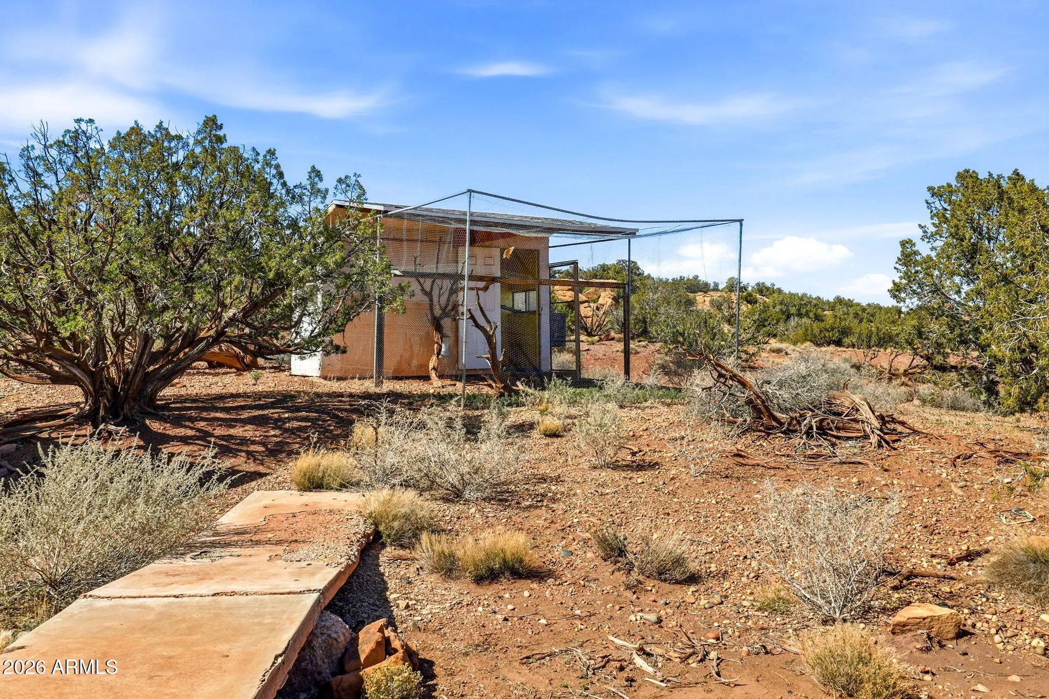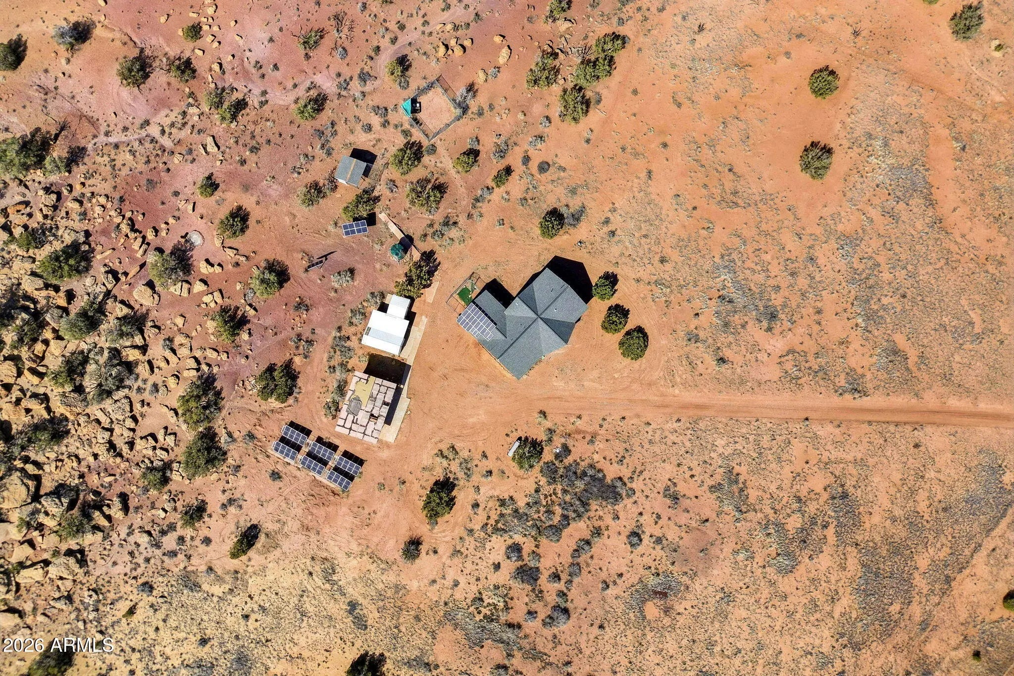 Located approx. 20 miles from Snowflake, this 44-acre property offers breathtaking views and dramatic rock formations to the west. The upgraded solar system includes 24 x 800-watt panels, two 6,500-watt inverters, six lithium-ion batteries, and a 9,000-watt backup generator. The well features a newer solar pump, 2,500-gallon storage tank, jet pump, and pressure tank. The home offers a spacious great room, two bedrooms, two baths, and an attached one-car garage. Two storage sheds, a large open workshop, and dog runs add versatility. Fenced to the rock outcroppings. Enjoy four seasons at 5,700 ft elevation. Internal photos will be added by 2/24/26