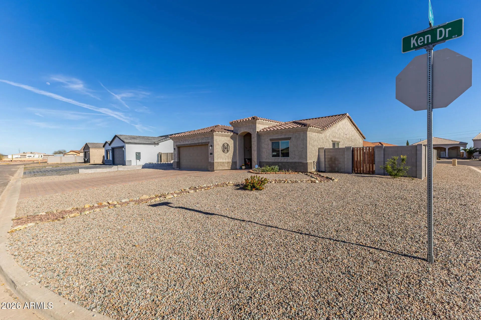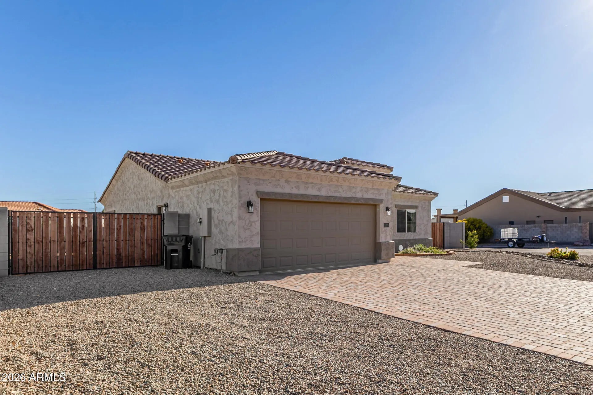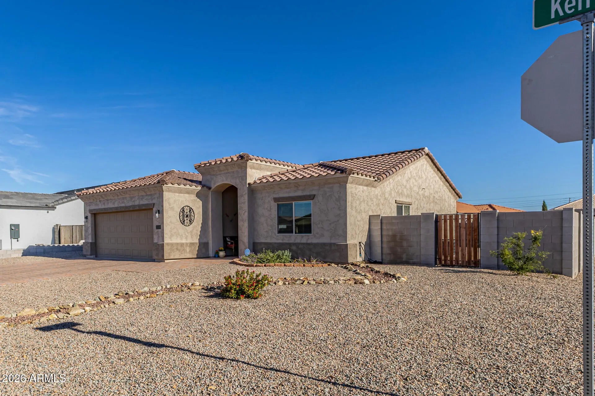 Impressive corner lot home in Arizona City with a wide paver driveway, arched entry, and tile roof. The open great room flows into a white shaker kitchen with a quartz island, stainless steel appliances, and pendant lighting. The primary suite features a double vanity, tiled walk-in shower, and a walk-in closet. Wood-look tile throughout main areas. The fully block-walled backyard is a standout, offering a covered patio, fire pit area, and room to add a pool. N/S exposure. 2-car garage. This one shows!