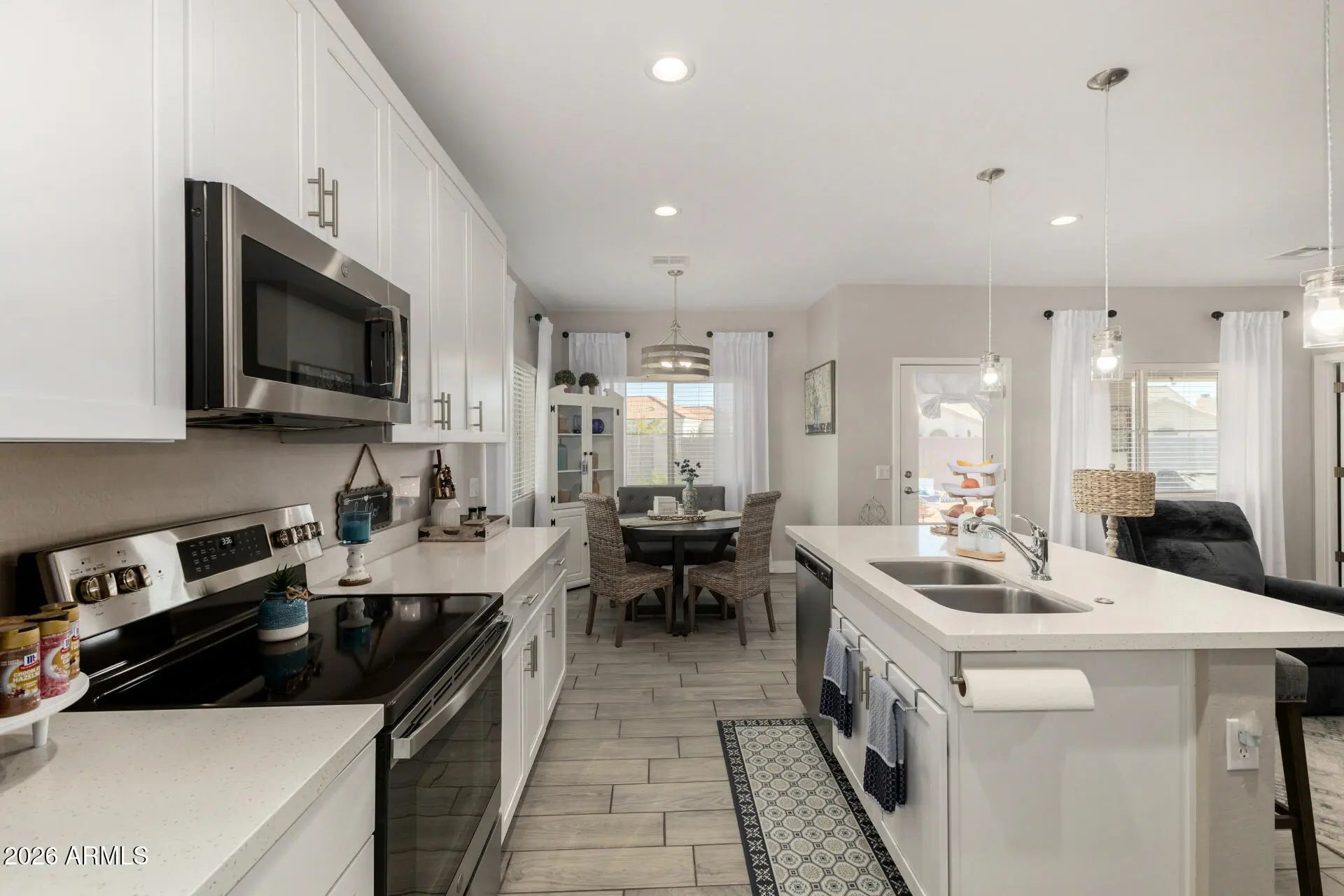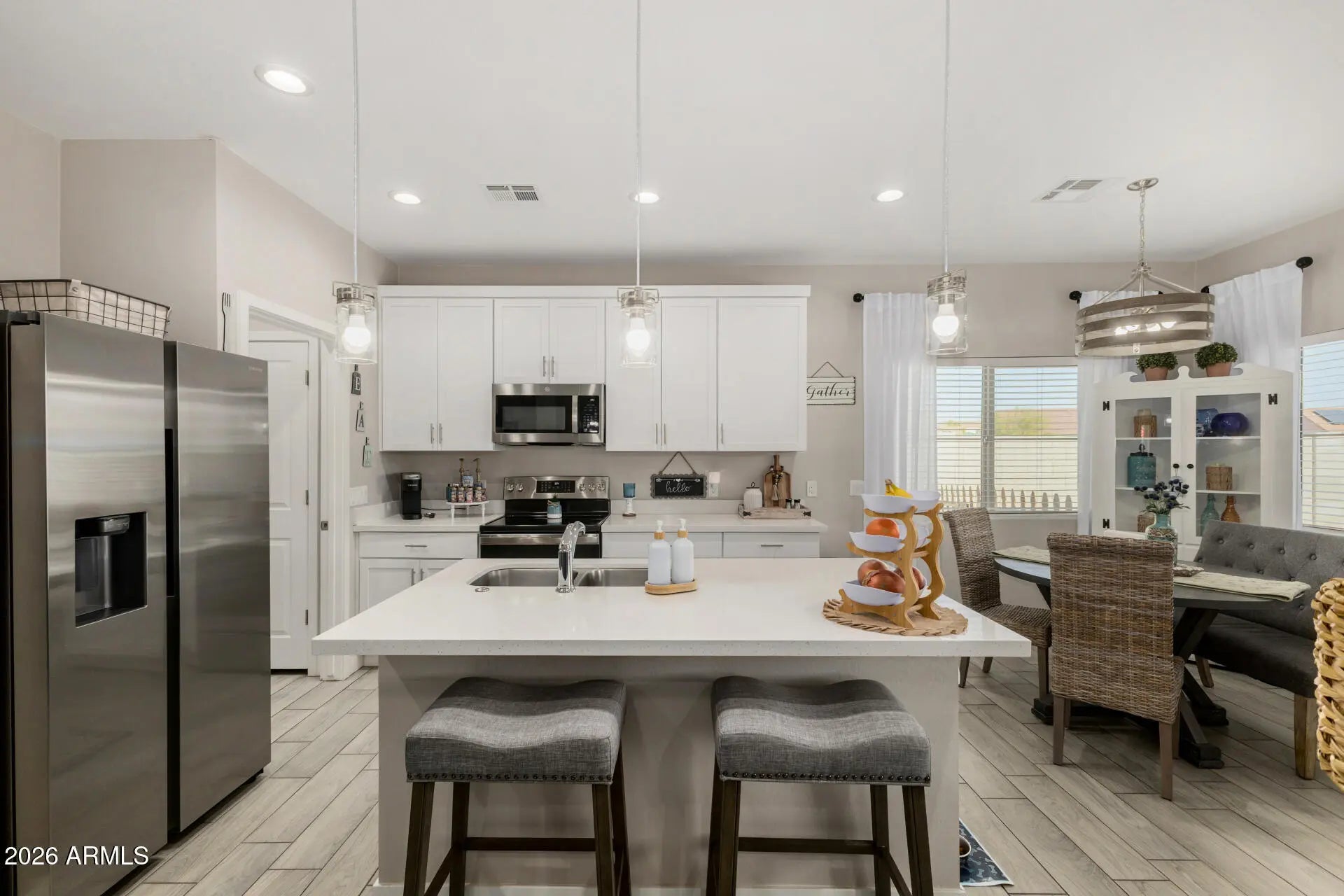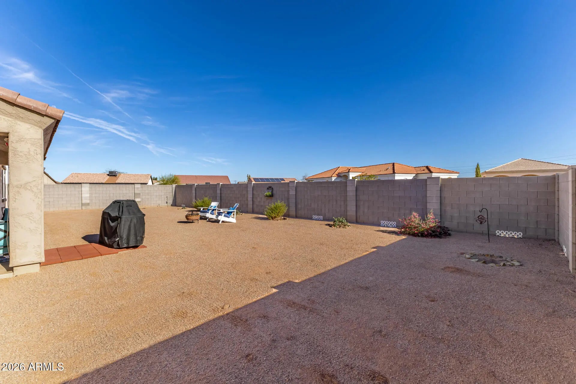 Impressive corner lot home in Arizona City with a wide paver driveway, arched entry, and tile roof. The open great room flows into a white shaker kitchen with a quartz island, stainless steel appliances, and pendant lighting. The primary suite features a double vanity, tiled walk-in shower, and a walk-in closet. Wood-look tile throughout main areas. The fully block-walled backyard is a standout, offering a covered patio, fire pit area, and room to add a pool. N/S exposure. 2-car garage. This one shows!