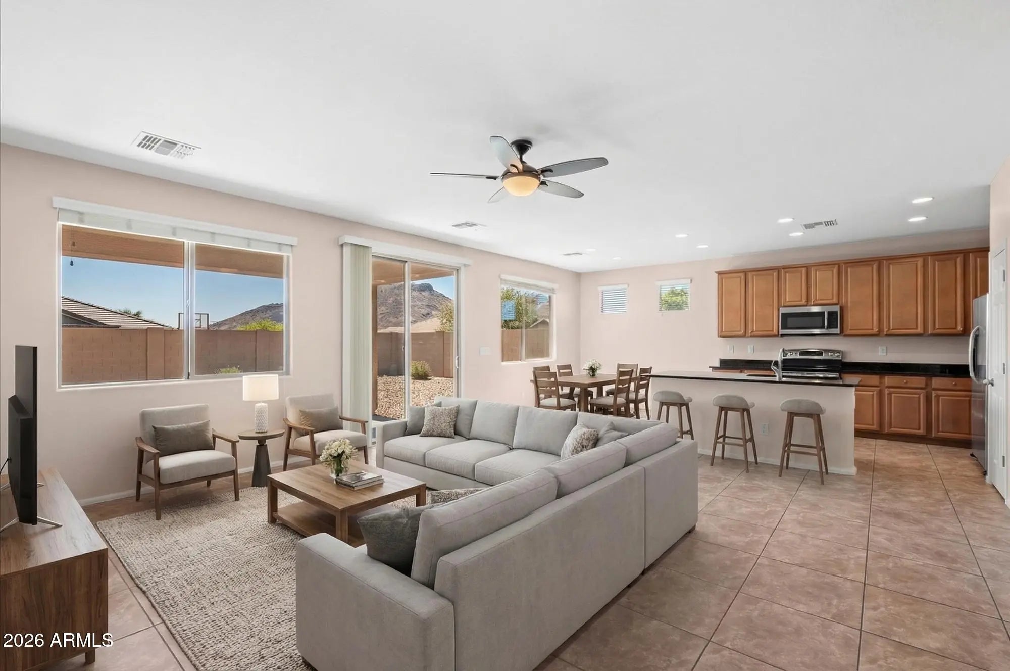 Welcome to this beautifully maintained North Phoenix home in the sought after Stetson Valley community featuring a bright, open concept floor plan designed for comfortable everyday living and effortless entertaining. The expansive windows invite in natural light and frame surrounding mountain views. The kitchen features granite countertops, SS appliances, generous cabinetry, and seamless flow to the covered patio, perfect for enjoying Arizona evenings. The spacious primary suite includes a dual sink vanity, extended counter space, a full bath, and a large walk in closet. Desert landscaping enhances curb appeal with low maintenance ease. Ideally located near parks, pickleball courts, soccer fields, Deem Hills Recreation Area, shopping, dining, freeway access, and the TSMC campus.