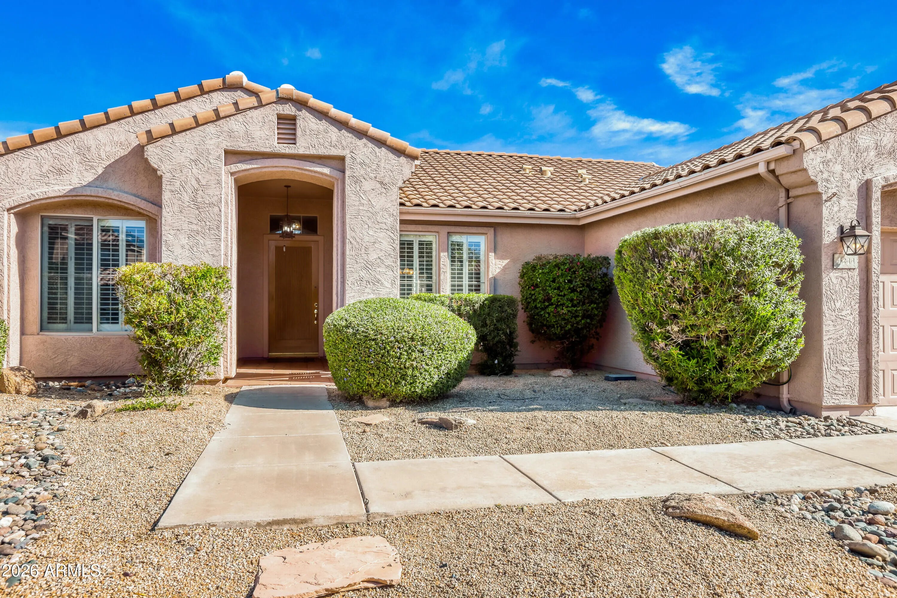 This 3 bedroom 2 bath single level home is located in one of North Phoenix's most desirable communities: Desert Ridge. Perfectly situated near High Street, Desert Ridge Marketplace, JW Marriott Wildfire Golf Club, dining, shopping, top-rated schools, park and easy access to 101/51 freeways. Outside, enjoy a quiet, low-maintenance oversized backyard with inviting swimming pool, large covered patio with plenty of room to dine, unwind, and entertain. Inside you'll find plantation shutters throughout, a large great room with dramatic vaulted ceilings and gas fireplace. The adjacent eat-in kitchen has stainless steel appliances, gas stove and granite counter tops. Split from the other bedrooms, the primary suite includes a walk-in closet and remodeled bath. 2 car garage offers extra storage.